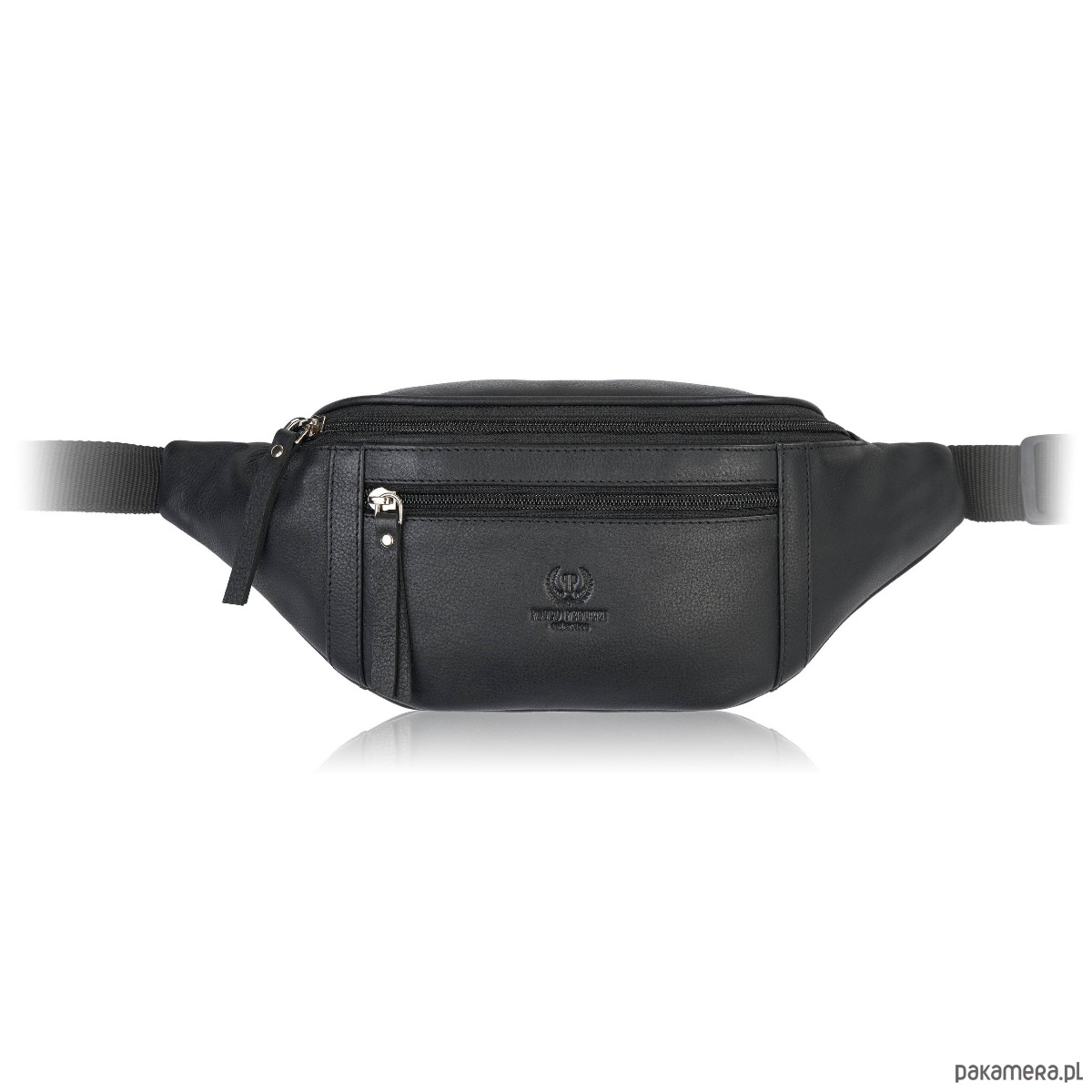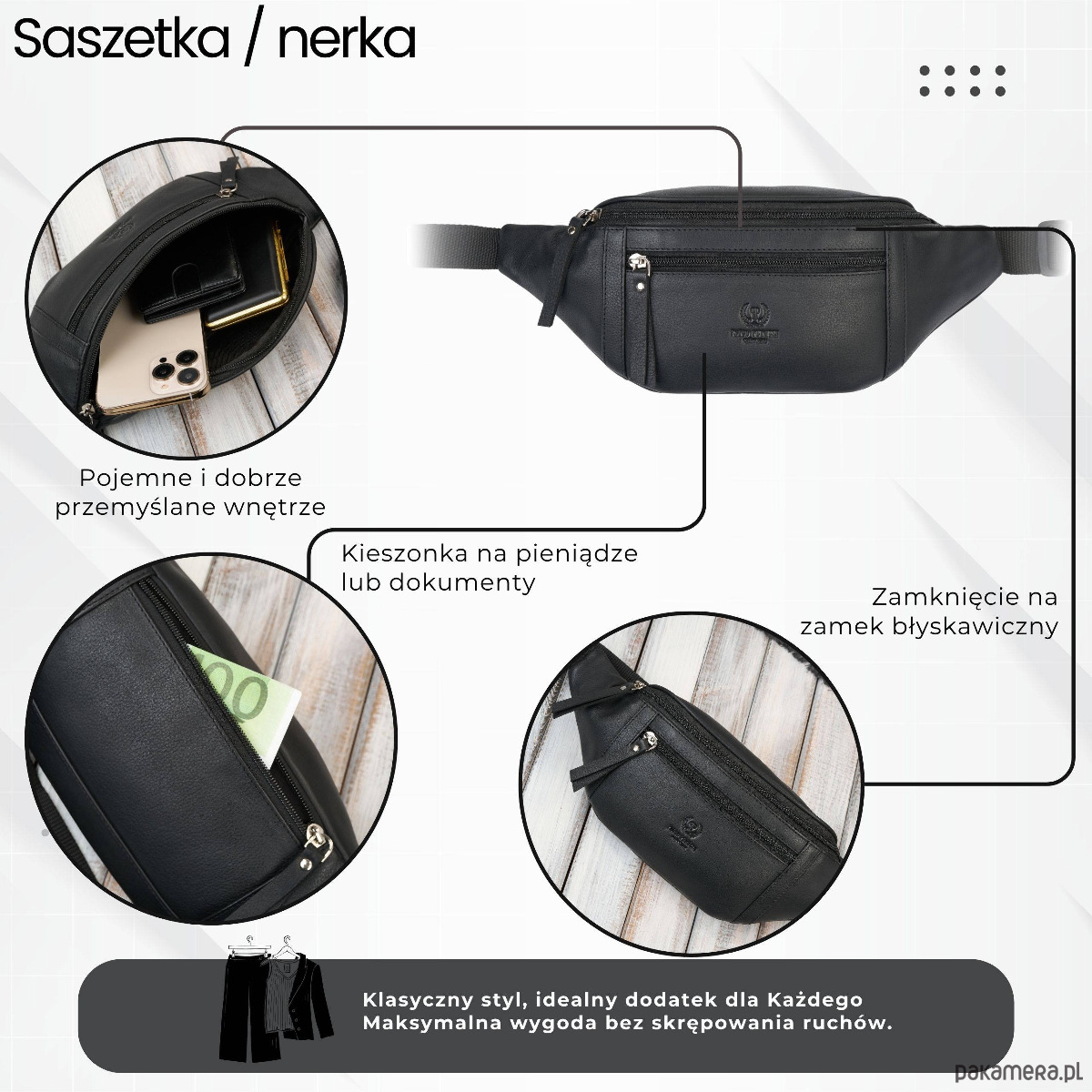 Minimalistyczna forma, czarny kolor oraz srebrne okucia podkreślają klasyczny charakter modelu. Saszetka posiada trzy kieszenie na zamek błyskawiczny, co zapewnia najwyższy poziom bezpieczeństwa przechowywanych rzeczy. Dodatkowa tylna kieszeń idealnie sprawdzi się na gotówkę i dokumenty, gwarantując pełną dyskrecję i ochronę. To saszetka skórzana na pas, która została zaprojektowana tak, aby nie ograniczać ruchów i zapewniać maksimum komfortu. Regulowany pasek pozwala dopasować nerkę do sylwetki i nosić ją zarówno klasycznie w pasie, jak i przez ramię, zgodnie z aktualnymi trendami.