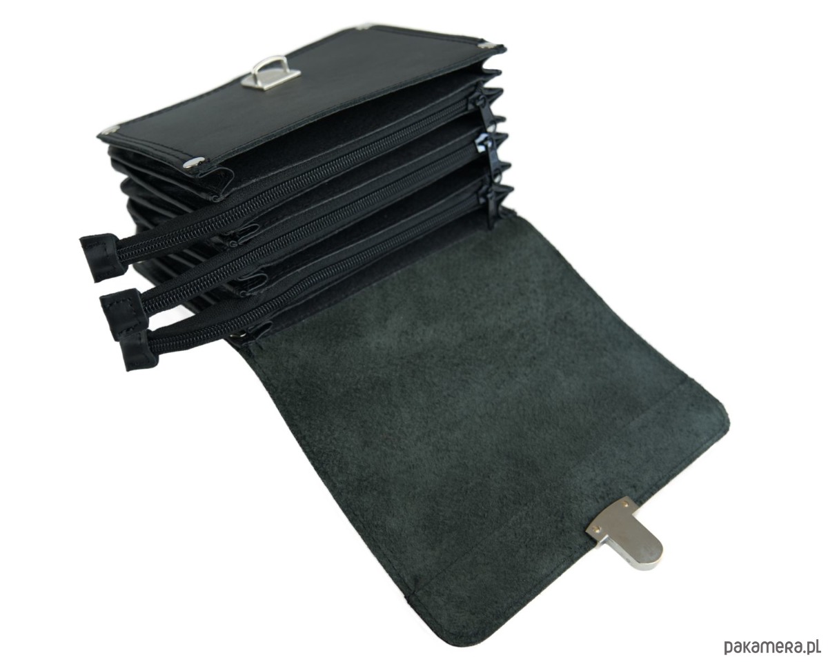 Saszetka uszyta bezpośrednio przez firmę Stefania, producenta galanterii z 30 letnim doświadczeniem. Wykonana ze skóry naturalnej, grubej, matowej. Całość zamykana klapą na zapięcie typu tik-tak. We wnętrzu znajdują się trzy kieszenie na zamek błyskawiczny oraz trzy przegrody.