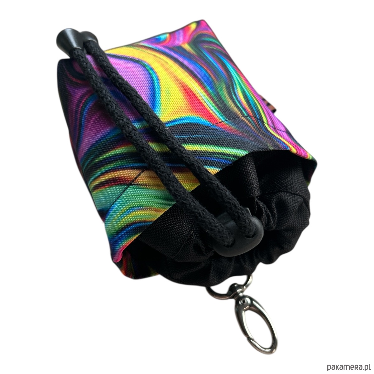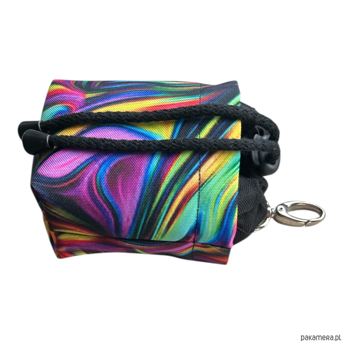 Ma solidny karabińczyk, dzięki któremu odczepisz saszetkę do spodni czy torebki.