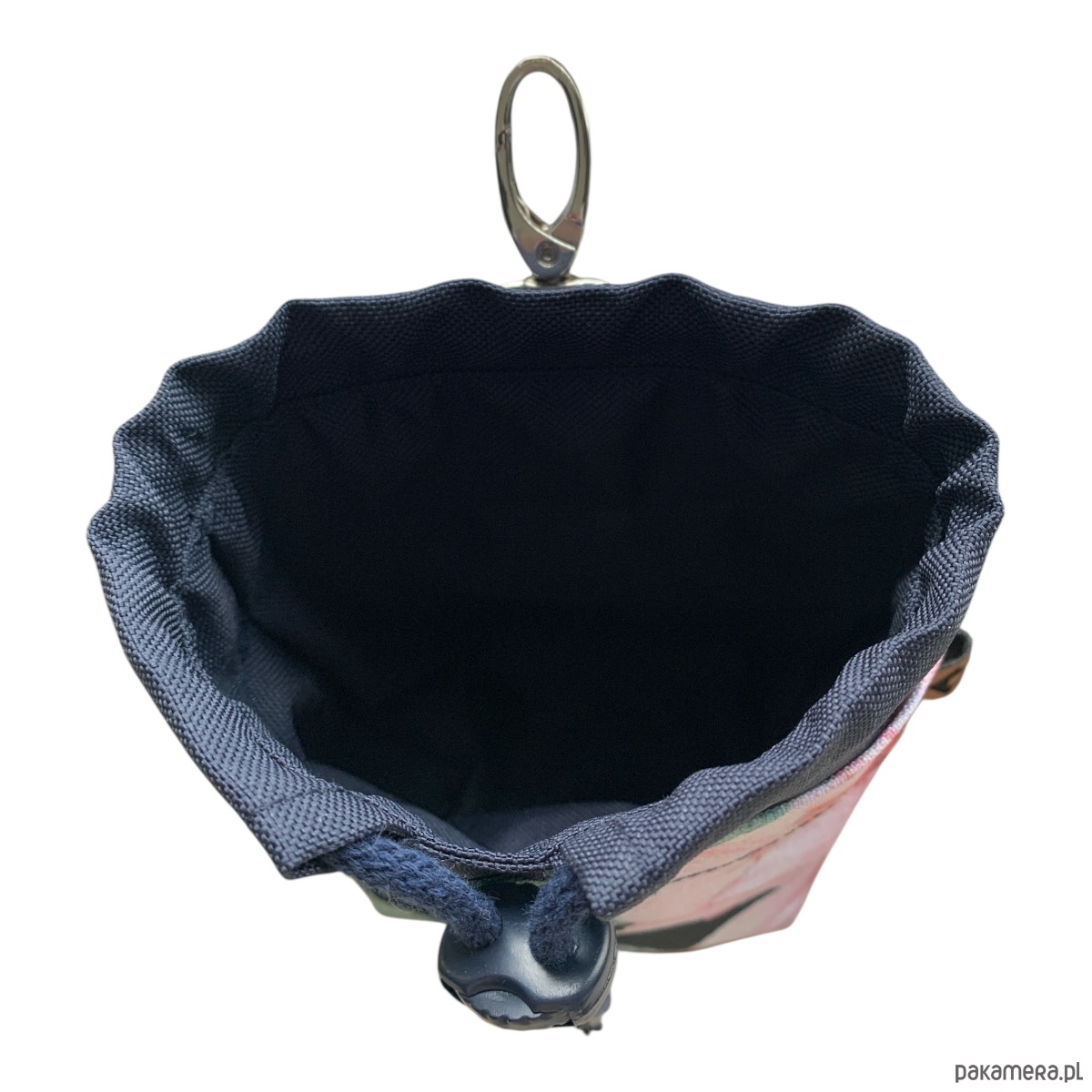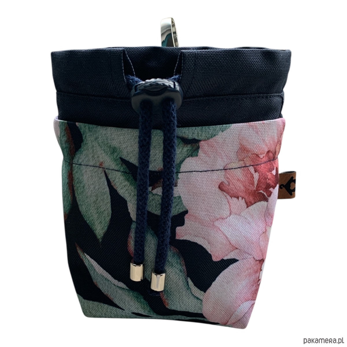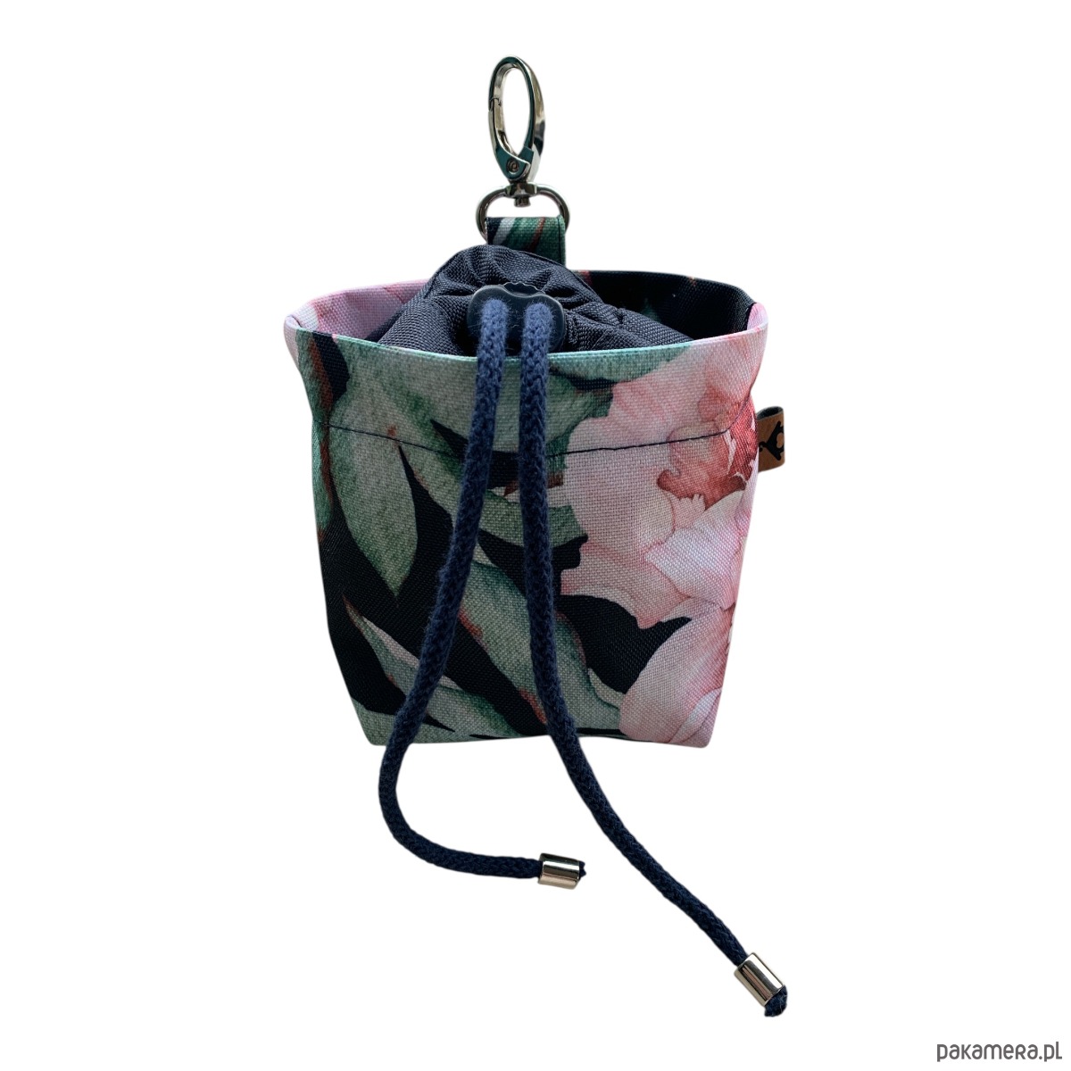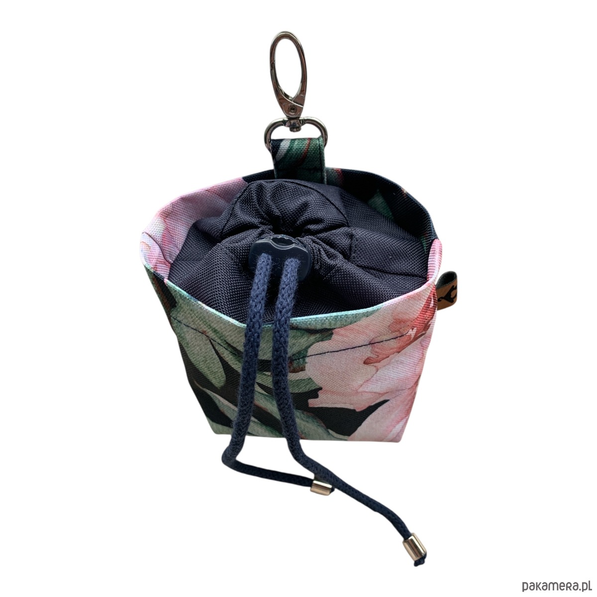 Saszetka na przysmaki dla psa uszyta z wodoodpornego poliestru. Z zewnątrz kolorowy wzór w piwonie na granatowym tle, środek jednolity granatowy.