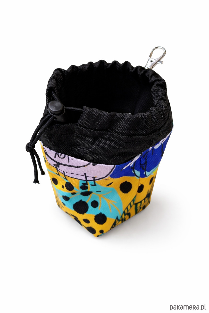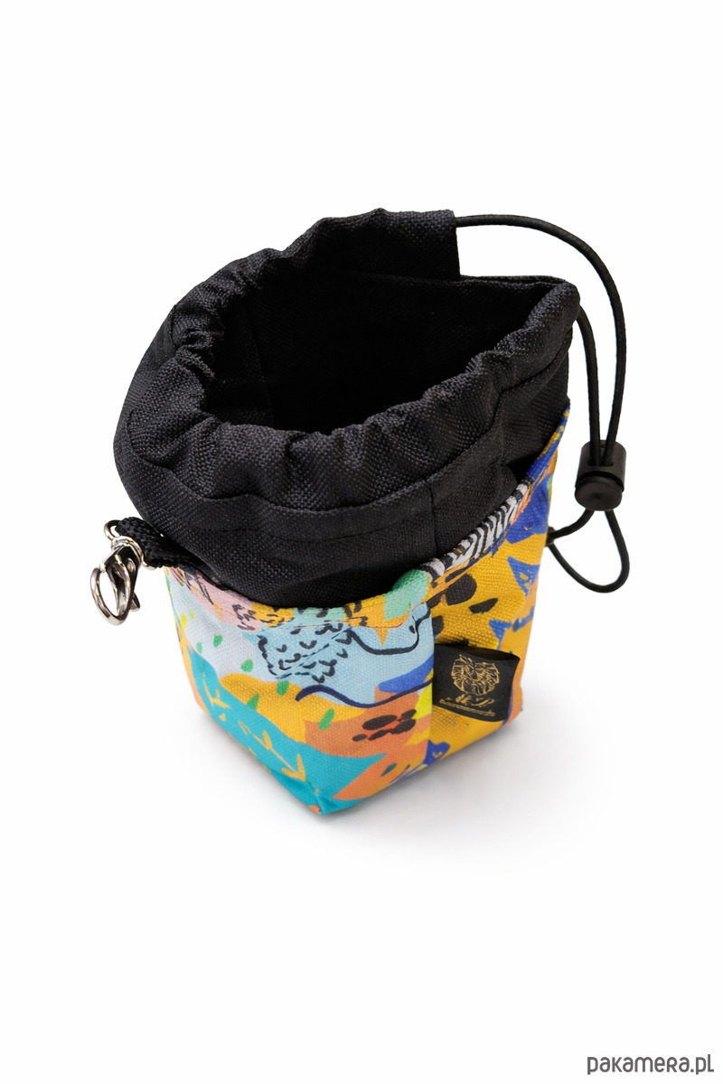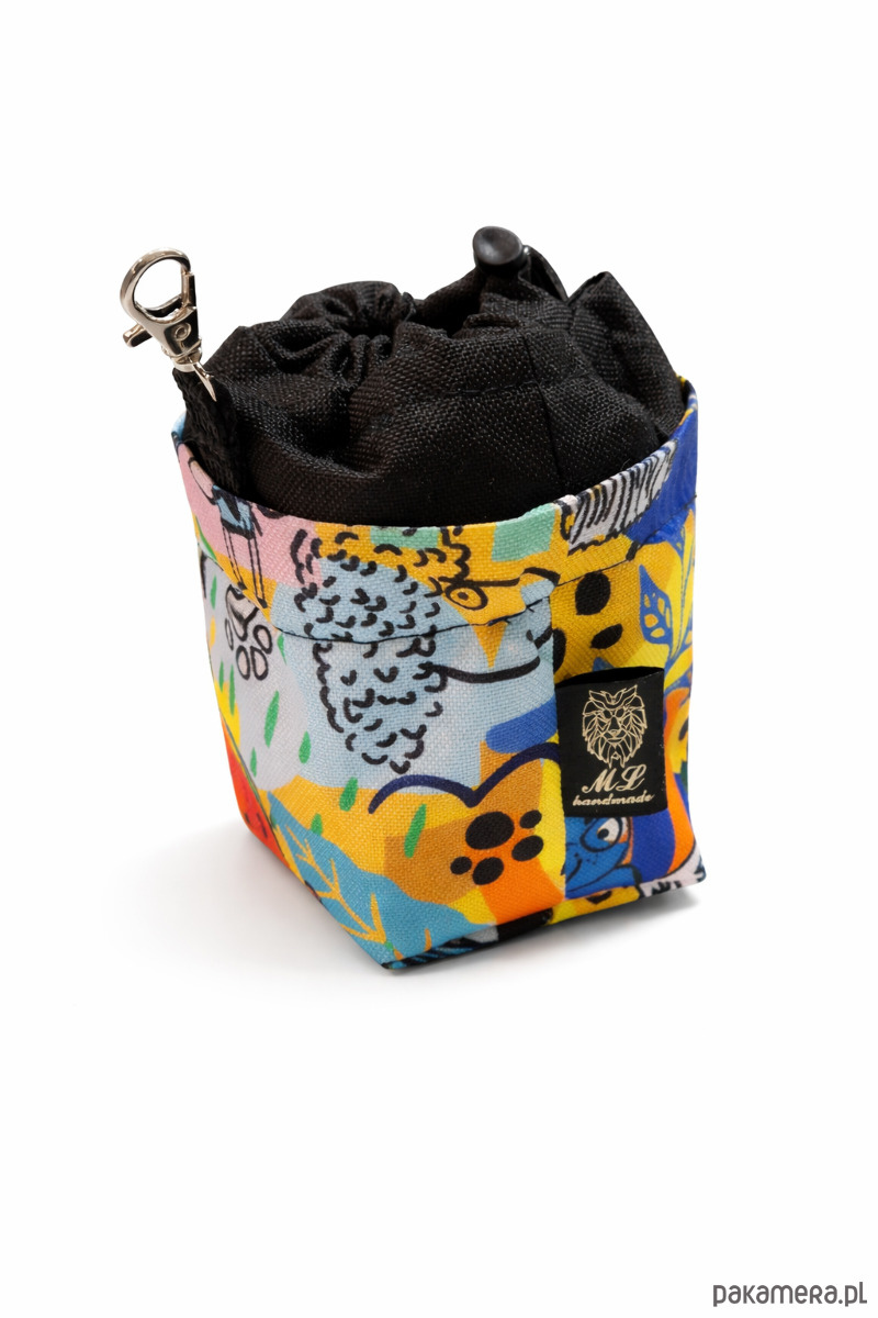 Kolorowa saszetka na psie smaczki, wykonana z wytrzymałej tkaniny wodoodpornej.
