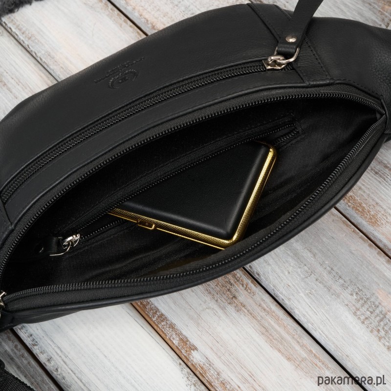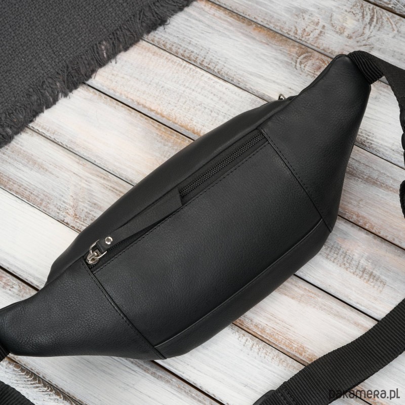 Minimalistyczna forma, czarny kolor oraz srebrne okucia podkreślają klasyczny charakter modelu. Saszetka posiada trzy kieszenie na zamek błyskawiczny, co zapewnia wysoki poziom bezpieczeństwa przechowywanych rzeczy. Dodatkowa tylna kieszeń idealnie sprawdzi się na gotówkę i dokumenty, gwarantując pełną dyskrecję i ochronę.