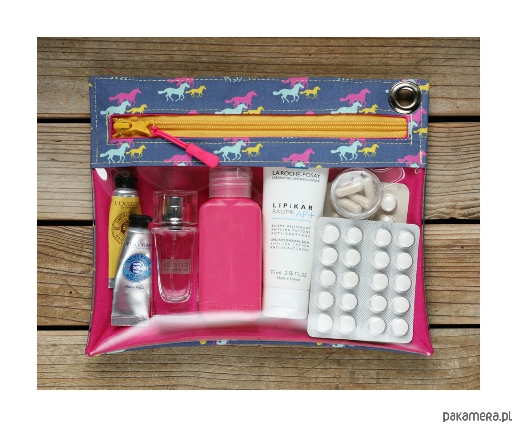 Saszetka wykonana jest z bawełny (wierzchnia strona lekko usztywniona), cienkiej ociepliny polarowej i miękkiej, przeźroczystej folii. Zamykana na zamek błyskawiczny. Posiada metalowe oczko do zawieszenia na wieszaku. Dzięki folii wystarczy szybki rzut oka na zawartość saszetki i już wiadomo co w niej jest :). Może być na dokumenty podróżne, kosmetyki (idealna na travel size) czy posłużyć jako apteczka na leki. Wym. 25cm x 20 cm.