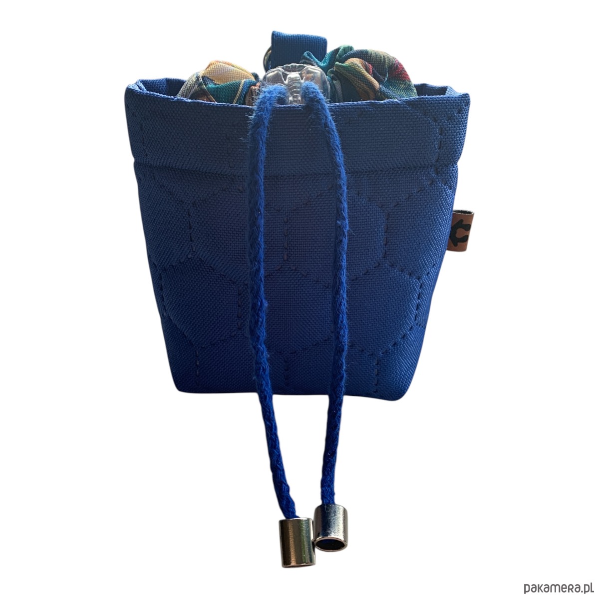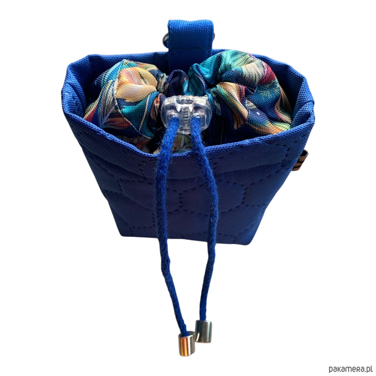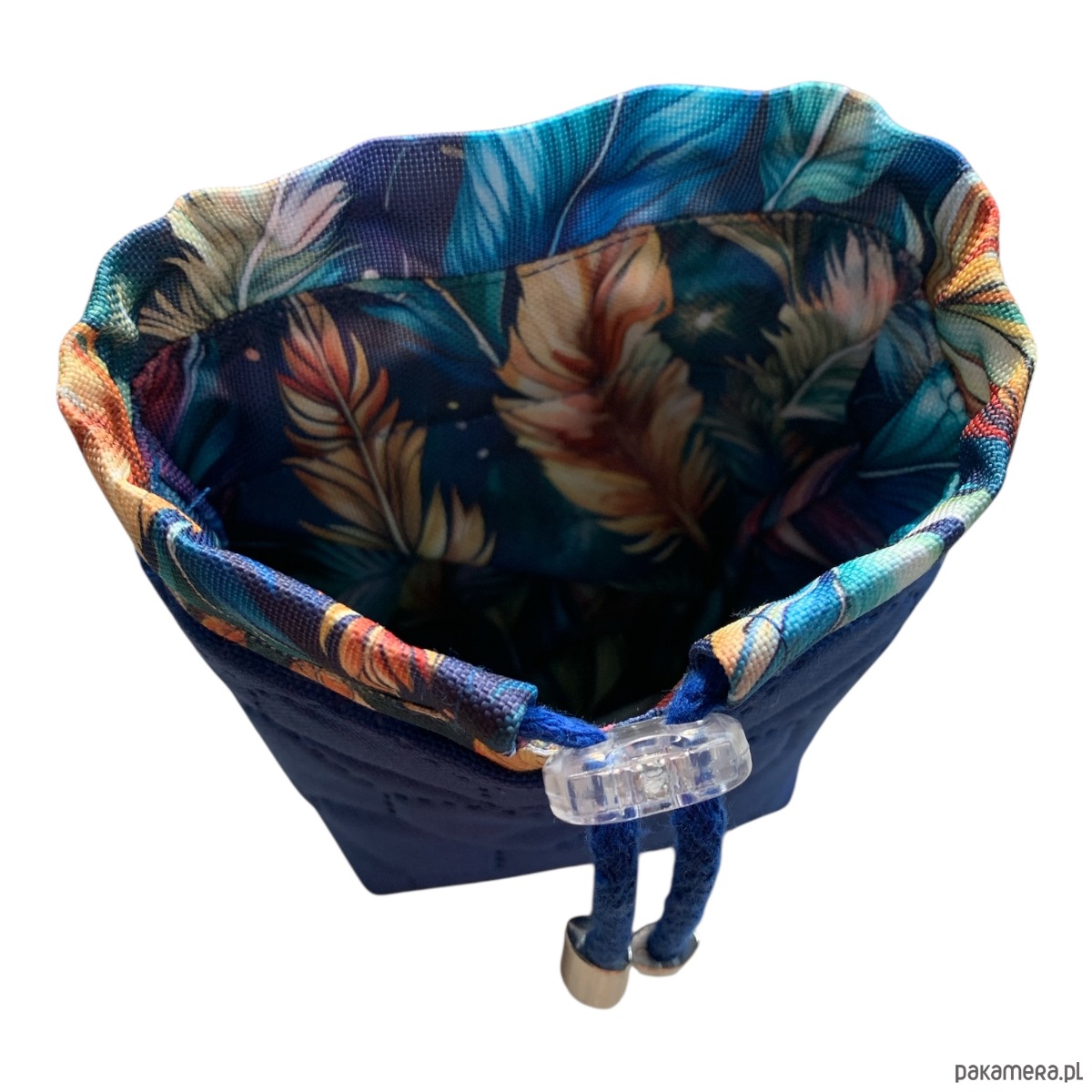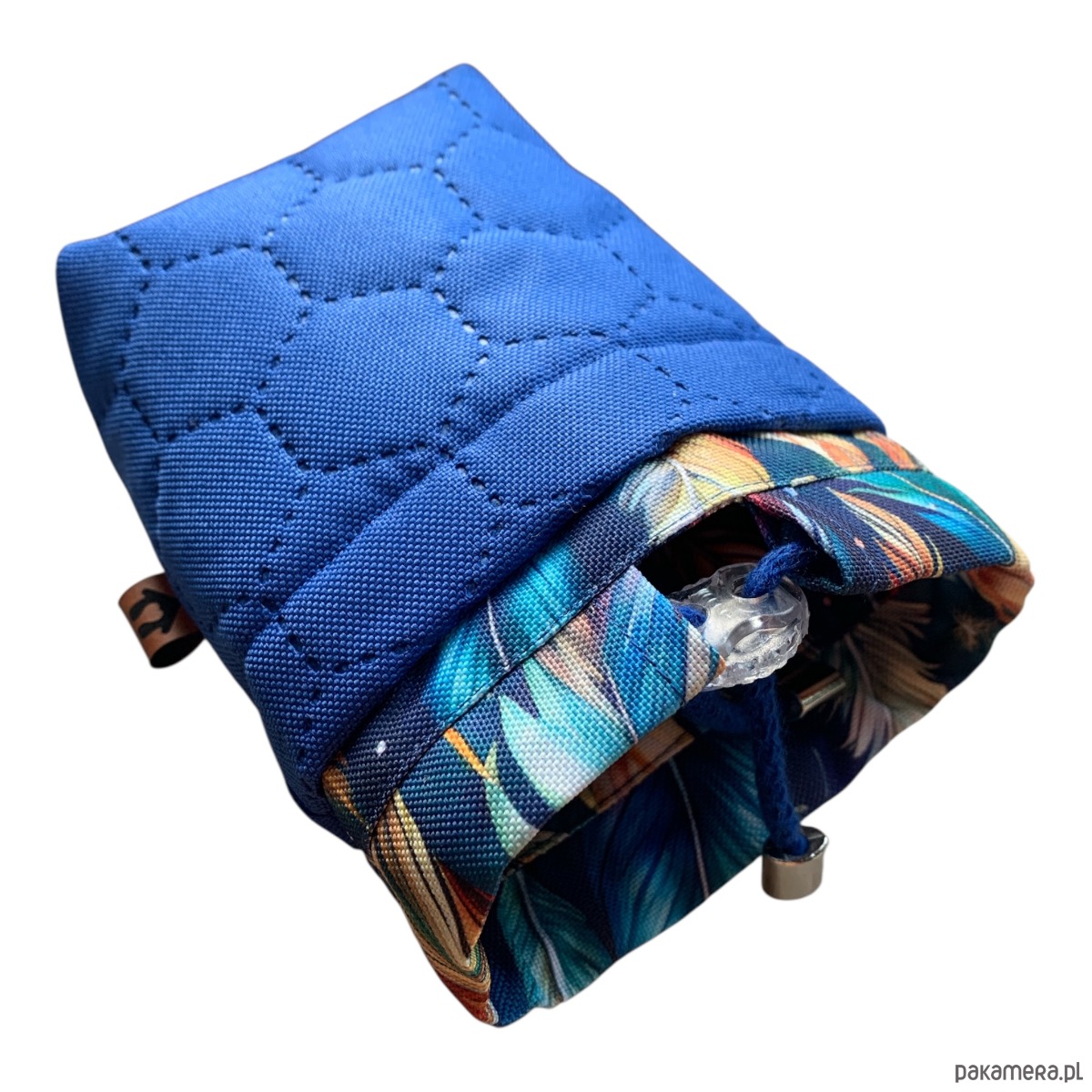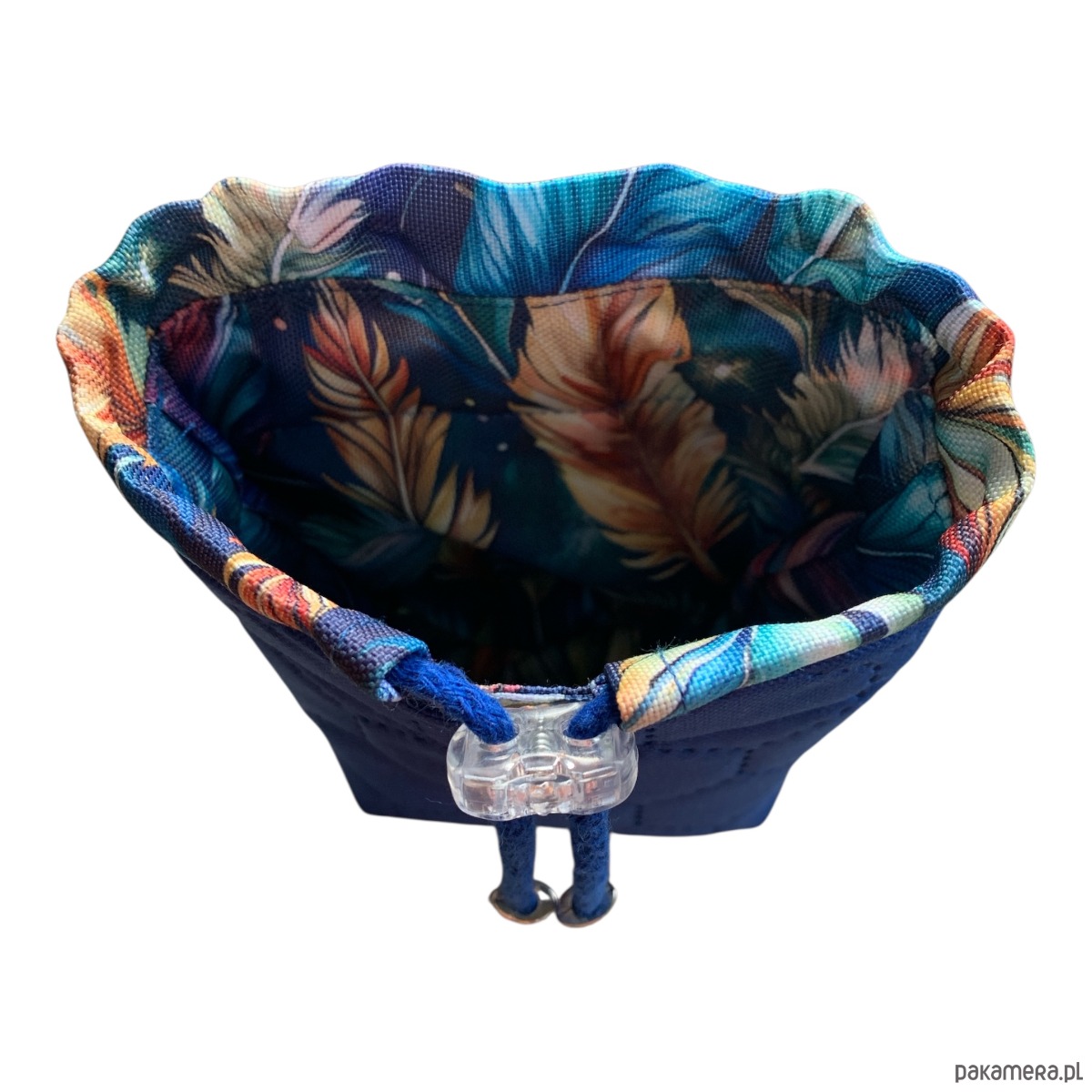 Saszetka na przysmaki dla psa uszyta z wodoodpornego poliestru. Z zewnątrz kolorowy wzór w piwonie na granatowym tle, środek jednolity granatowy.