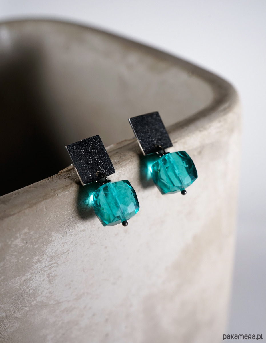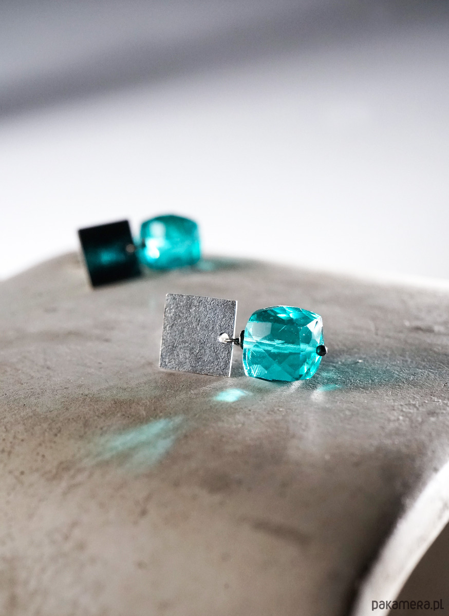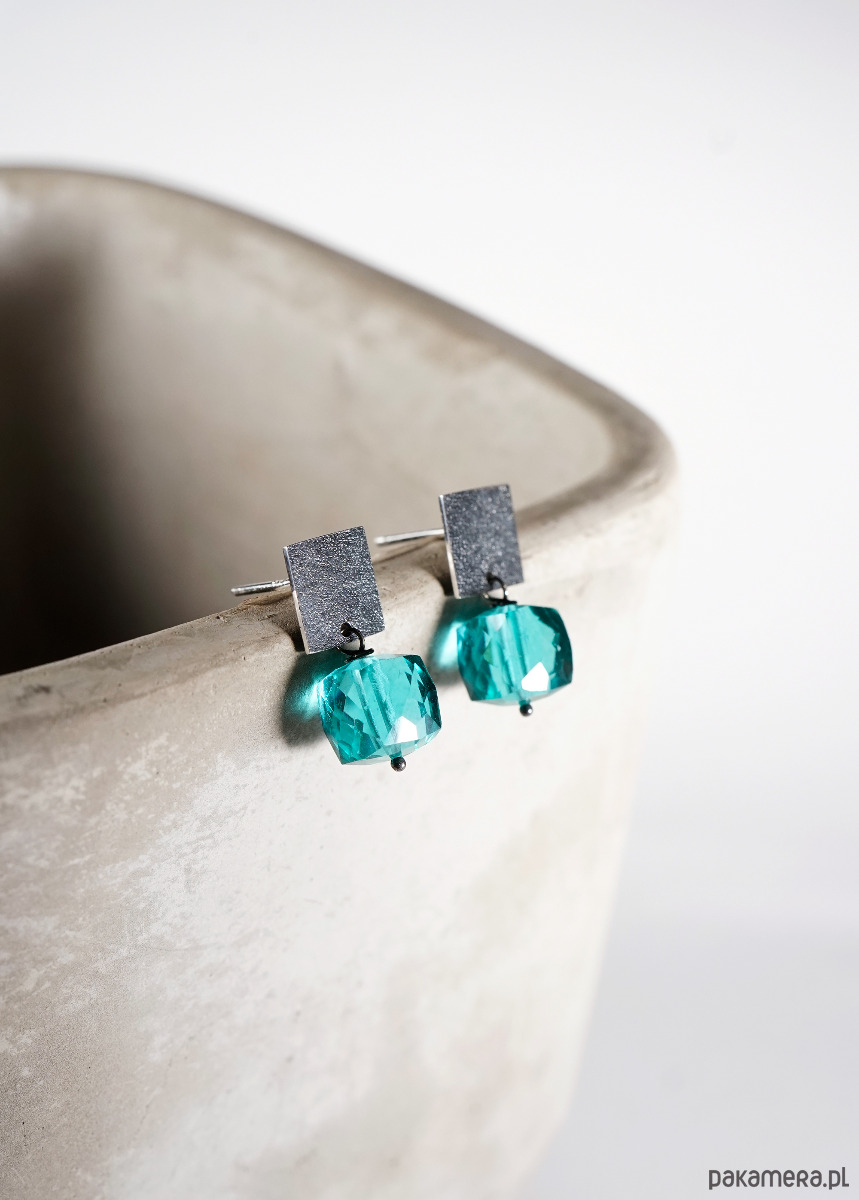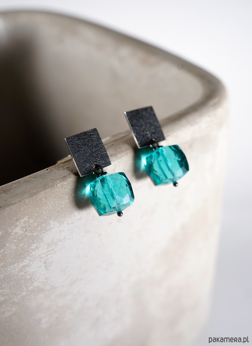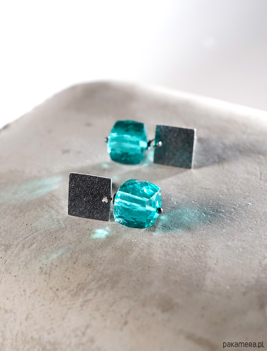 Srebrne, minimalistyczne kolczyki z fasetowanymi kostkami kwarcu.