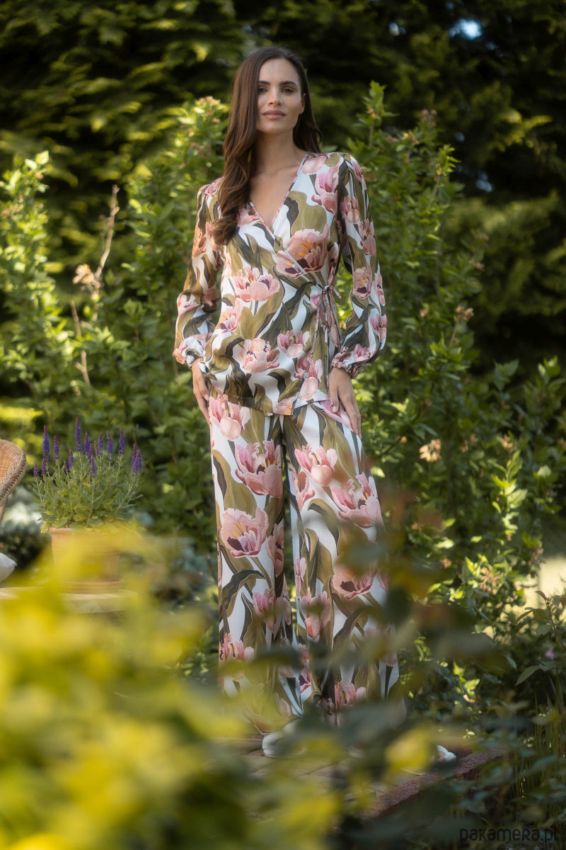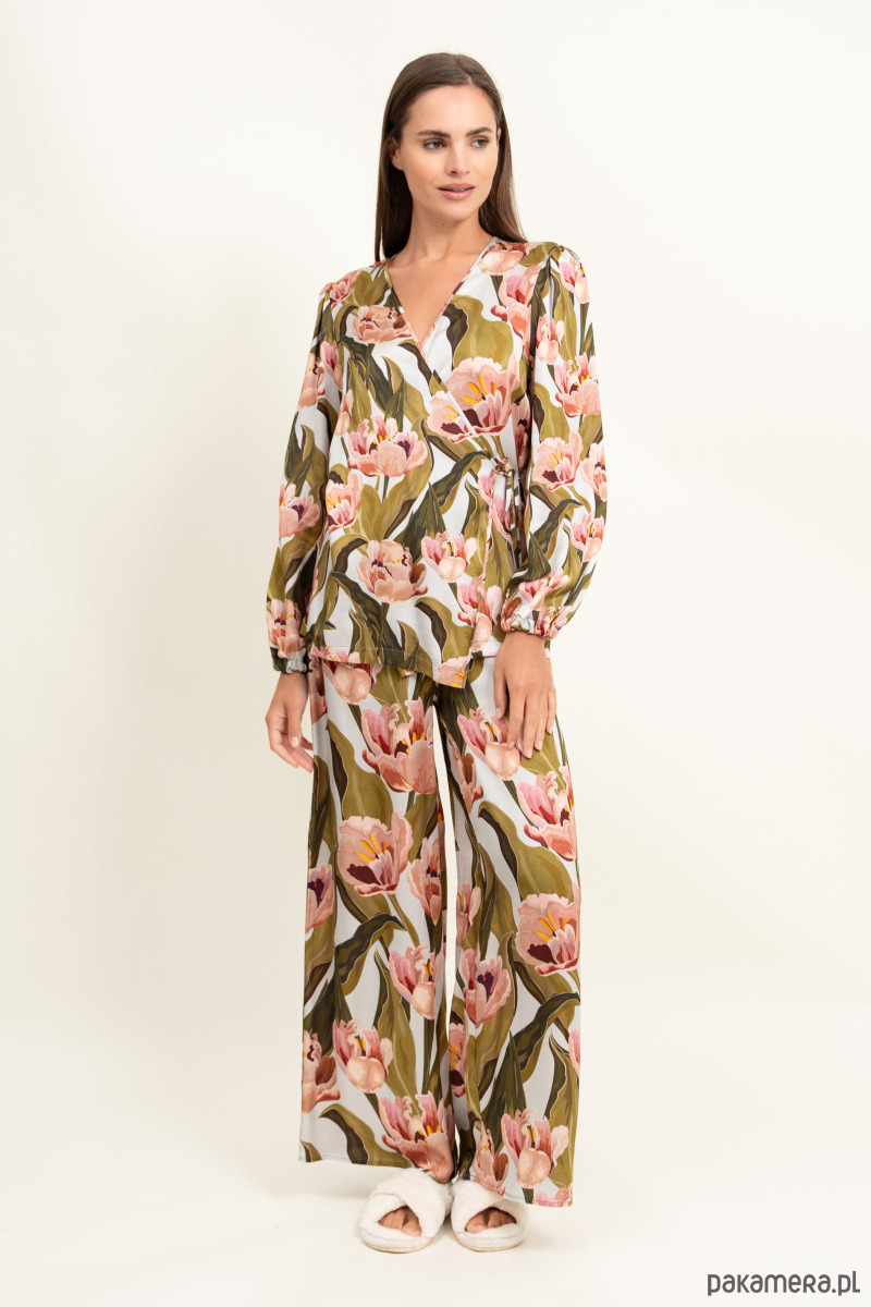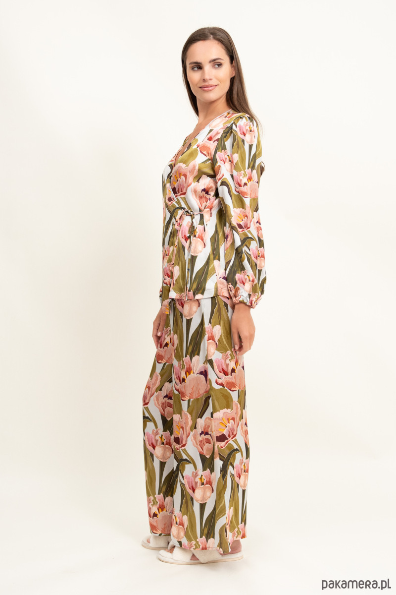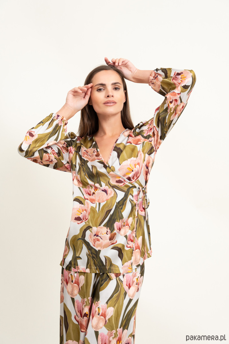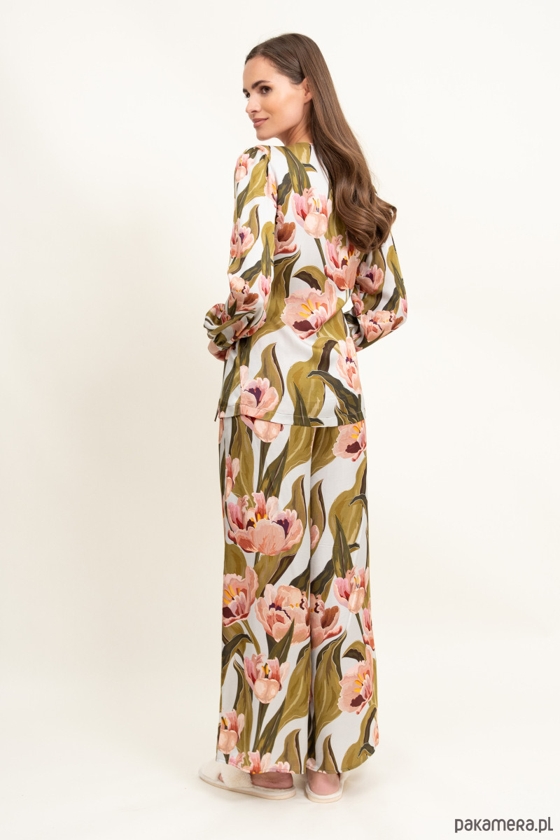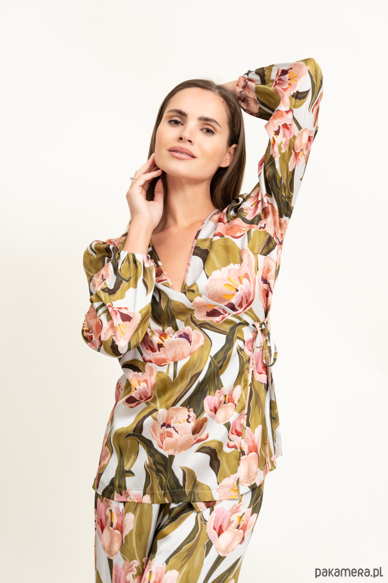 Piżama „Kwiatowy Blask” to esencja wiosennej elegancji i komfortu nocnego. Wykonana z 100% wiskozy, ta długa piżama zachwyca nie tylko lekkością i przewiewnością, ale także delikatnym, satynowym wykończeniem. Regulowany dekolt V oraz bufki na rękawach podkreślają kobiecą urodę, a luźne spodnie zapewniają swobodę ruchów. Elegancki wzór z tulipanami dodaje uroku, a dostępność w rozmiarach od XS do 4XL gwarantuje idealne dopasowanie. Pozwól sobie na luksus i zanurz się w kwiatowych snach z piżamą „Kwiatowy Blask”.