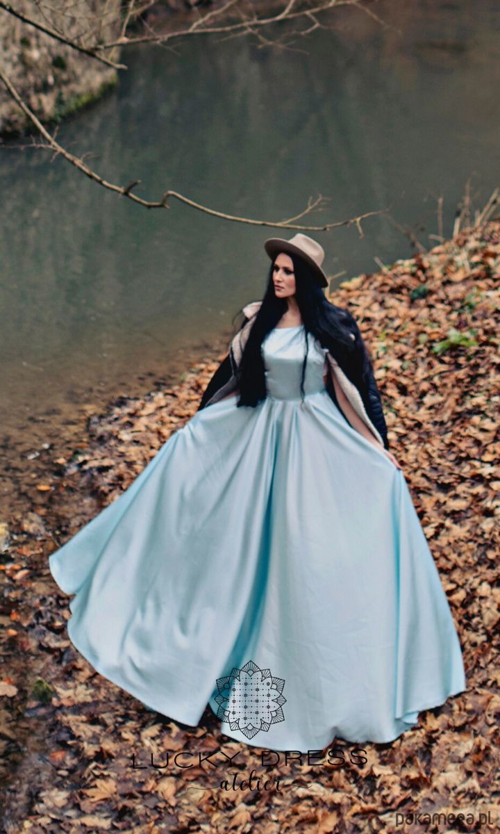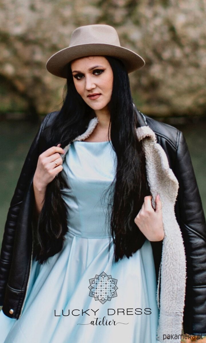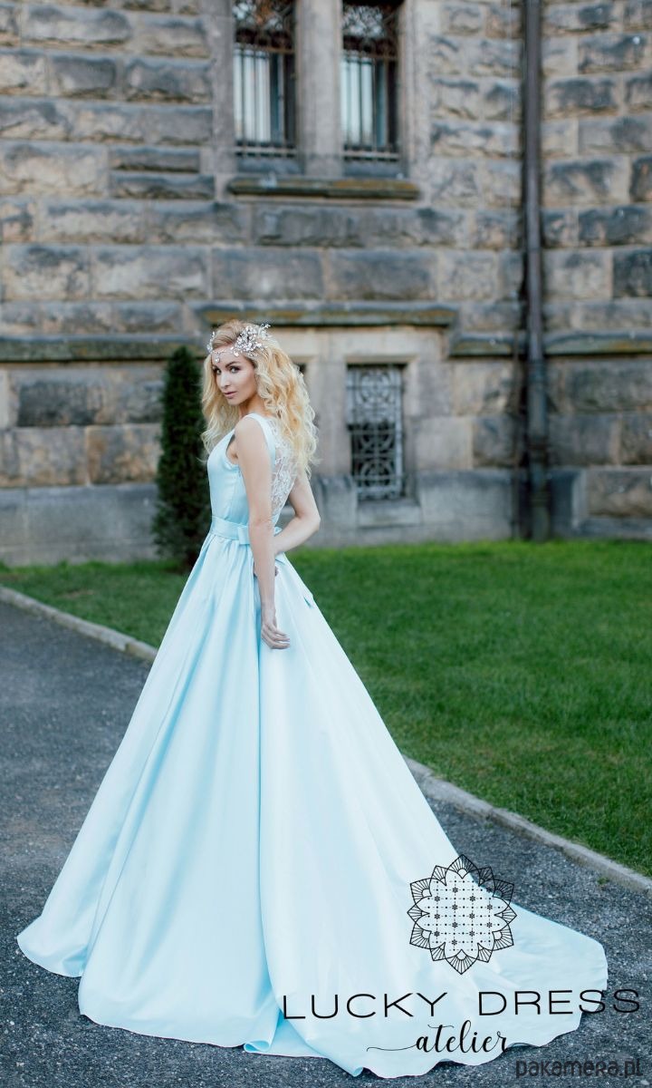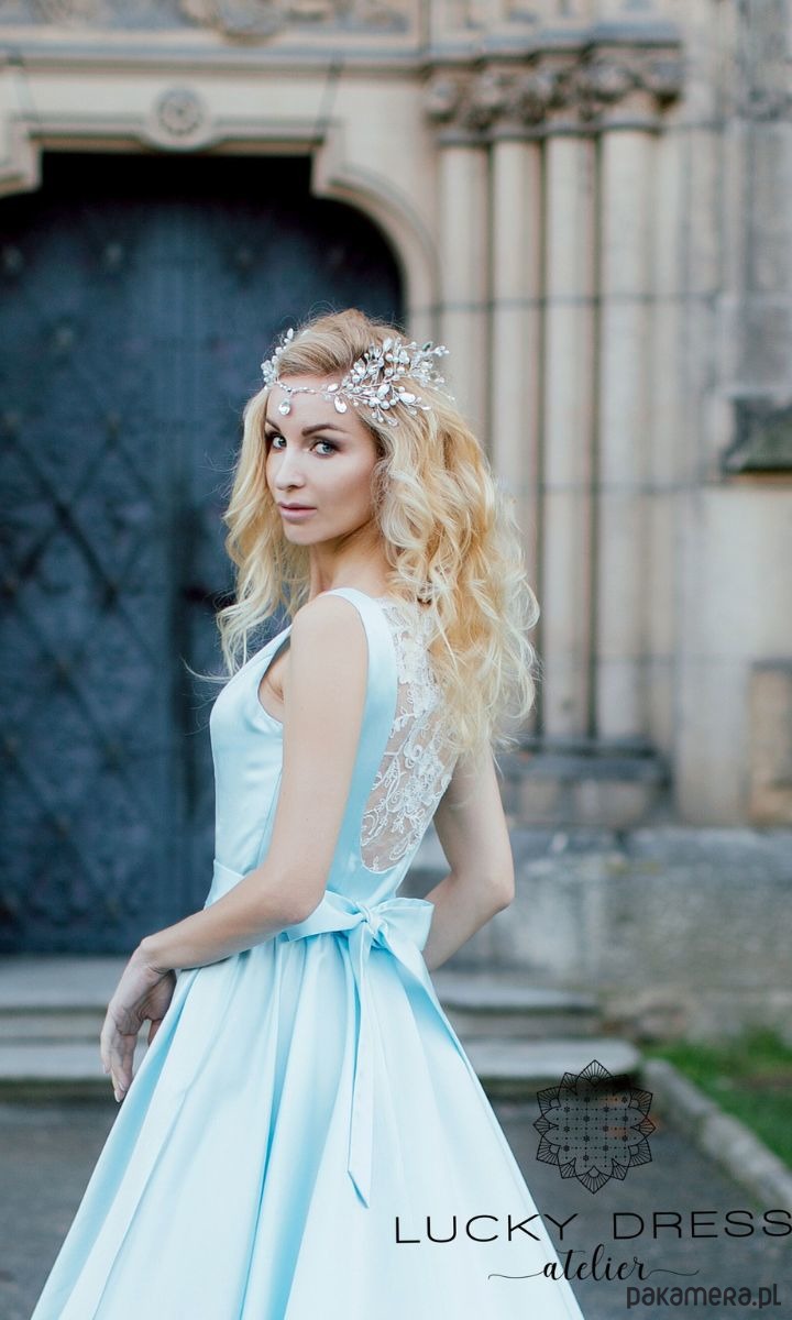 Kendall to suknia ślubna o dopasowanej górze i rozkloszowanym dole utrzymana w kolorze błękitnym. Suknię uszyłyśmy z połączenia półmatowej cienkiej satyny, wiskozowej podszewki oraz delikatnej francuskiej koronki chantilly. Góra sukni ślubnej Kendall tworzy kwadratowy dekolt oraz szerokie ramiączka. Plecy zasłoniłyśmy francuską koronką o motywie kwiatowym, przez którą prześwituje skóra. Talię podkreśliłyśmy wszytym paskiem, który z tyłu można zawiązać na kokardę. Dół sukni ślubnej Kendall to rozkloszowana spódnica zakończona podpinanym trenem. Pokaż klasę w dniu ślubu!