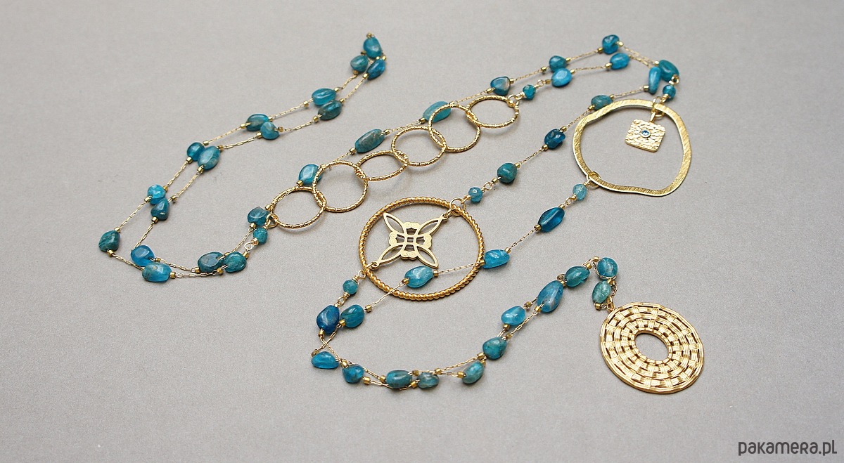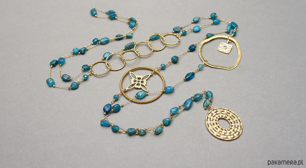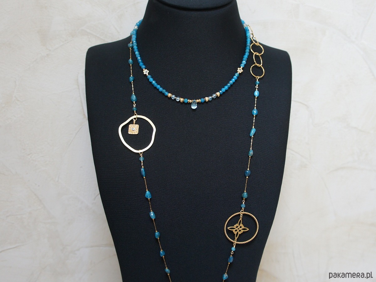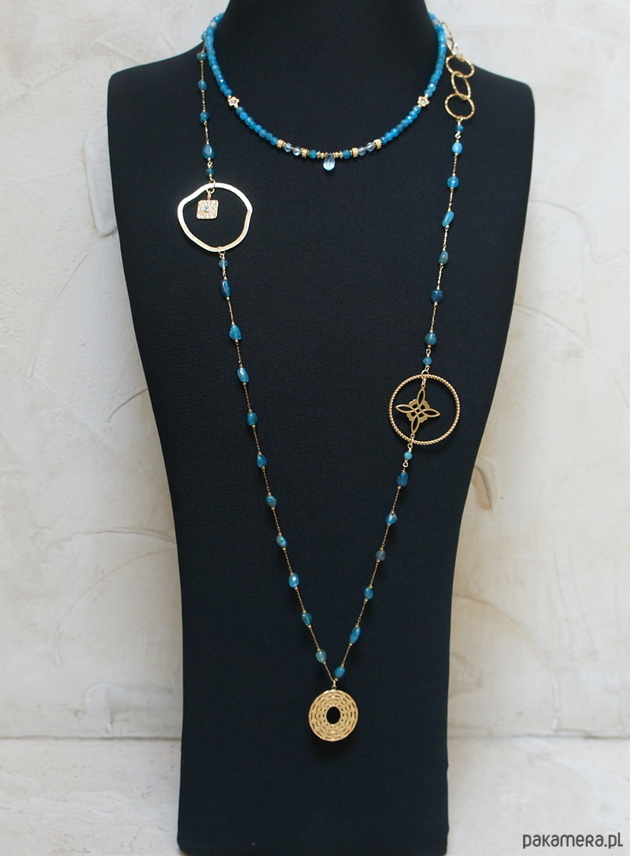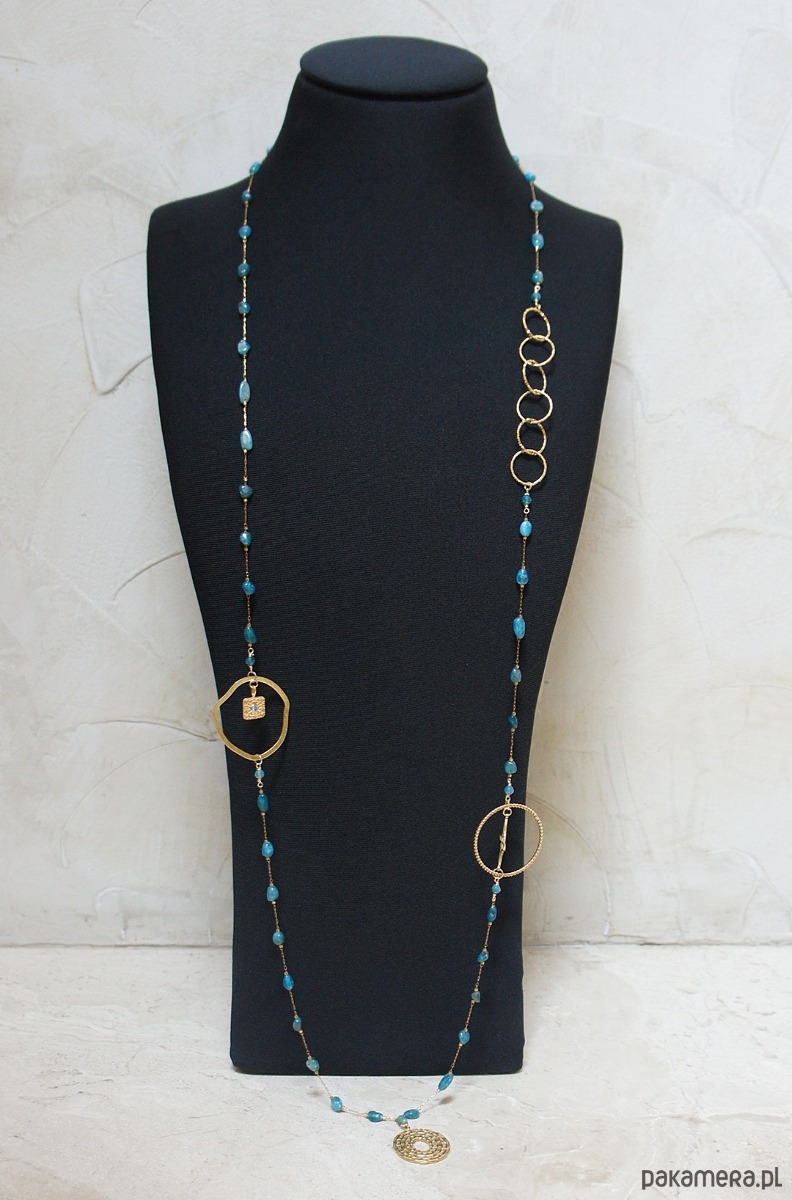 Bardzo długi naszyjnik wykonany ze stali szlachetnej pozłacanej w połączeniu z naturalnymi minerałami - apatyt [4mm i od 6mm do 10mm] , zawieszki z cyrkonią w okuciu oraz nieregularnej obręczy z mosiądzu. Całkowita długość naszyjnika ok. 120 cm. Biżuteria ozdobnie zapakowana.