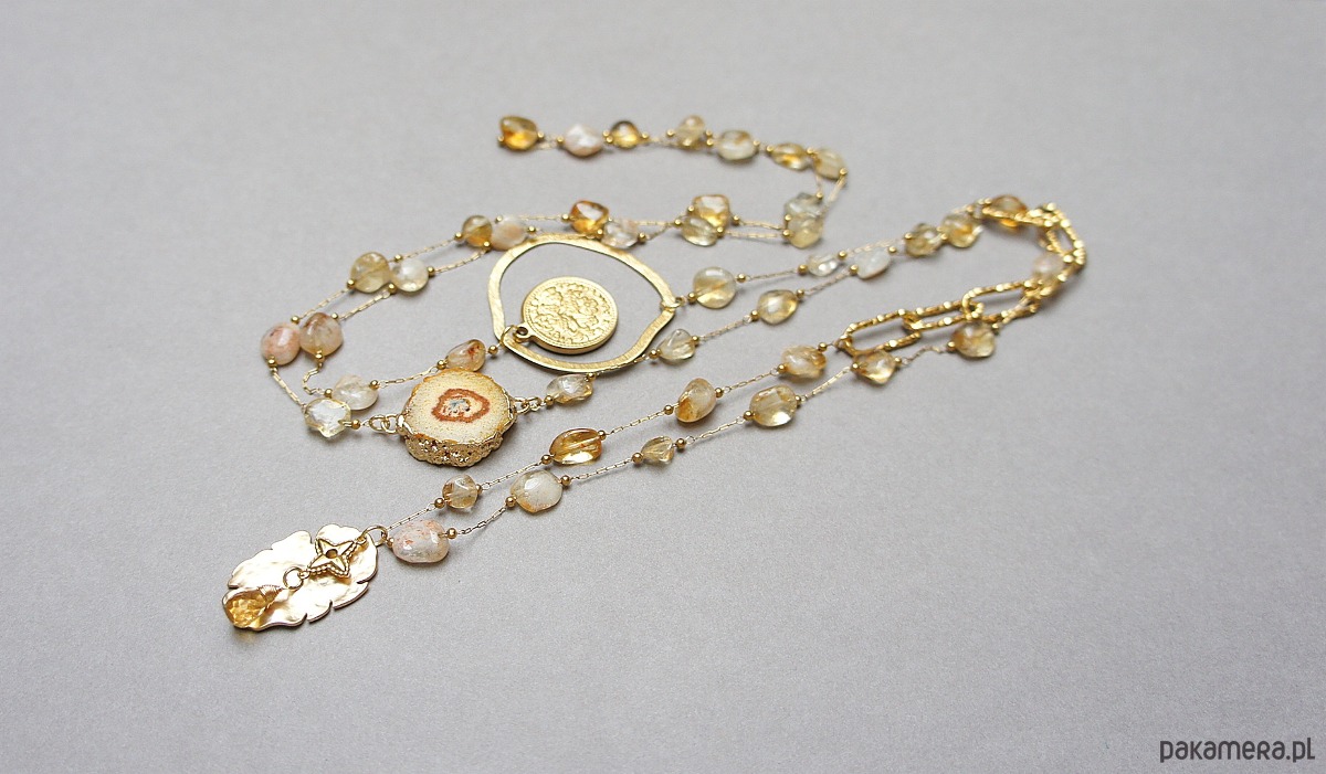 Bardzo długi naszyjnik wykonany ze stali szlachetnej pozłacanej w połączeniu z naturalnymi, nieregularnymi cytrynami [od 7 - 10mm], plastrem agatu, brioletki cytrynu, nieregularnej obręczy z mosiądzu, nieregularnej blaszki z platerowanego mosiądzu. Całkowita długość naszyjnika ok. 115 cm. Biżuteria ozdobnie zapakowana.