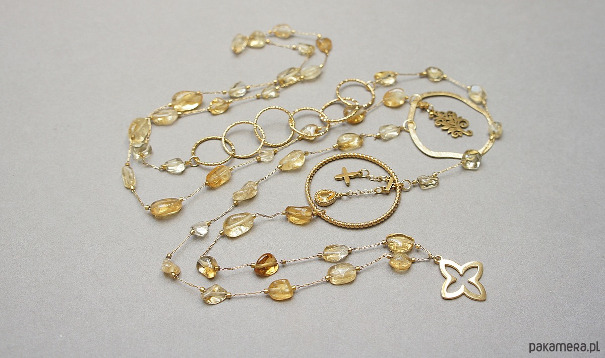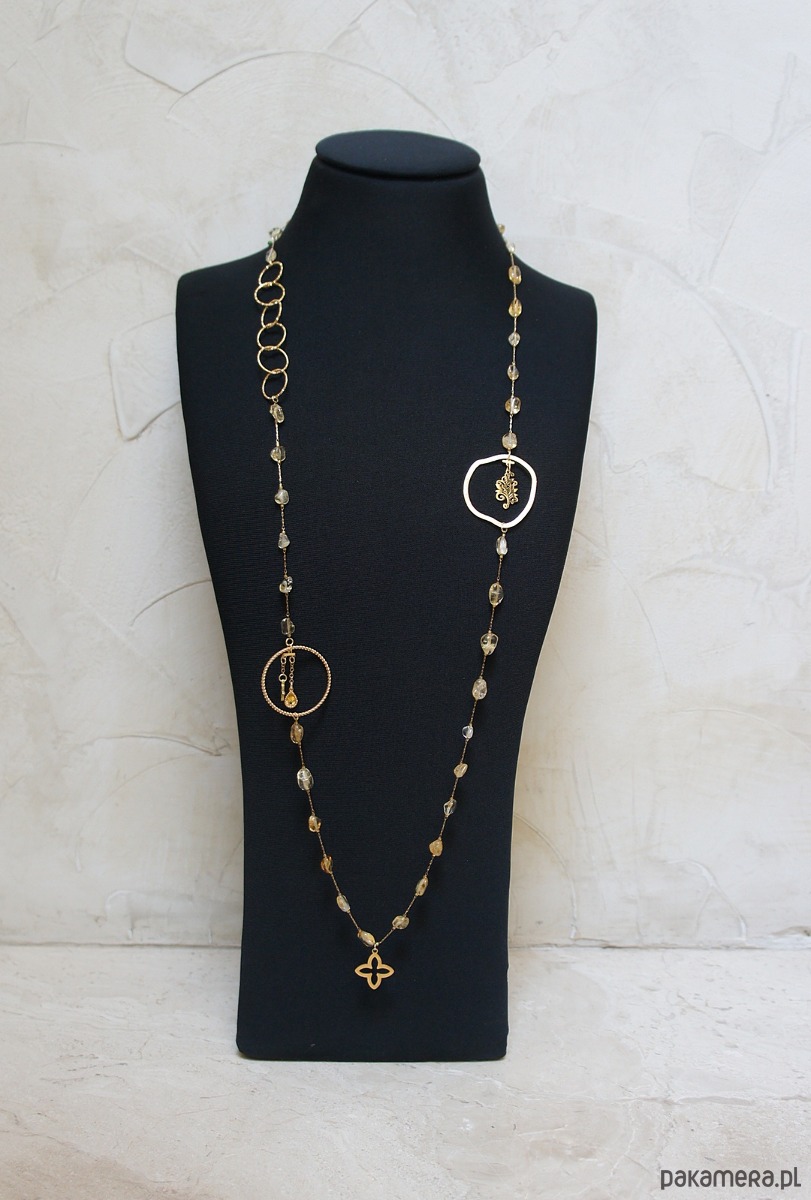 Bardzo długi naszyjnik wykonany ze stali szlachetnej pozłacanej w połączeniu z naturalnymi, nieregularnymi cytrynami [od 7 - 10mm], cyrkonią w okuciu, nieregularną obręczą z mosiądzu. Całkowita długość naszyjnika ok. 116 cm. Biżuteria ozdobnie zapakowana.