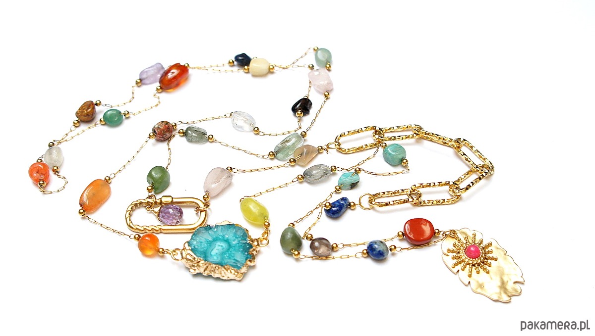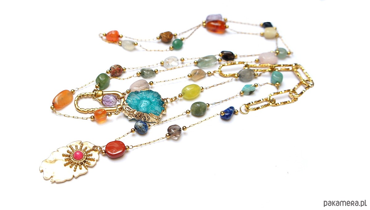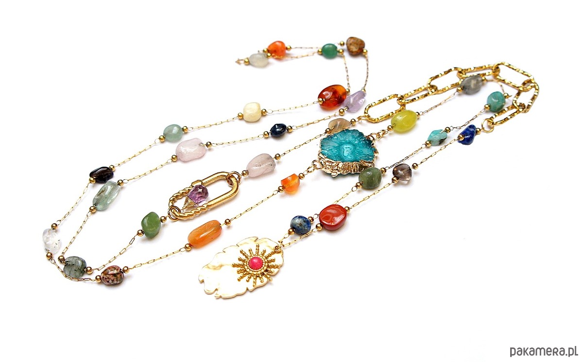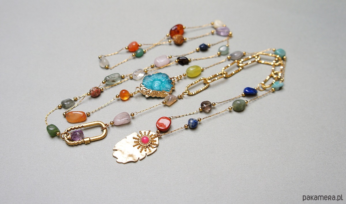Bardzo długi naszyjnik wykonany ze stali szlachetnej pozłacanej w połączeniu z mixem naturalnych minerałów - [od ok 6mm do 11mm], łącznika z agatu, zawieszki z jadeitem, brioletki z ametystu, zawieszki z platerowanego mosiądzu. Całkowita długość naszyjnika ok. 107 cm. Biżuteria ozdobnie zapakowana.