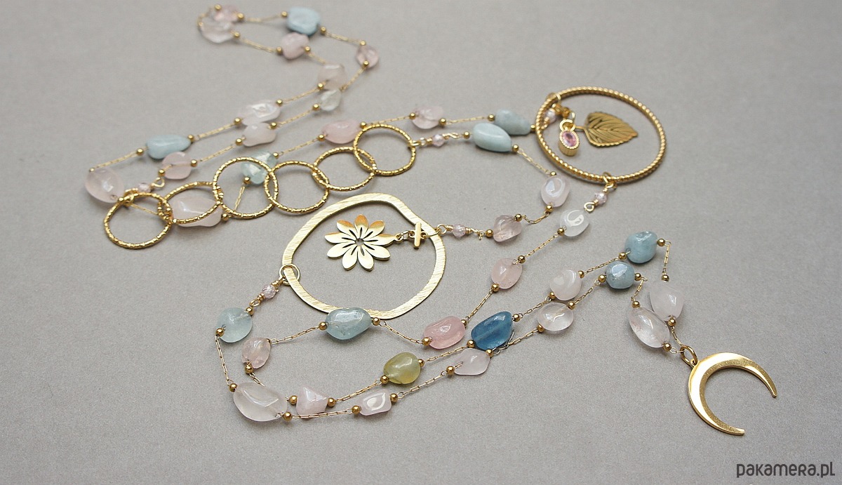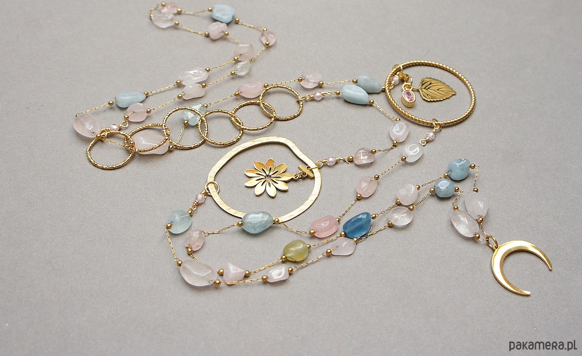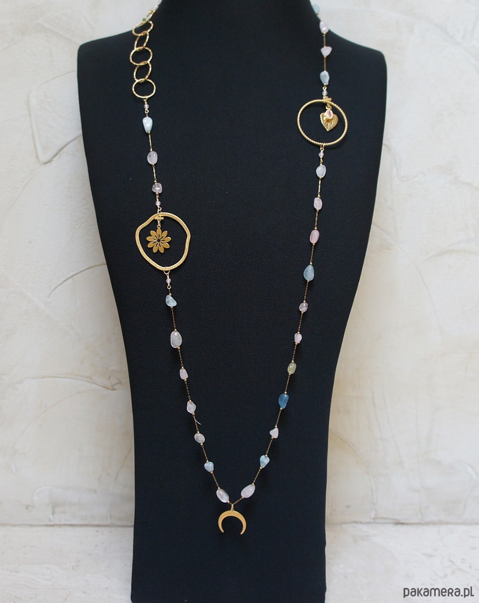 Bardzo długi naszyjnik wykonany ze stali szlachetnej pozłacanej w połączeniu z naturalnymi minerałami - pastelowy morganit [od 6mm do 11mm] oraz zawieszki z cyrkonią w okuciu. Całkowita długość naszyjnika ok. 110 cm. Biżuteria ozdobnie zapakowana.