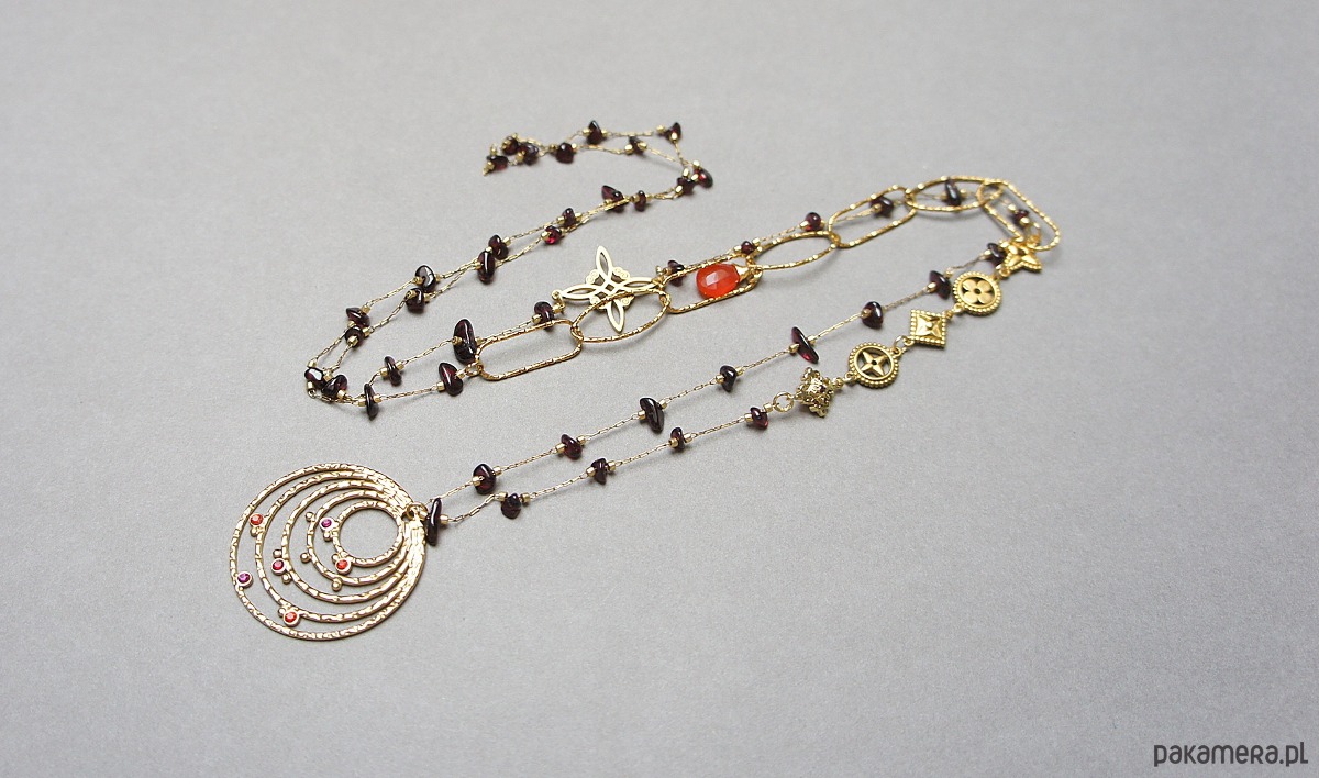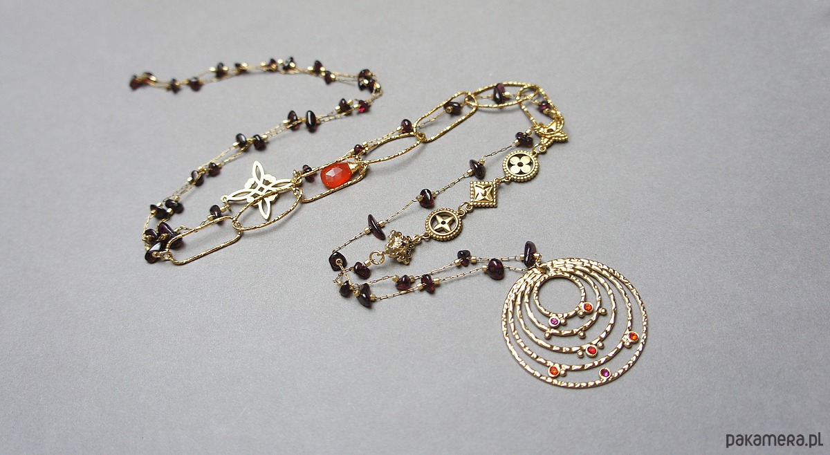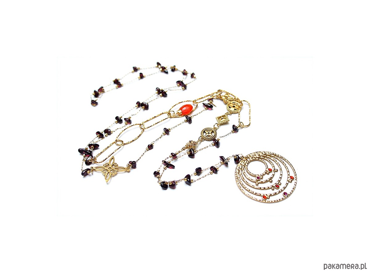 Bardzo długi naszyjnik wykonany ze stali szlachetnej pozłacanej w połączeniu z naturalnymi, nieregularnymi granatami, zawieszki z naturalnym kamieniem, brioletki pomarańczowego karneolu, zawieszki wysadzanej cyrkoniami. Całkowita długość naszyjnika ok. 103 cm. Biżuteria ozdobnie zapakowana.