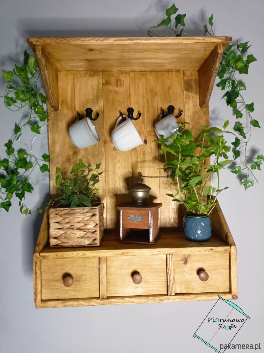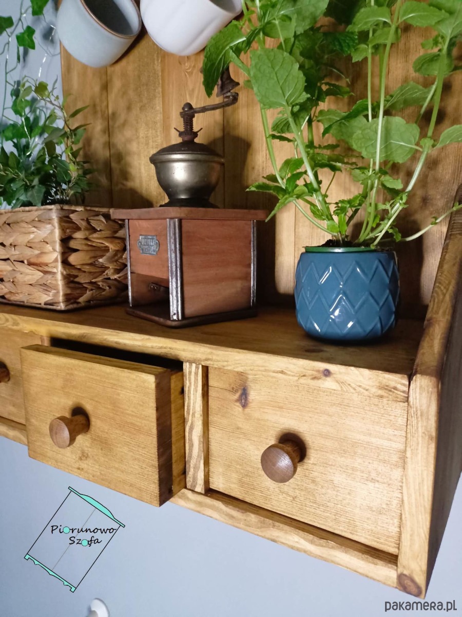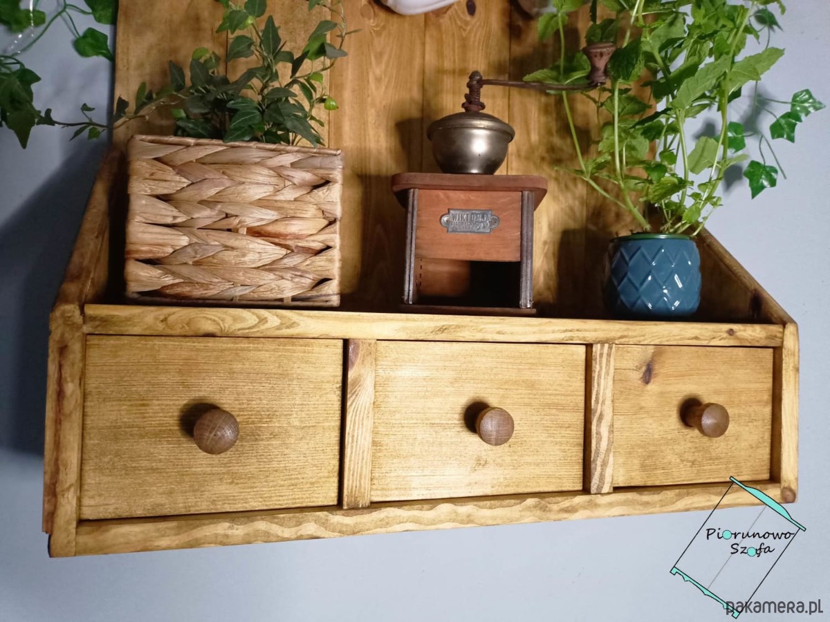 Prześliczna drewniana witrynka, regał ścienny z szufladami retro na kubki, talerzyki i dodatki kuchenne. Ciekawy pomysł do kuchni w starym stylu, na wszelkiego rodzaju przyprawy i nie tylko. Będzie pięknie zdobiła wnętrze. Oddaje klimat sielskości, wiejskiego domu. Poprzez swój ciepły kolor odnajdzie się w niejednej stylizowanej kuchni. Drewno postarzane, sosnowe w kolorze orzecha.Wygląda jakby świat zatrzymał się kilkadziesiąt late temu. Bajeczna półka, niezwykle urokliwa w swej krasie.