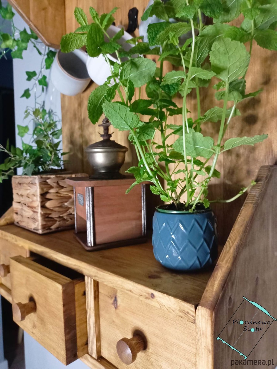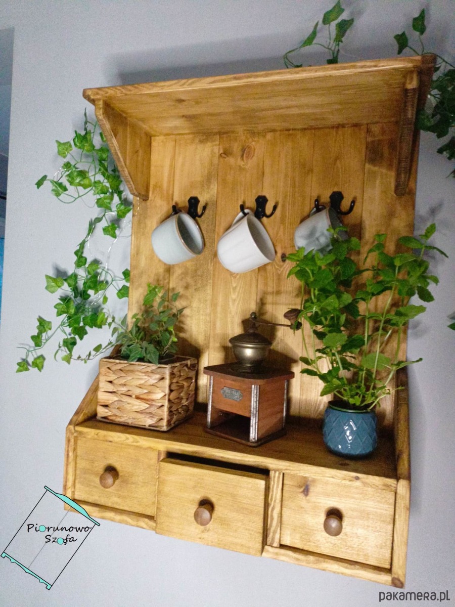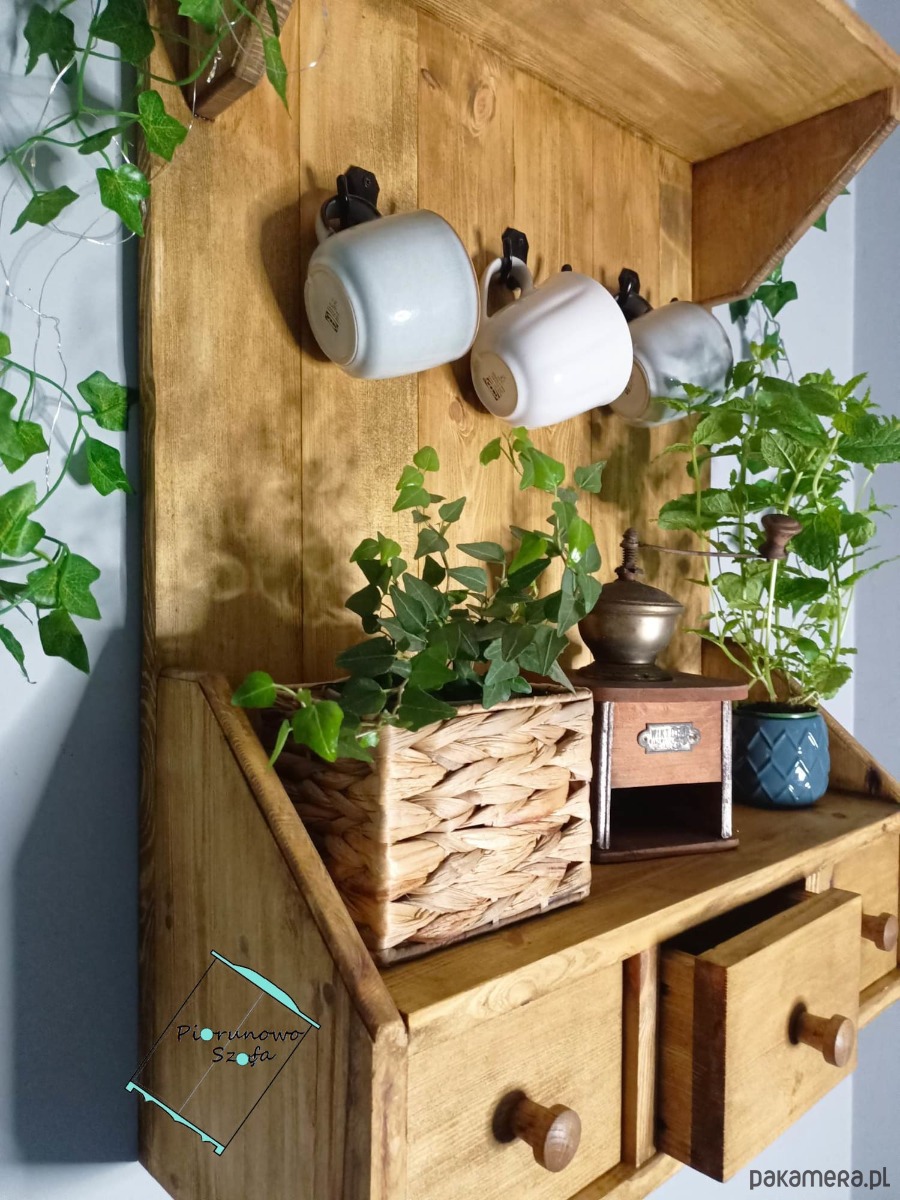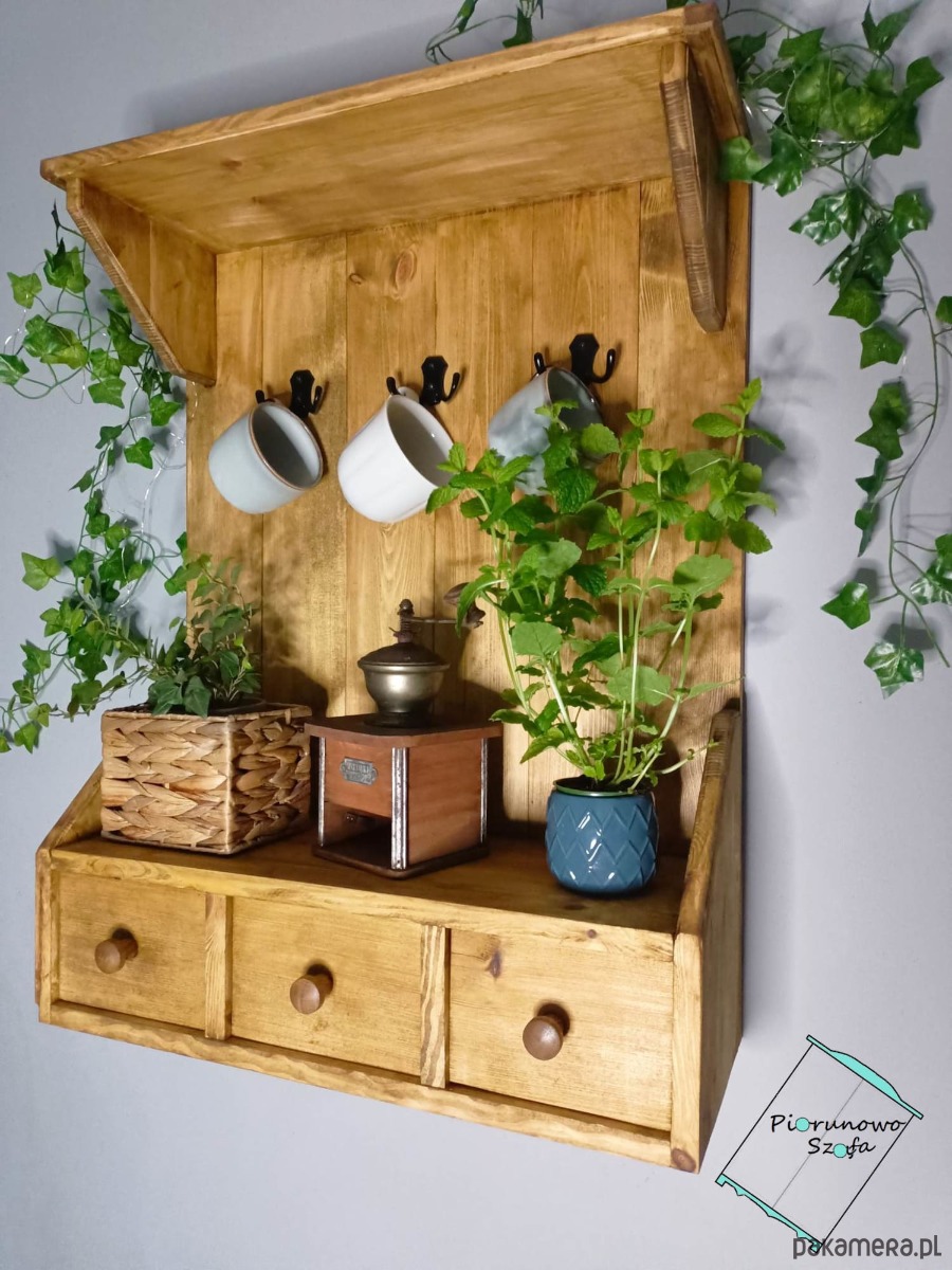 Prześliczna drewniana witrynka, regał ścienny z szufladami retro na kubki, talerzyki i dodatki kuchenne. Ciekawy pomysł do kuchni w starym stylu, na wszelkiego rodzaju przyprawy i nie tylko. Będzie pięknie zdobiła wnętrze. Oddaje klimat sielskości, wiejskiego domu. Poprzez swój ciepły kolor odnajdzie się w niejednej stylizowanej kuchni. Drewno postarzane, sosnowe w kolorze orzecha.Wygląda jakby świat zatrzymał się kilkadziesiąt late temu. Bajeczna półka, niezwykle urokliwa w swej krasie.