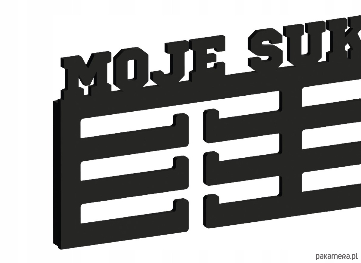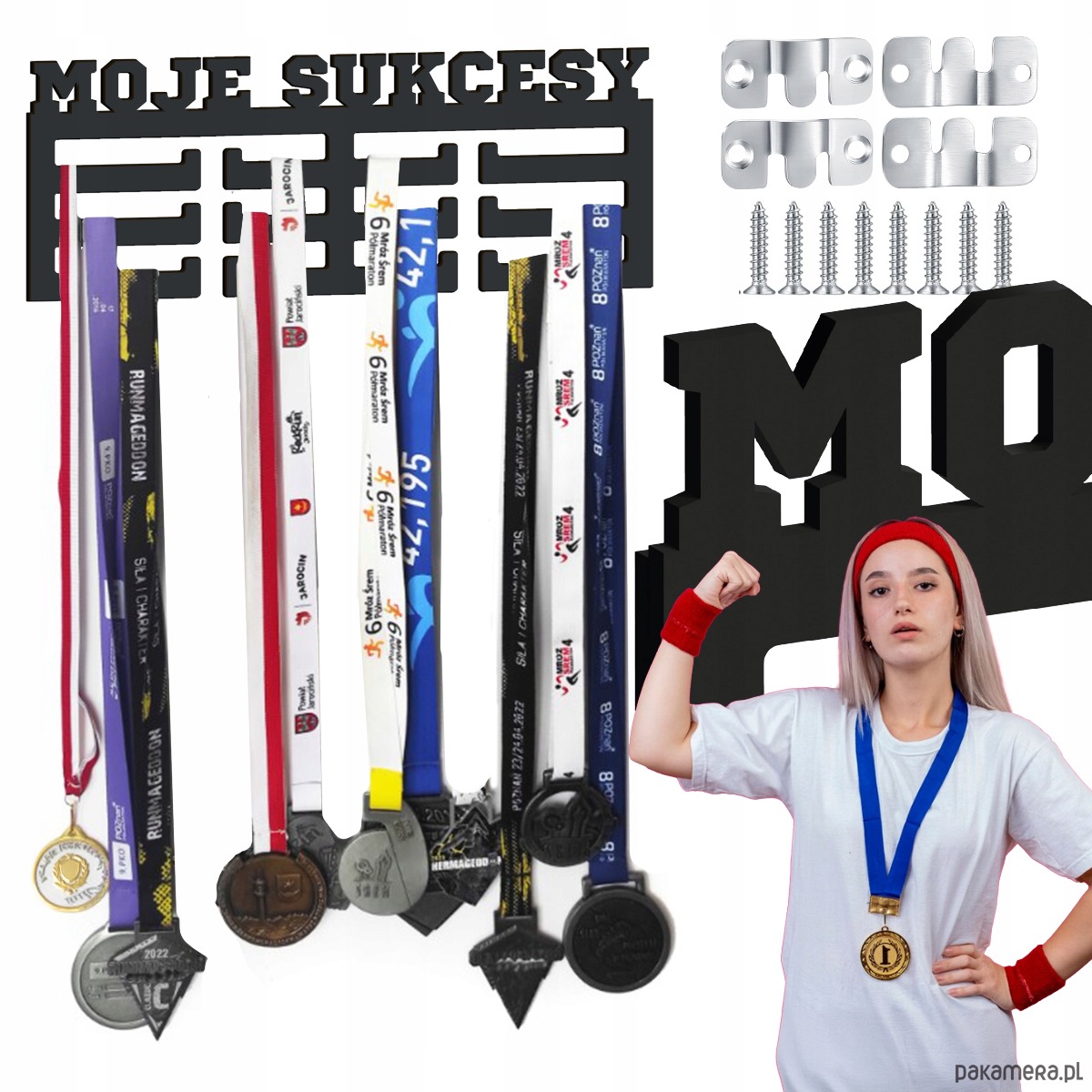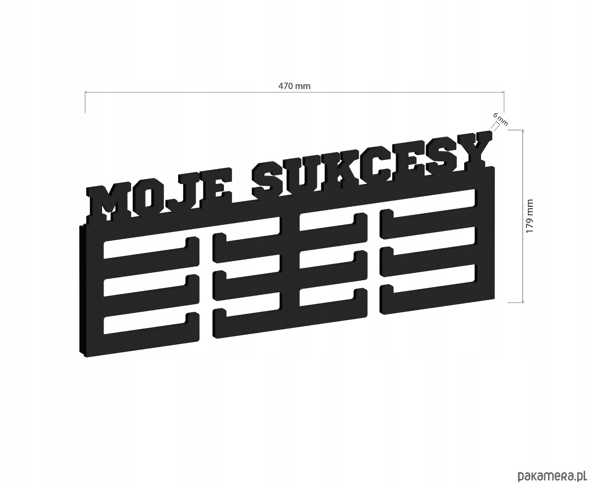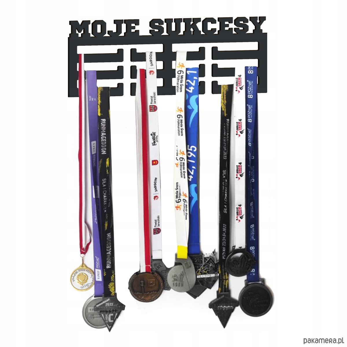 Wieszak na medale "MOJE SUKCESY" to elegancki i praktyczny produkt, który służy do eksponowania zdobytych medali. Wieszak ułatwia organizację i prezentację osiągnięć sportowych lub innych, dodając im wyjątkowego charakteru. Dzięki niemu, wszystkie Twoje medale będą zawsze na widoku, przypominając o wygranych i motywując do kolejnych sukcesów.
