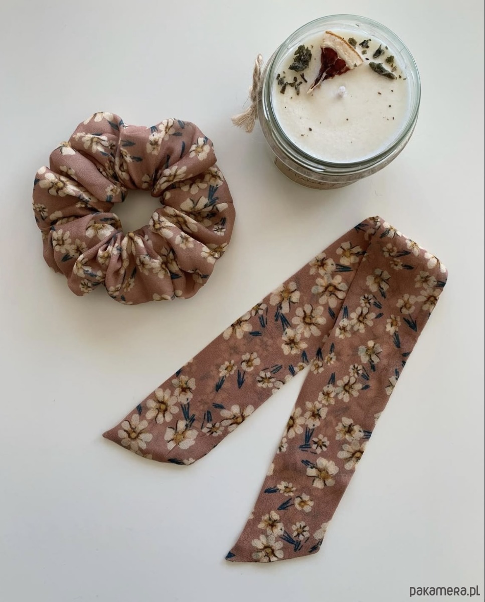 Scrunchie Cintia w jasnym odcieniu brązu z kwiatuszkami