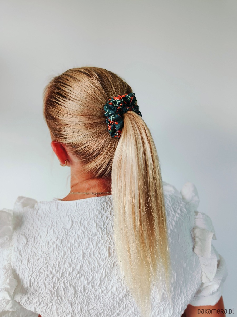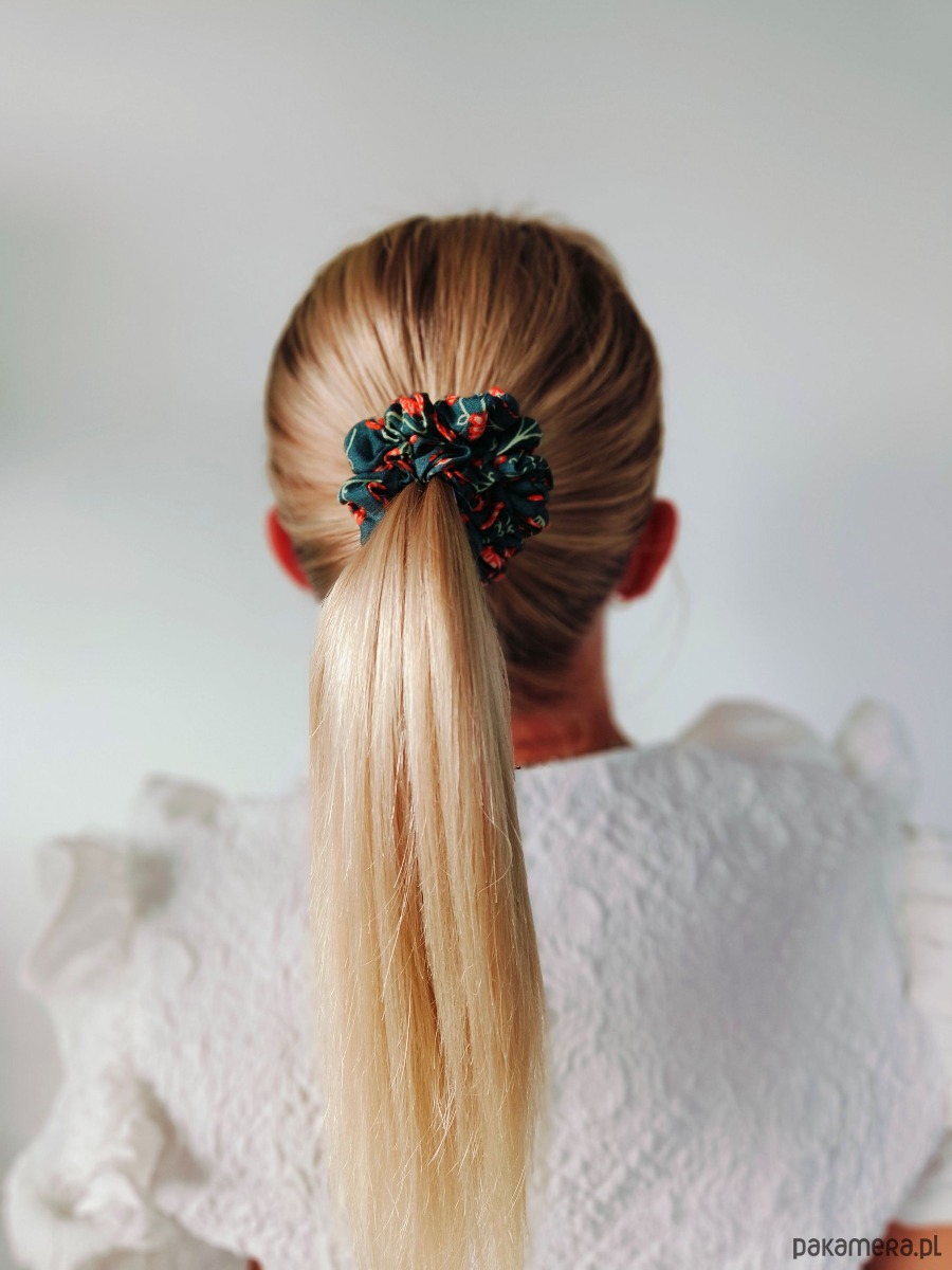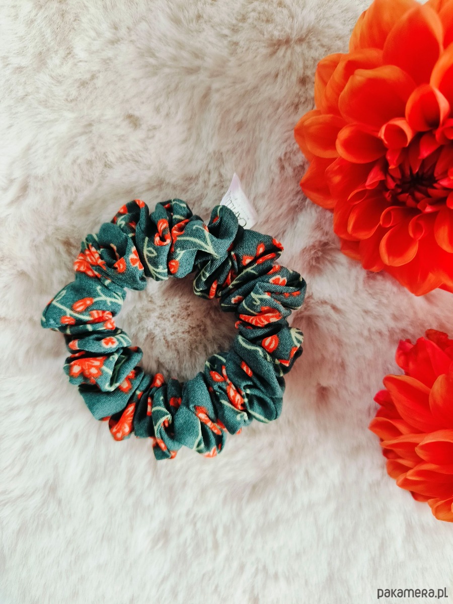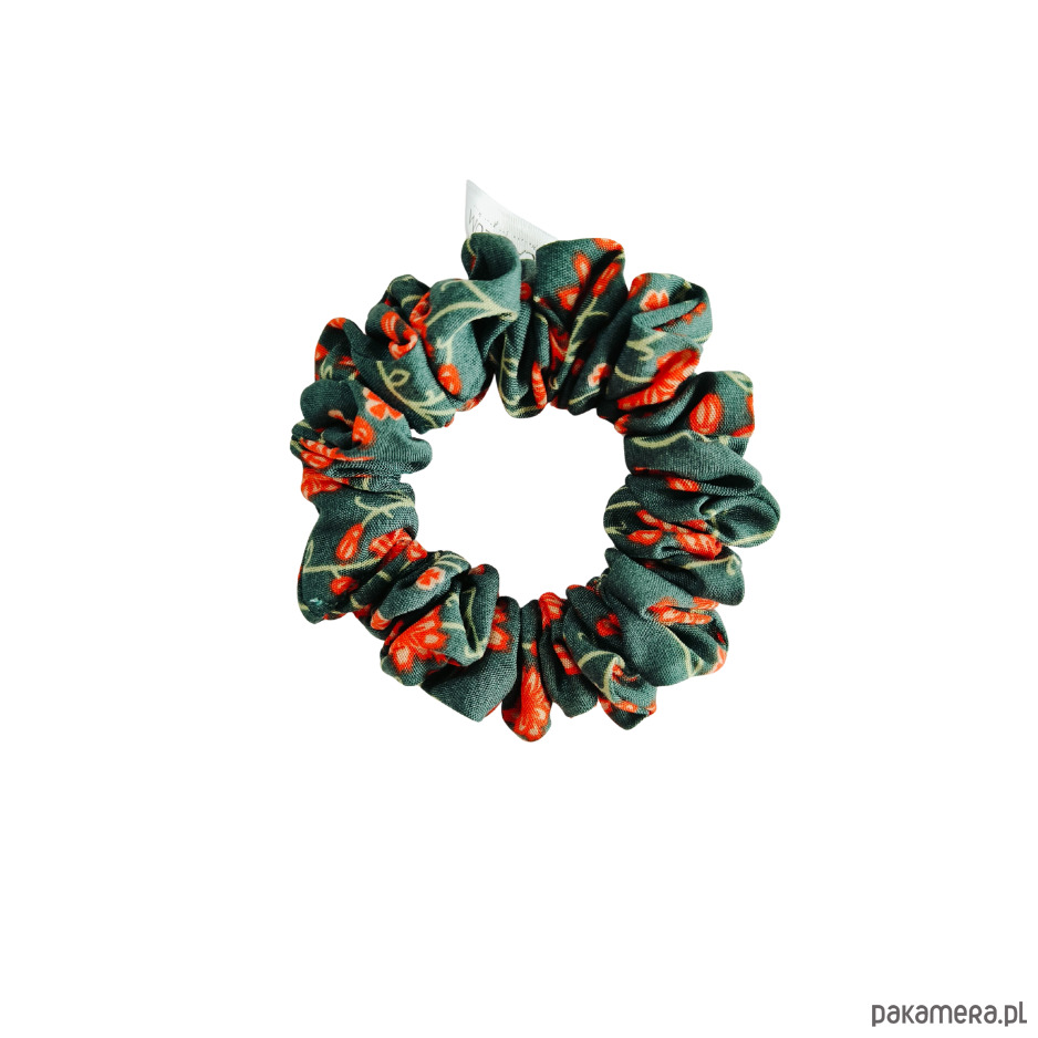 Nasza scrunchie z naturalnej wiskozy w kolorze zielonym z pomarańczowymi kwiatami to połączenie elegancji i wygody w jednym.
