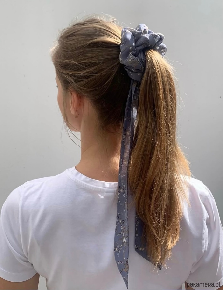 Scrunchie Gabi z szarfą najbardziej efektownie prezentuje się przy wysokim kucyku, podkreślając jego charakter i lekkość fryzury.