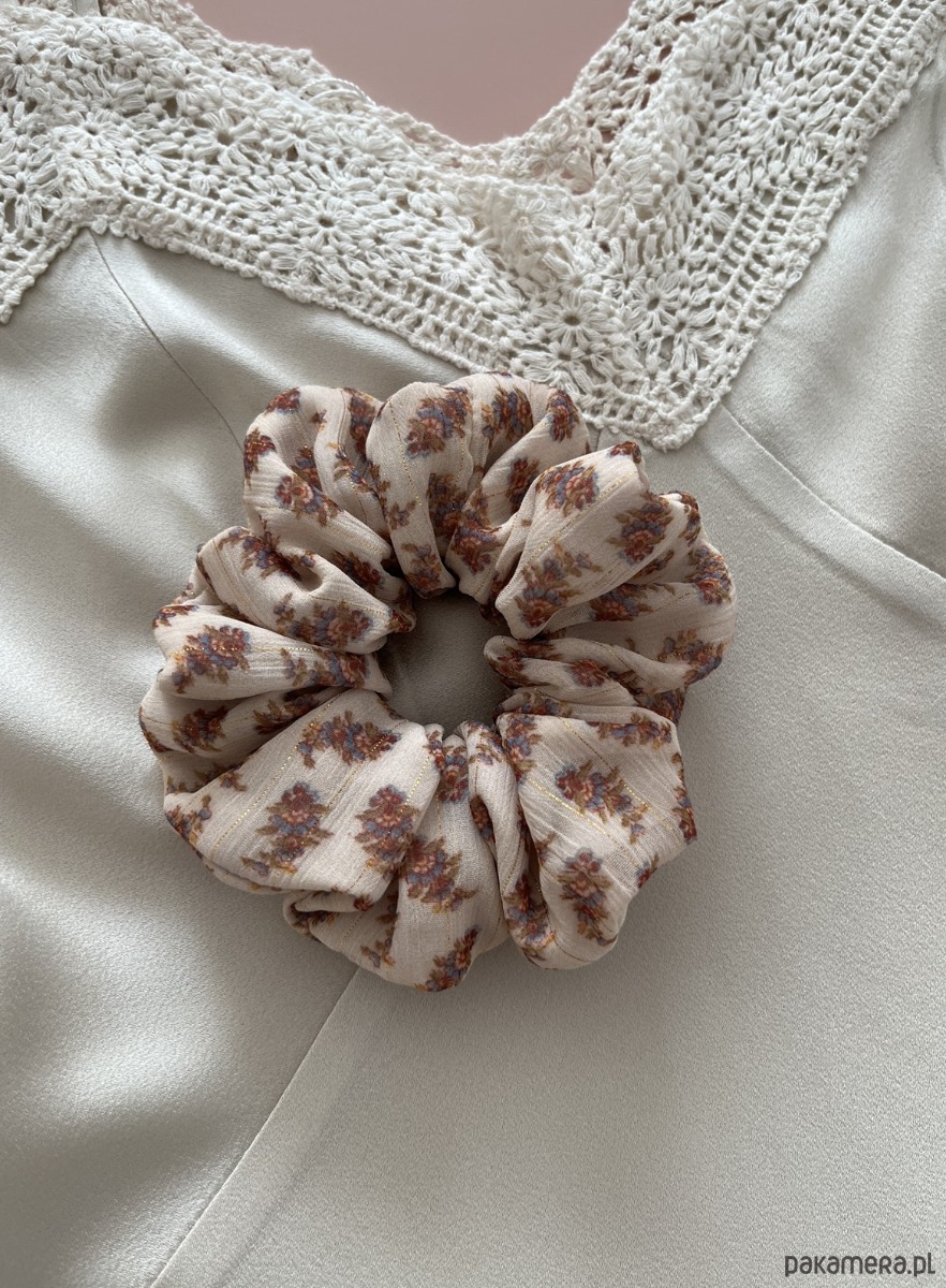 Scrunchie Golden Touch to wyjątkowo efektowna gumka do włosów. Uszyta z wyszukanej wiskozy w odcieniu beżu z drobniutkimi kwiatuszkami i złotą nitką – przyciąga uwagę już od pierwszego spojrzenia.