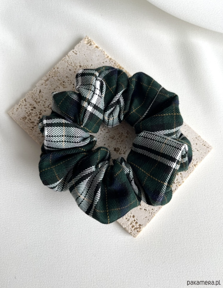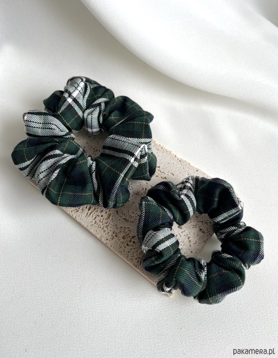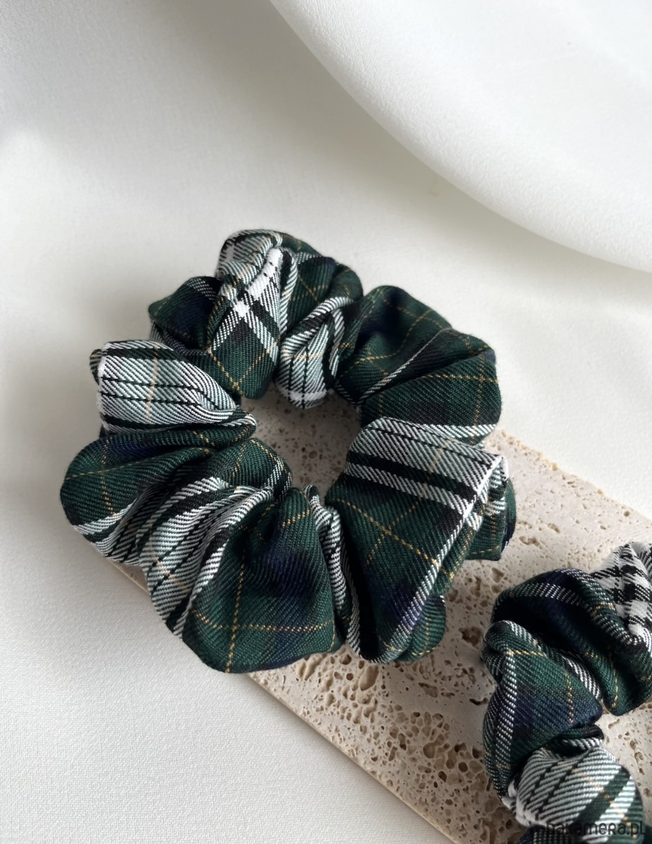 Scrunchie Green Check to minimalistyczny, a zarazem efektowny dodatek do jesiennej czy też zimowej stylizacji. Wykonana z miękkiej tkaniny, pięknie układa się na włosach.