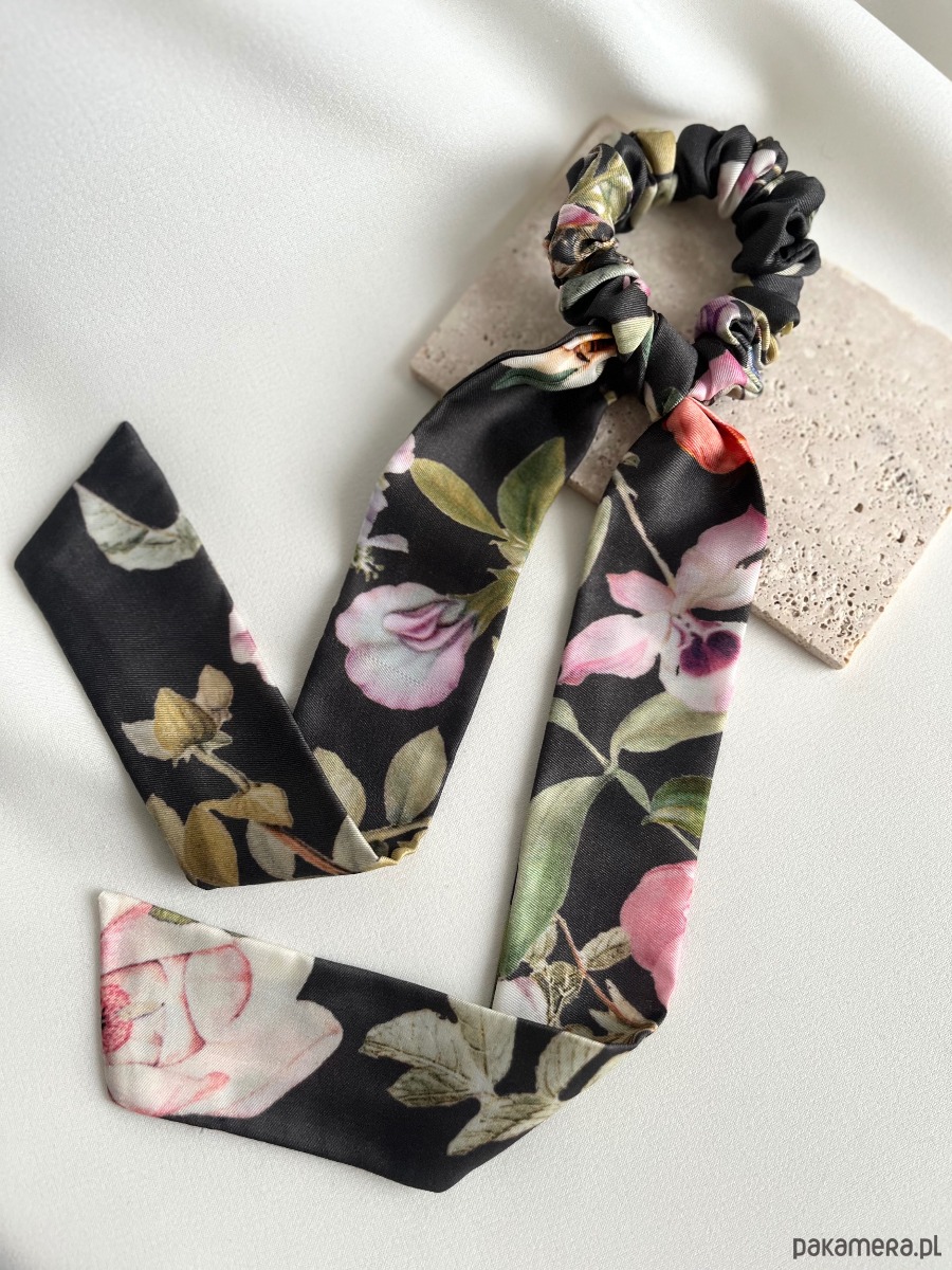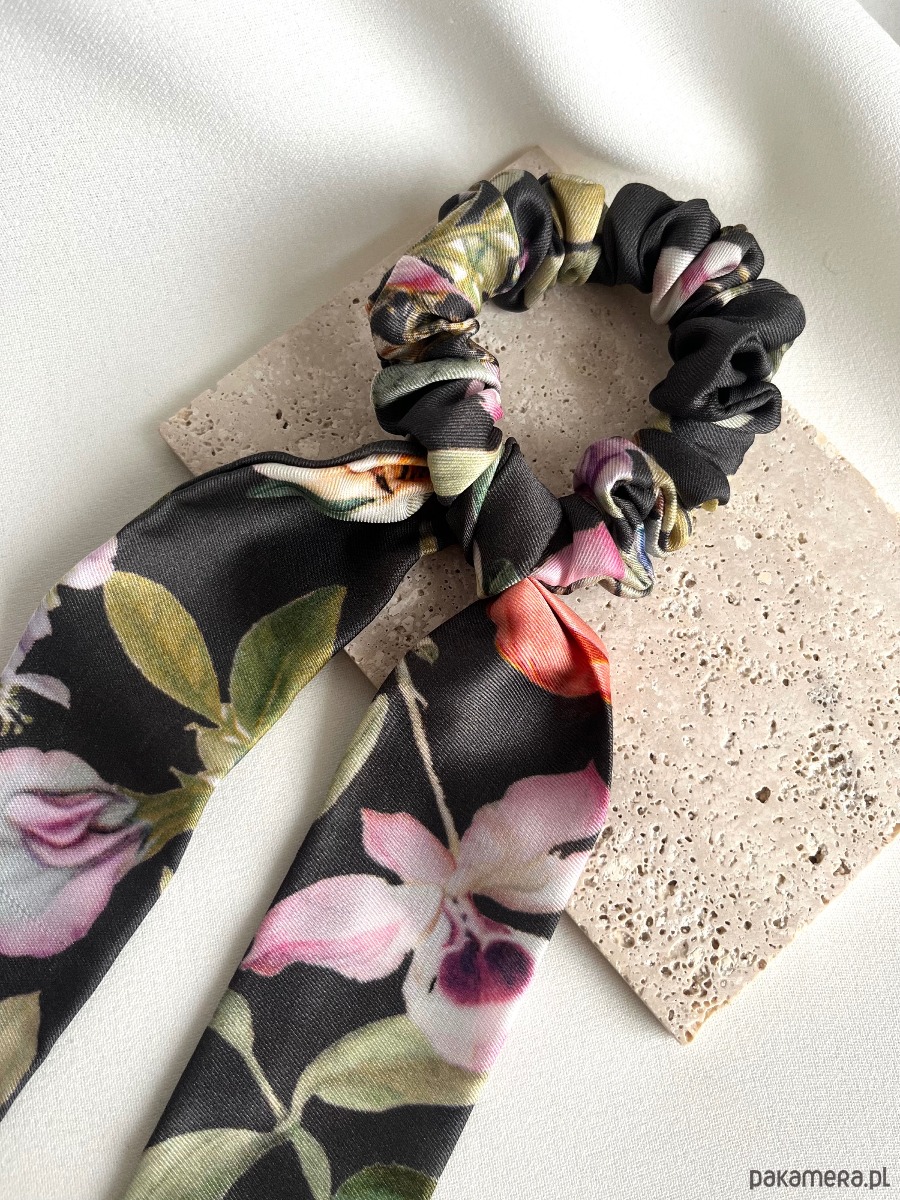 Scrunchie Grey Flores w wersji mini z odwiązywaną szarfą to połączenie delikatności, funkcjonalności i wyjątkowego uroku.