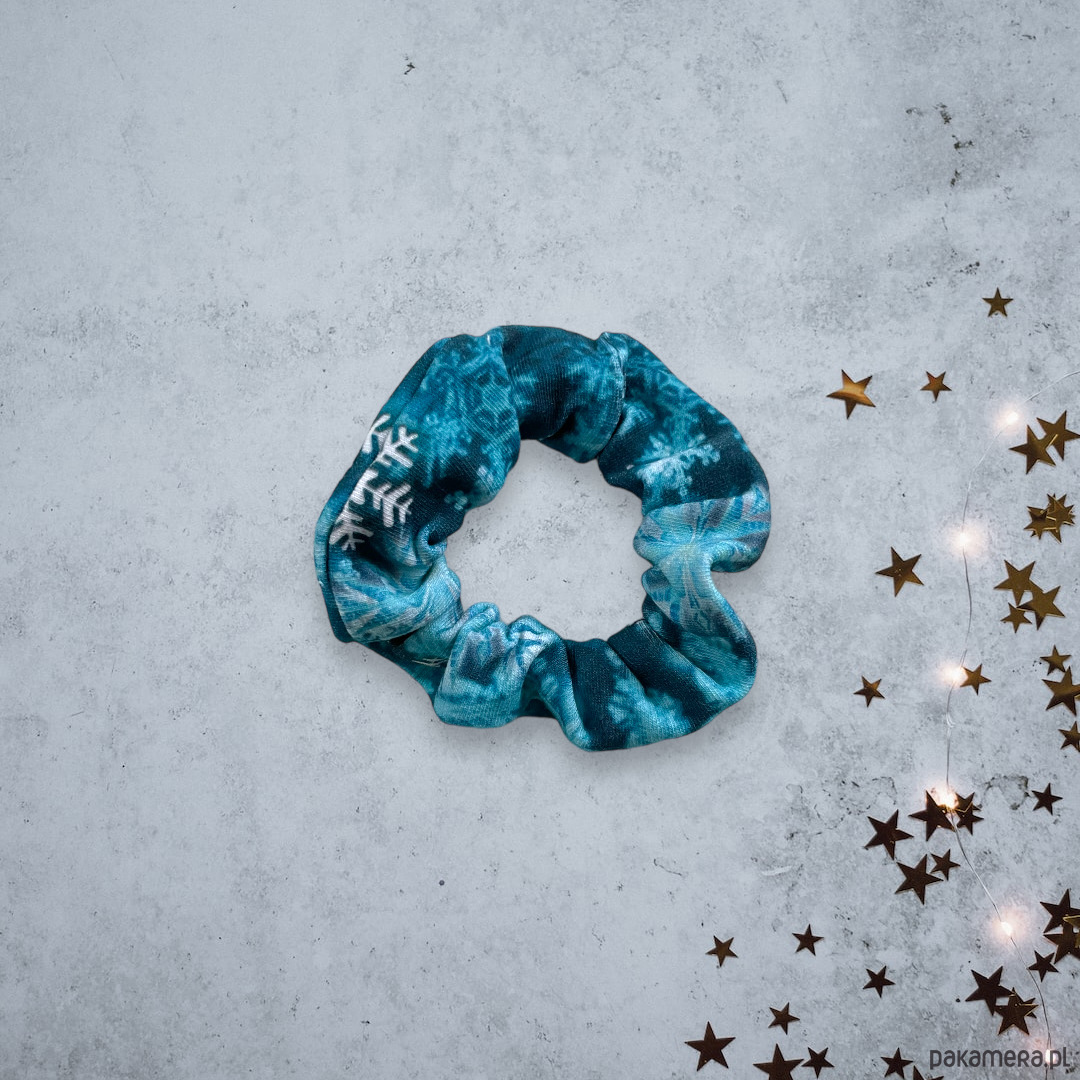 Scrunchie gumka frotka wąska - świąteczna śnieżynki niebieska
