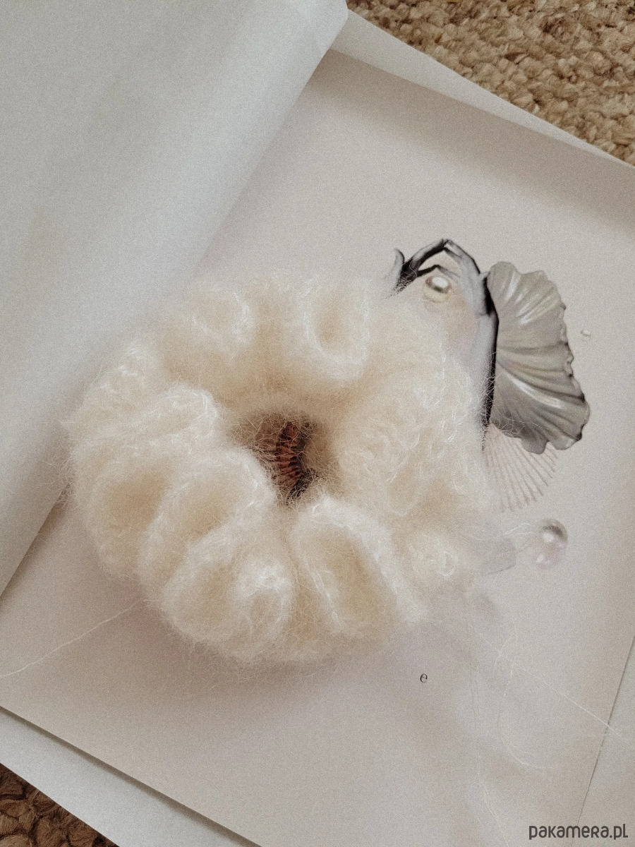 Gumka scrunchie w kolorze śmietankowym. Zrobiona ręcznie na szydełku z miękkiej i lekkiej wełny moherowej z dodatkiem jedwabiu morwowego. Wygląda pięknie na włosach albo jako ozdoba na nadgarstku.