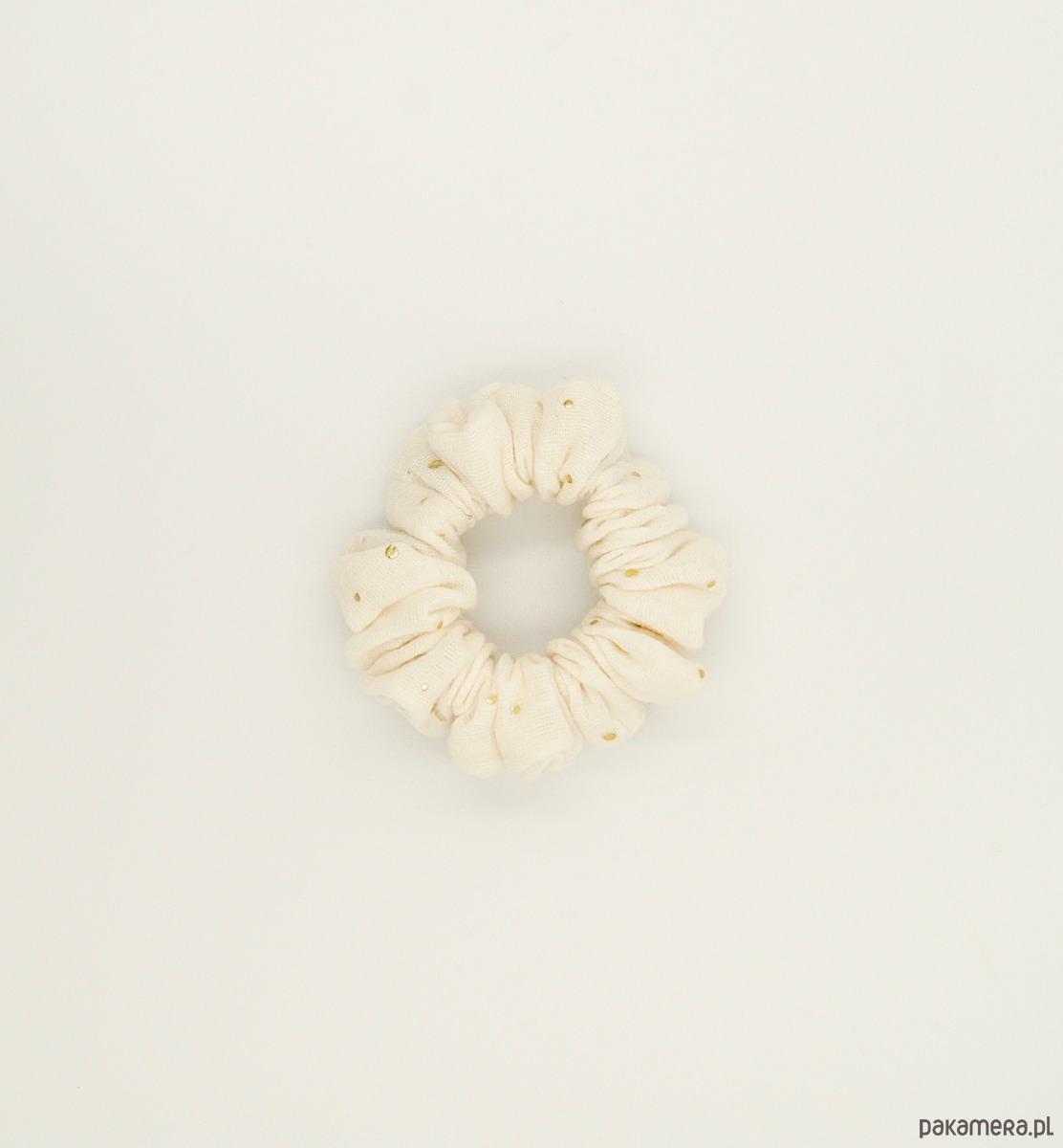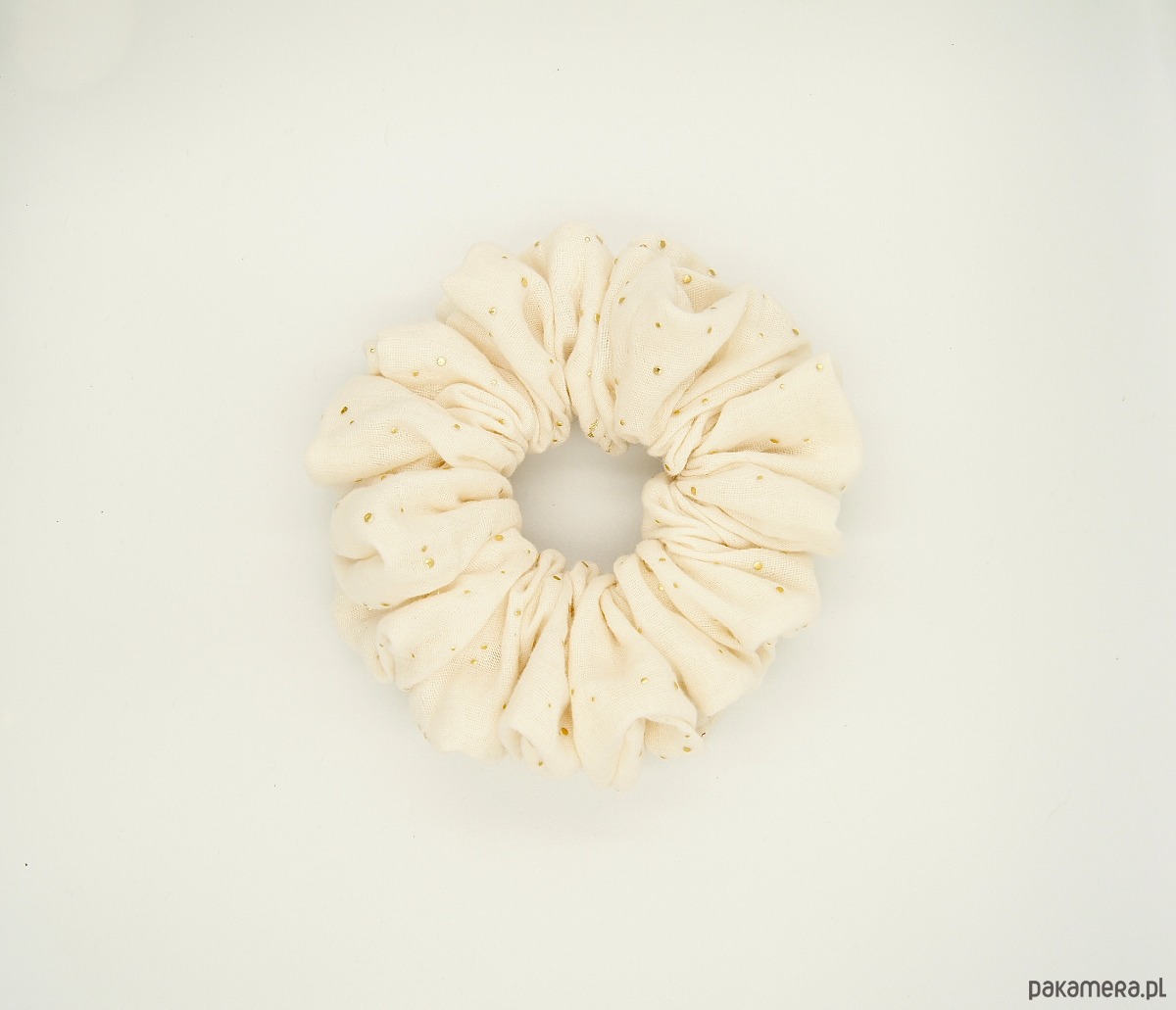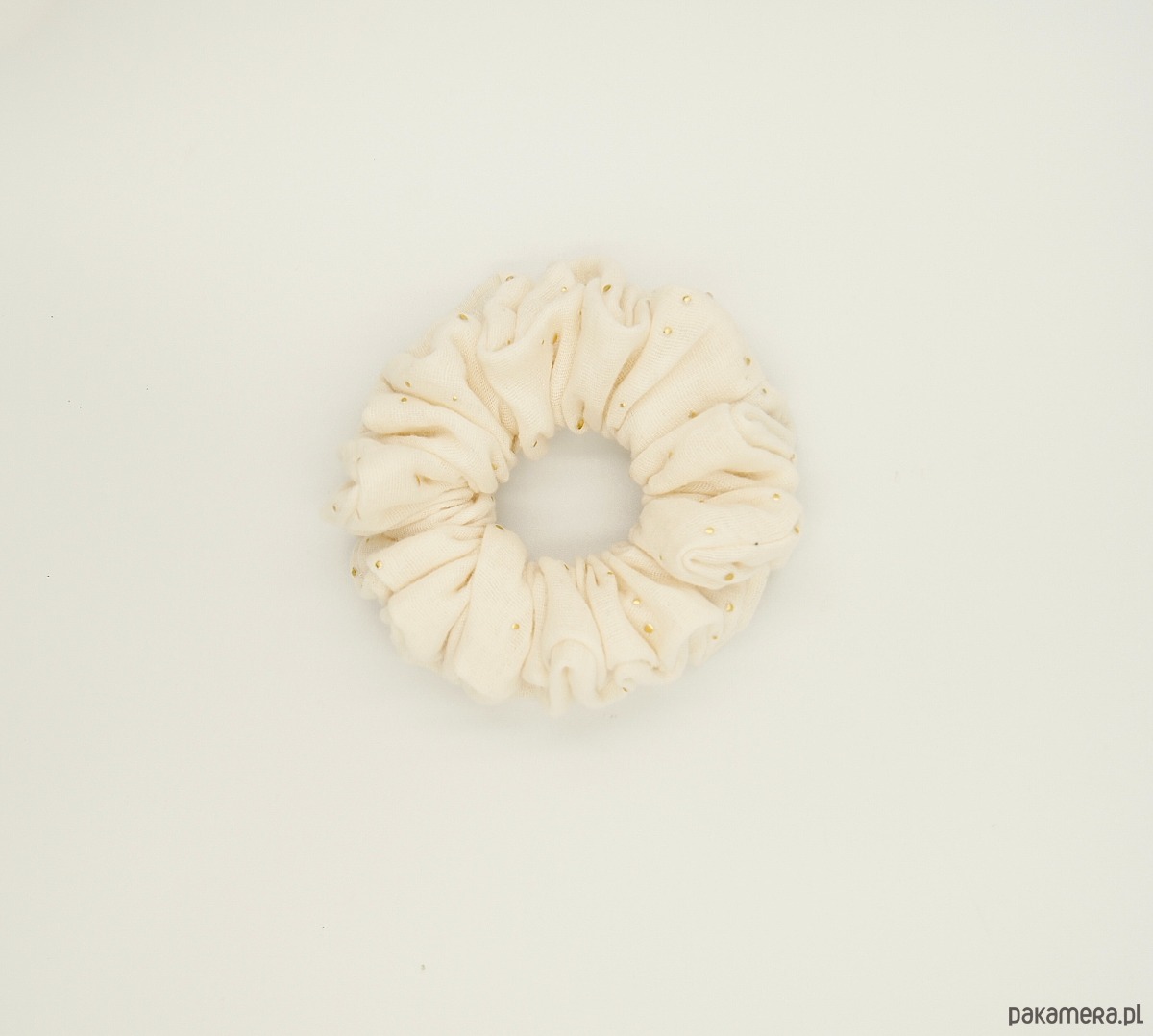 Muślinowa scruchie w kolorze ecru w zlote kropki.