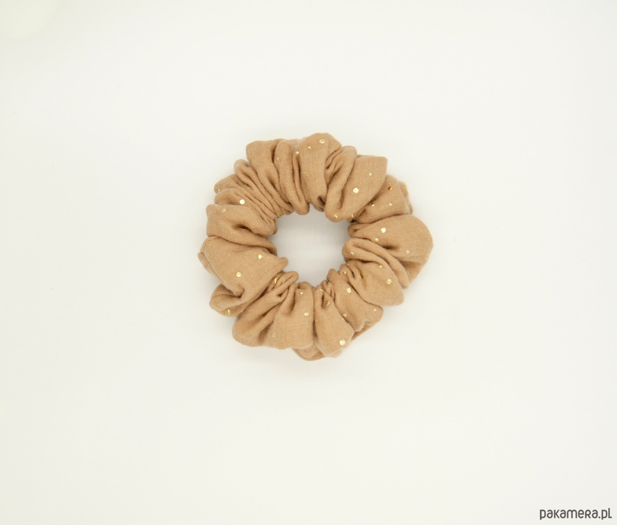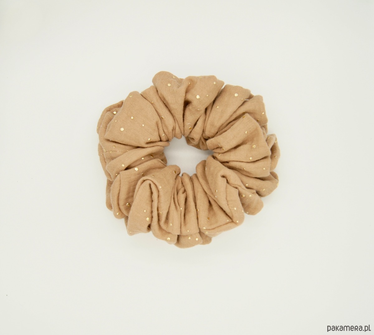 Uszyta z wysokiej jakości muslinu, który nie ciągnie i nie plącze włosów. Złote kropki dodają jej subtelnego blasku, dzięki czemu sprawdzi się zarówno na co dzień, jak i do eleganckich stylizacji. Idealny, efektowny dodatek w głębokim odcieniu beżowym.