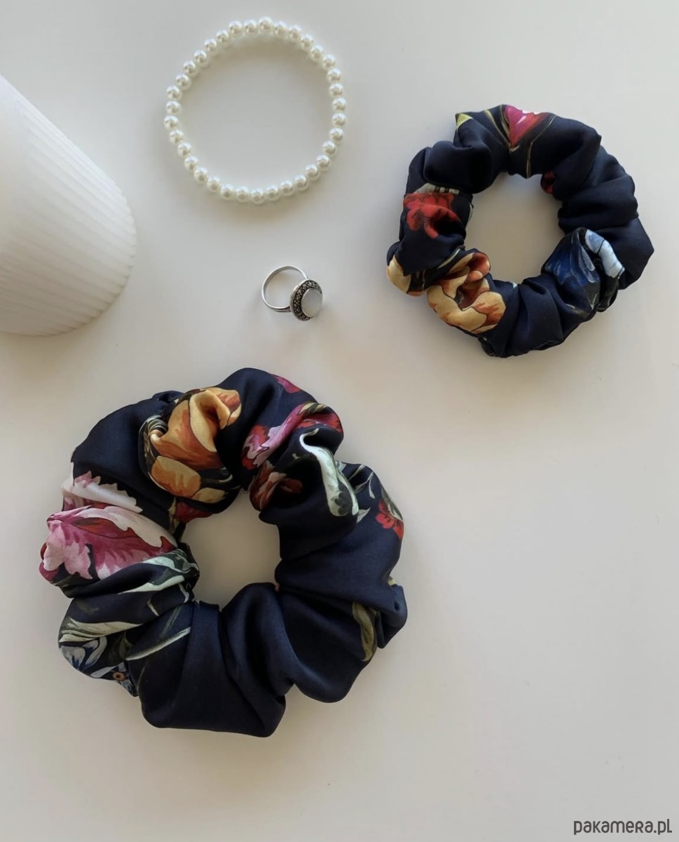 Scrunchie Navy Flores to uroczka gumka do włosów w kwiecisty wzór na granatowym tle.