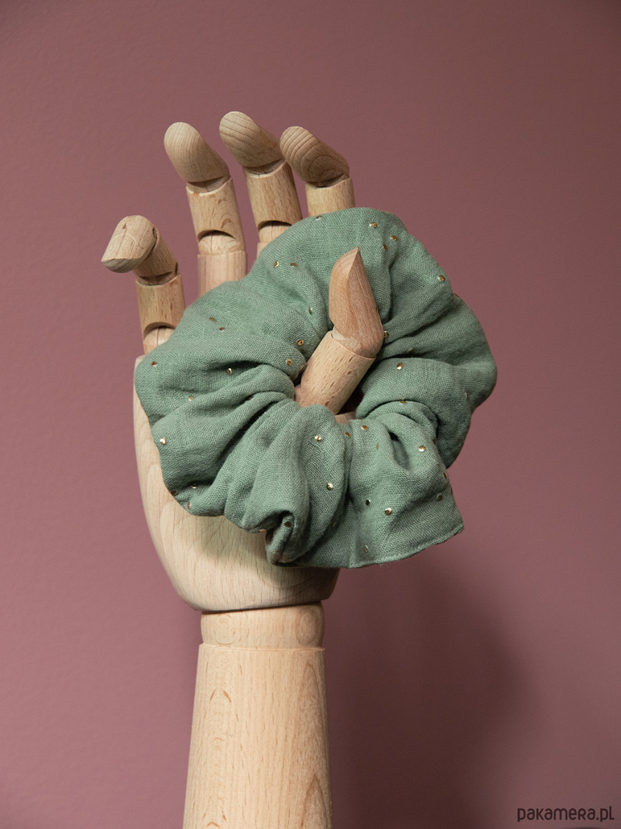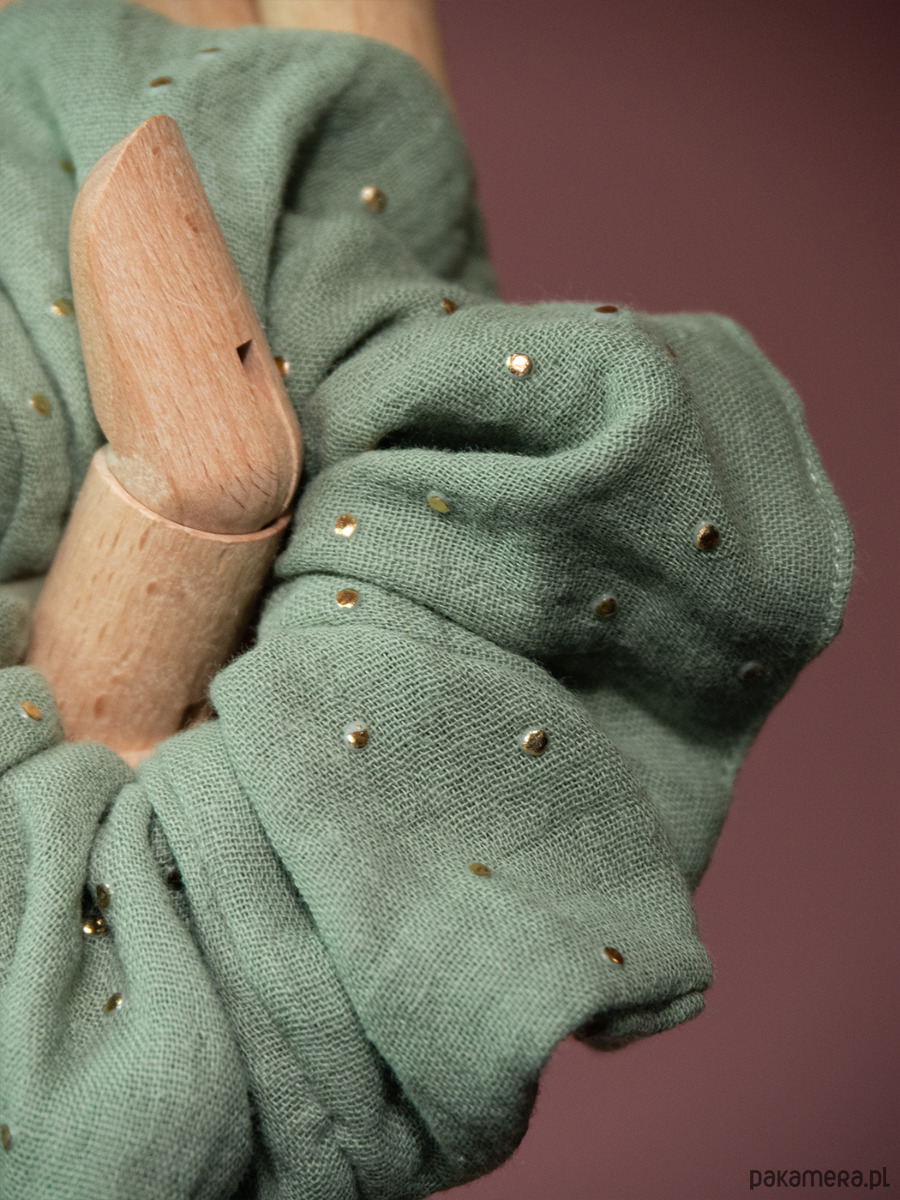 Delikatne scrunchie z muślinu bawełnianego okraszonego złotymi kropkami z czułością obejmie każdy Twój włos, ukoi jego łuski i zaopiekuje się morzem niesfornych kędziorów.