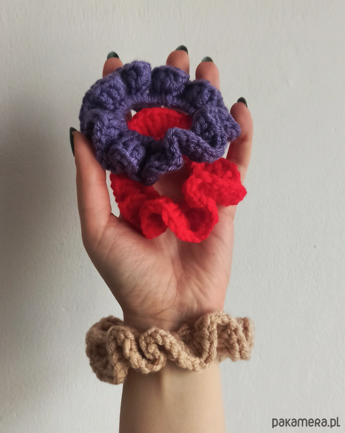 Zestaw dwóch scrunchie wykonanych na szydełku, w kolorze beżowym i fioletowym. Wykonane z grubej, przyjemnej w dotyku włóczki, świetnie trzymają włosy i są niezwykle uroczą ozdobą.
