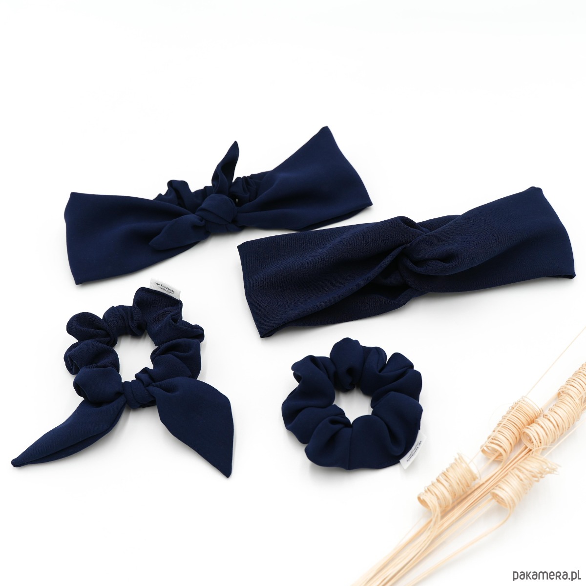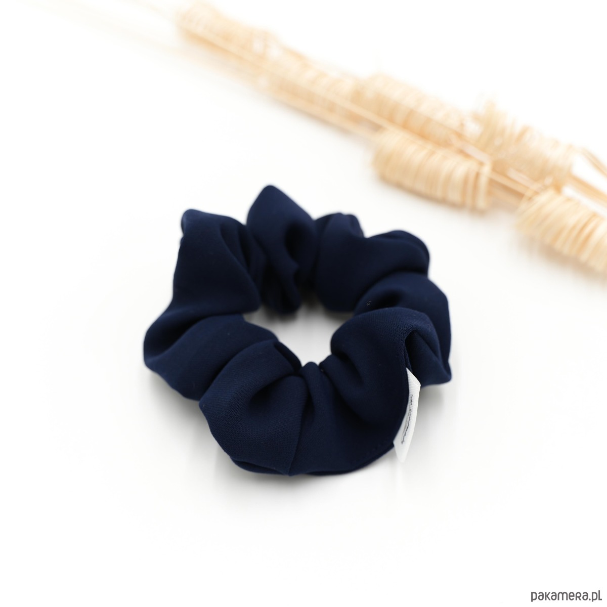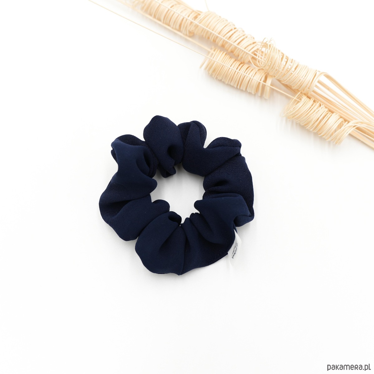 Scrunchie uszyta z delikatnej tkaniny w kolorze granatowym.