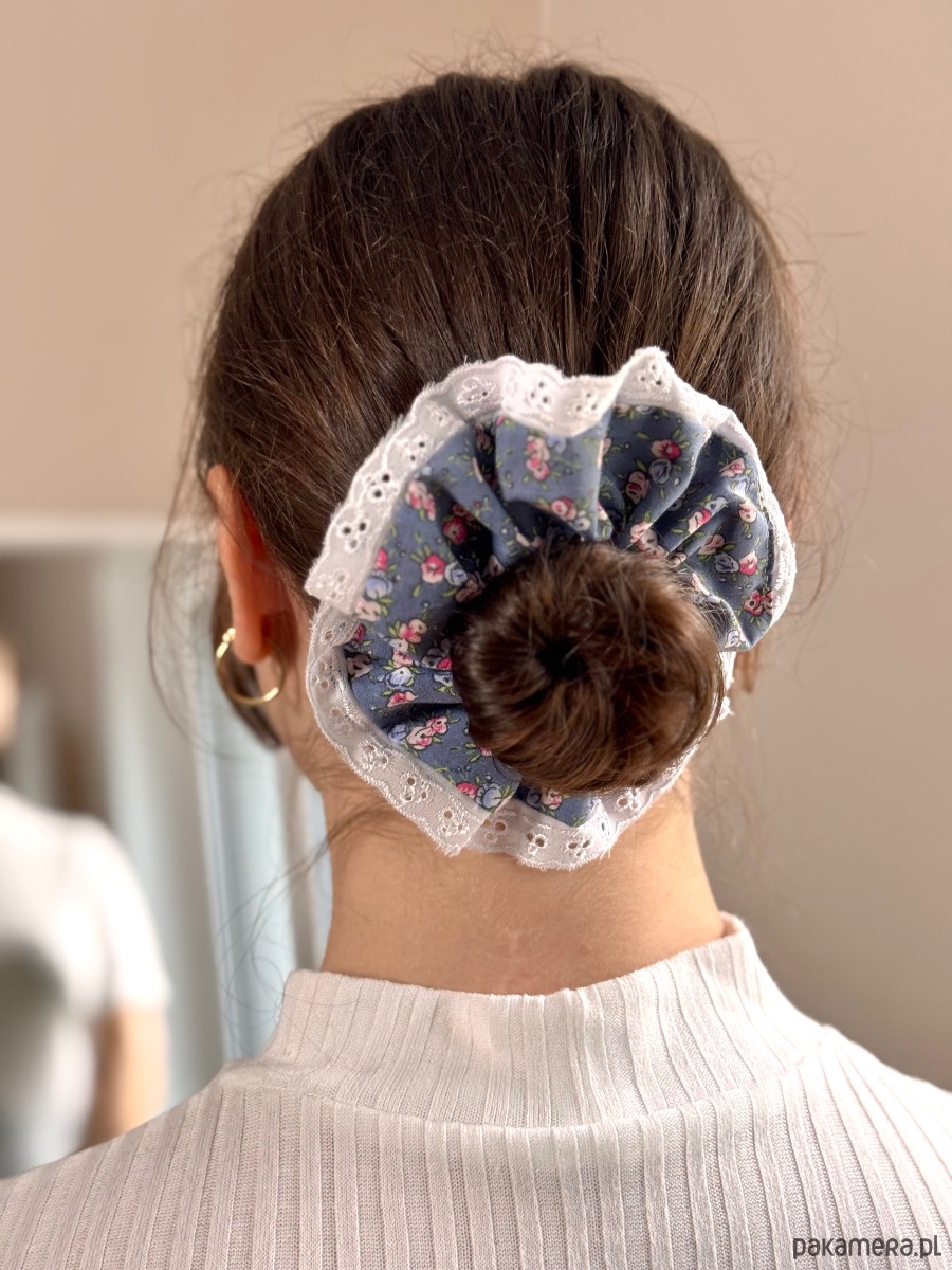 Ta wyjątkowa scrunchie to połączenie kolorowej bawełny z subtelnym brzegiem wykończonym haftem angielskim – idealny wybór dla tych, którzy cenią elegancję w codziennych stylizacjach.