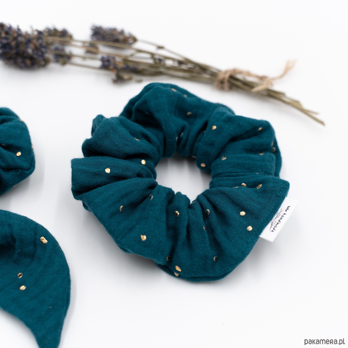 Klasyczna scrunchie uszyta z delikatnego muślinu bawełnianego ze złotymi zdobieniami.