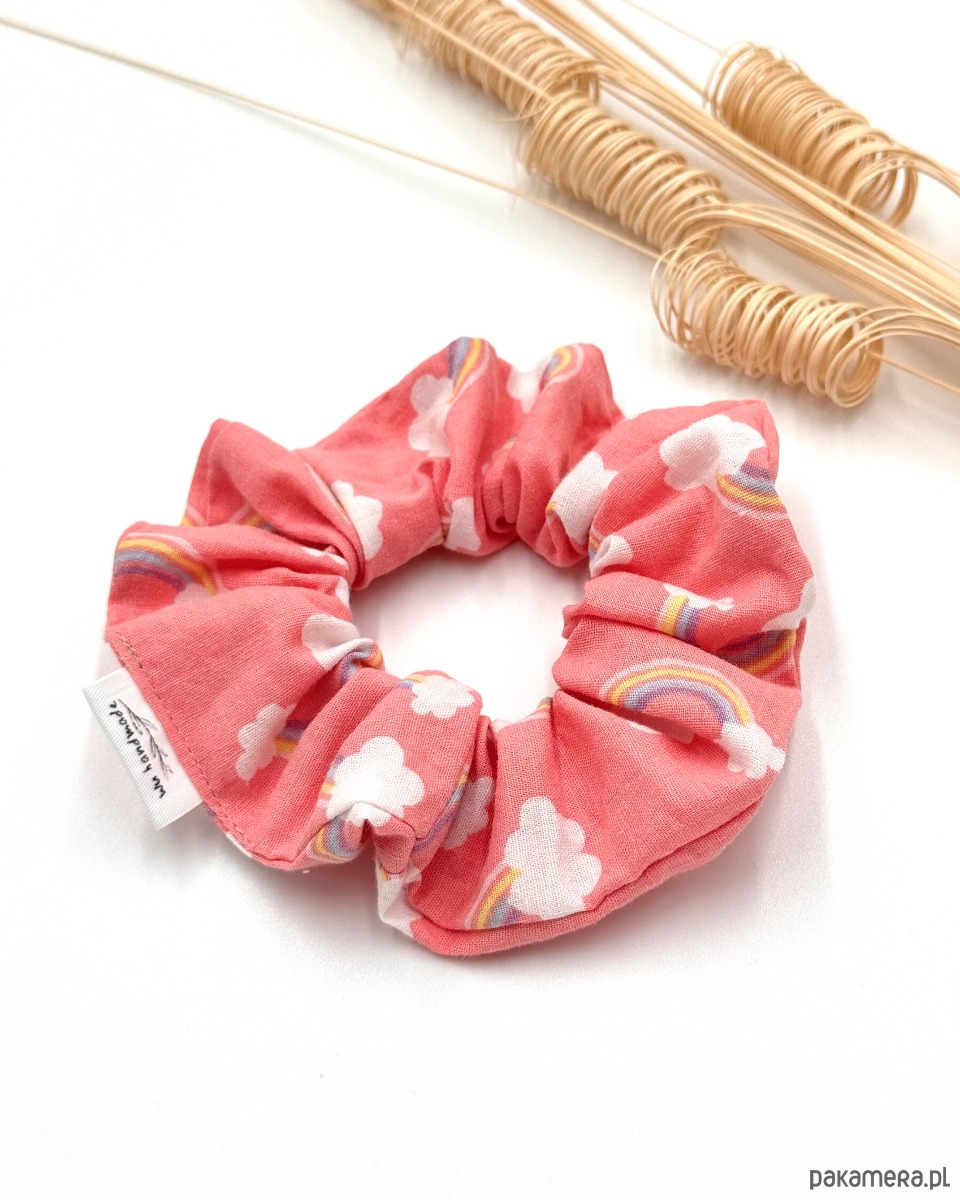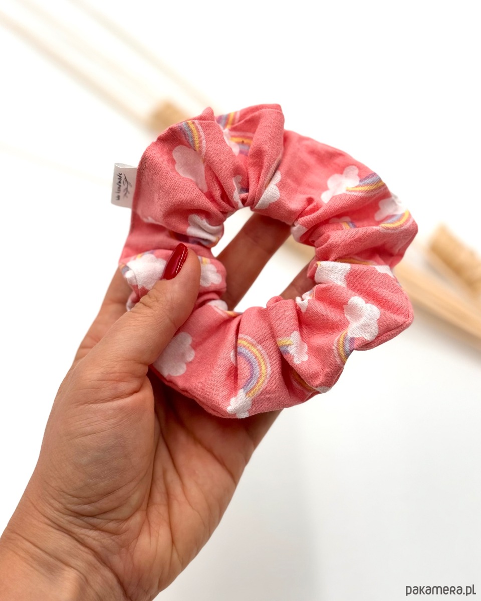 Klasyczna frotka scrunchie Rainbow. Uszyta z bawełny w kolorze jasnego różu z printem w kolorowe tęcze.