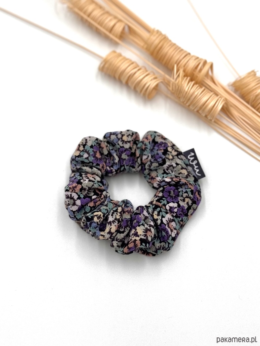 Slim scrunchie uszyta z wiskozy w kwiatowe wzory.