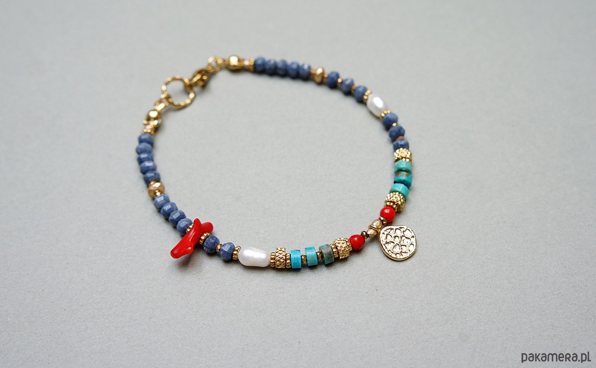 Bransoletka wykonana w całości z pozłacanej stali szlachetnej oraz naturalnych kamieni - oponki niebieskiego korala [ok. 2,5 x 4mm], talarków hematytu matowego [3 x 2mm oraz 2mm], pereł słodkowodnych [ok. 6mm], talarków naturalnego turkusu [4 x 2mm], nieregularnego korala czerwonego, fasetowanego korala czerwonego [3mm], wprzekładek z hematytu [1mm]. Całkowita długość bransoletki 18,9cm. Do kompletu można dokupić kolczyki naszyjnik przedstawione na zdjęciach.