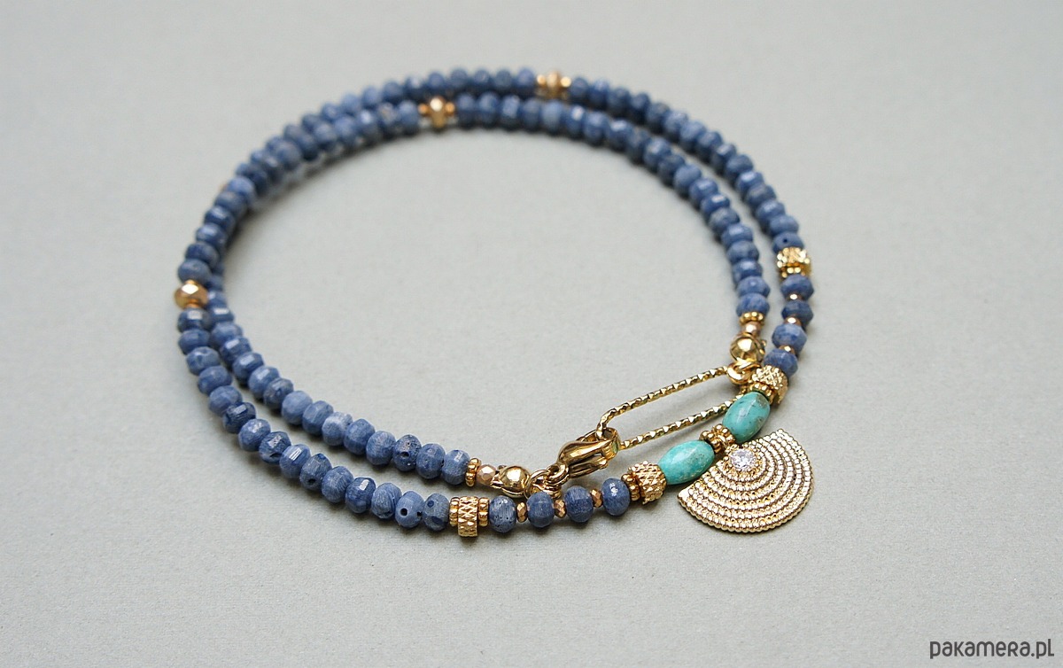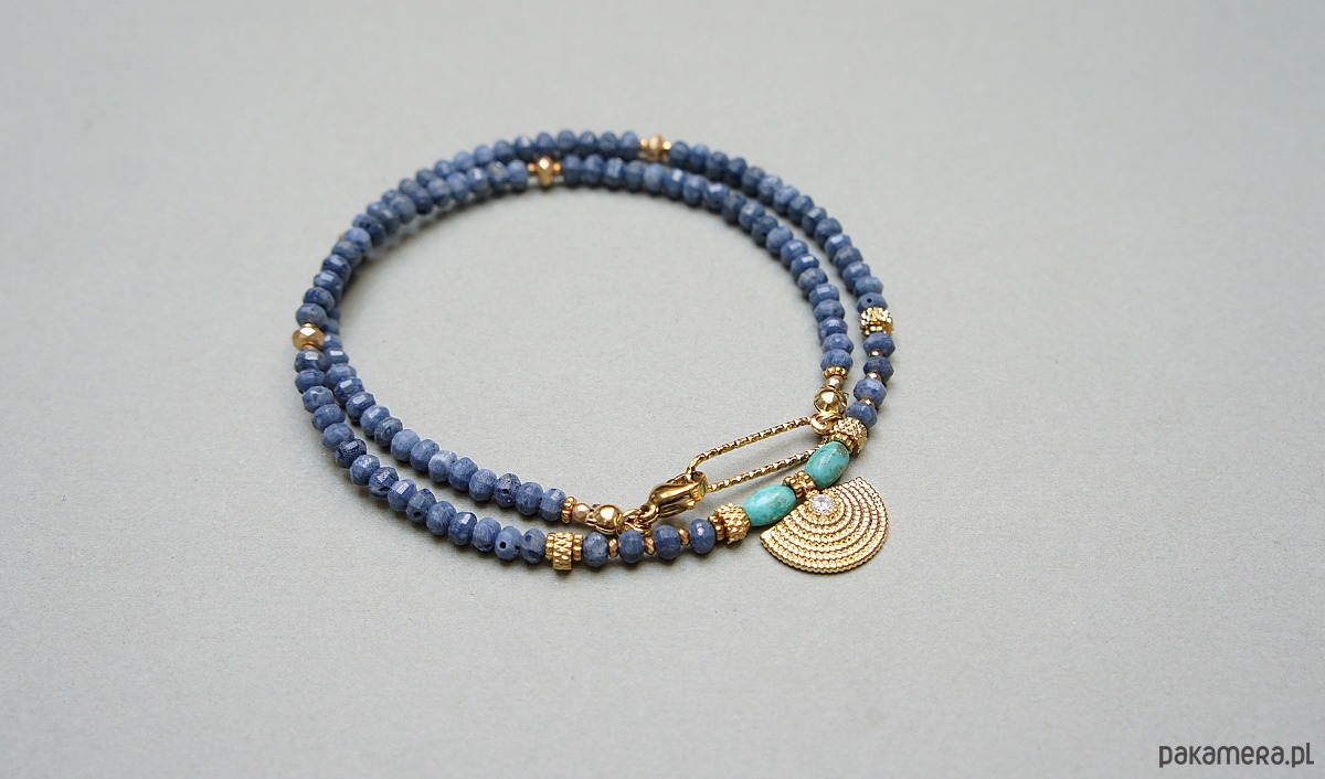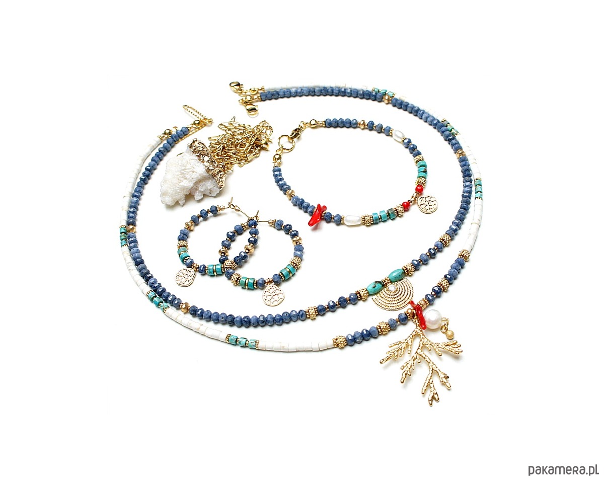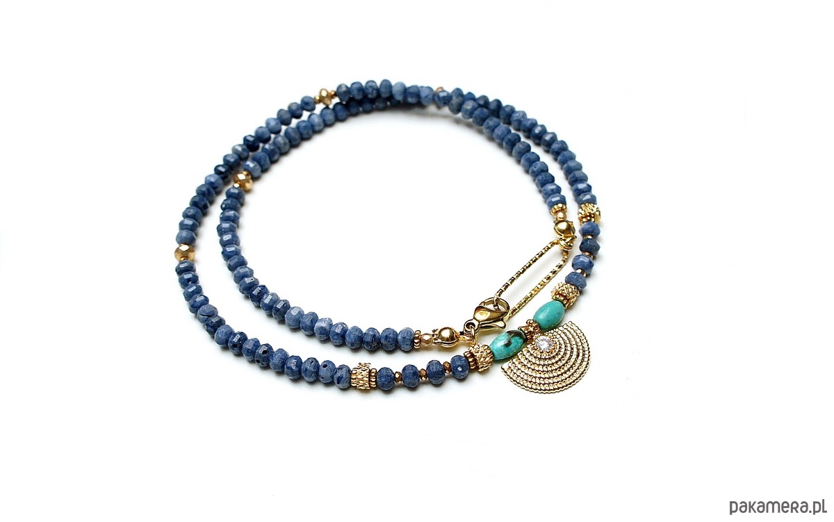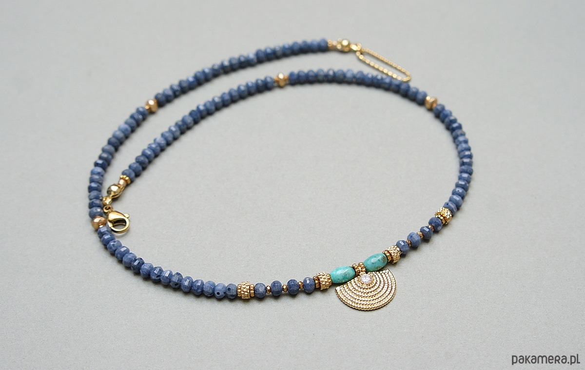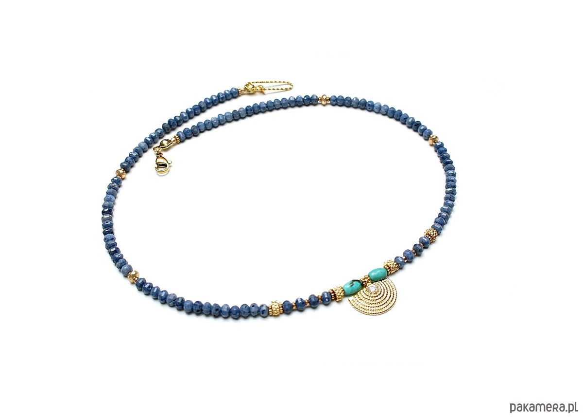 Krótki, delikatny naszyjnik wykonany w całości z pozłacanej stali szlachetnej, naturalnego niebieskiego korala fasetowanego [3 x 2mm], oliwek turkusu [6mm], hematytu fasetowany, platerowanego o matowej powłoce [3 x 2mm], przekładek z hematytu [1mm], zawieszki z miedzi rodowanej z osadzoną cyrkonią. Naszyjnik o długości 42cm. Do kompletu można dokupić bransoletkę i kolczyki przedstawione na zdjęciach. Biżuteria ozdobnie zapakowana.