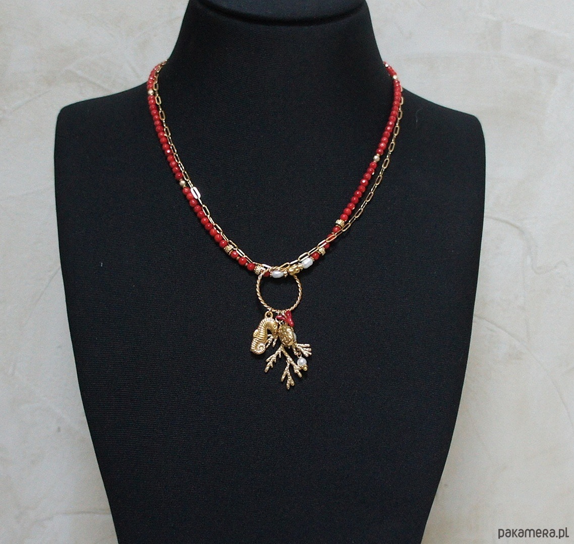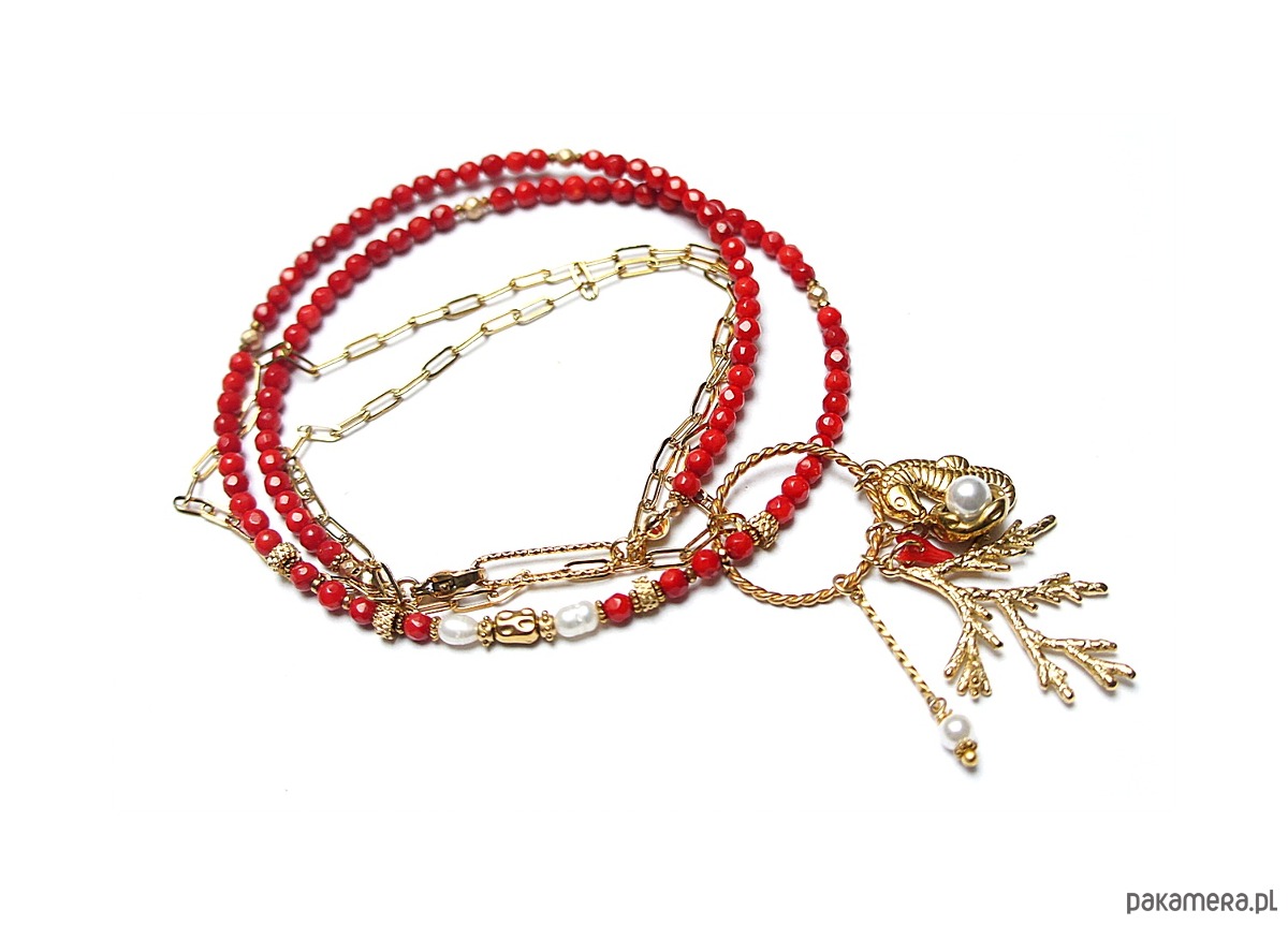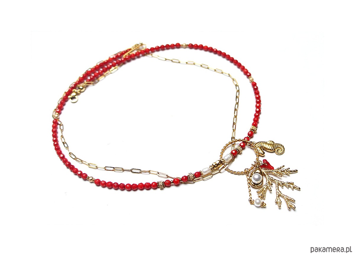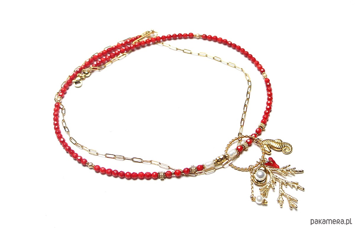 Krótki, delikatny naszyjnik wykonany w całości z pozłacanej stali szlachetnej, naturalnego czerwonego koral fasetowanego [4mm], hematytu fasetowany, platerowanego o matowej powłoce [3mm], pereł słodkowodnych [ok. 6-7mm], przekładek z hematytu [1mm], zawieszki z naturalnej perły [śr. 12mm], zawieszki z naturalnego, czerwonego korala. Naszyjnik o długości 48cm. Biżuteria ozdobnie zapakowana.