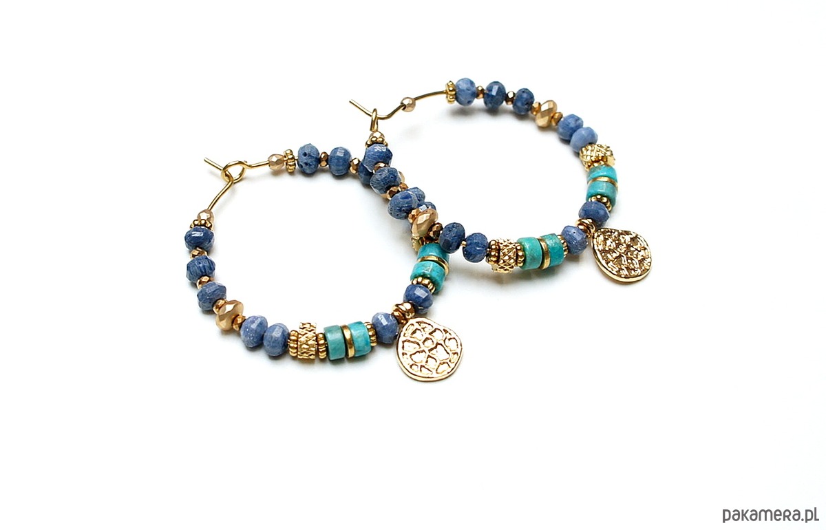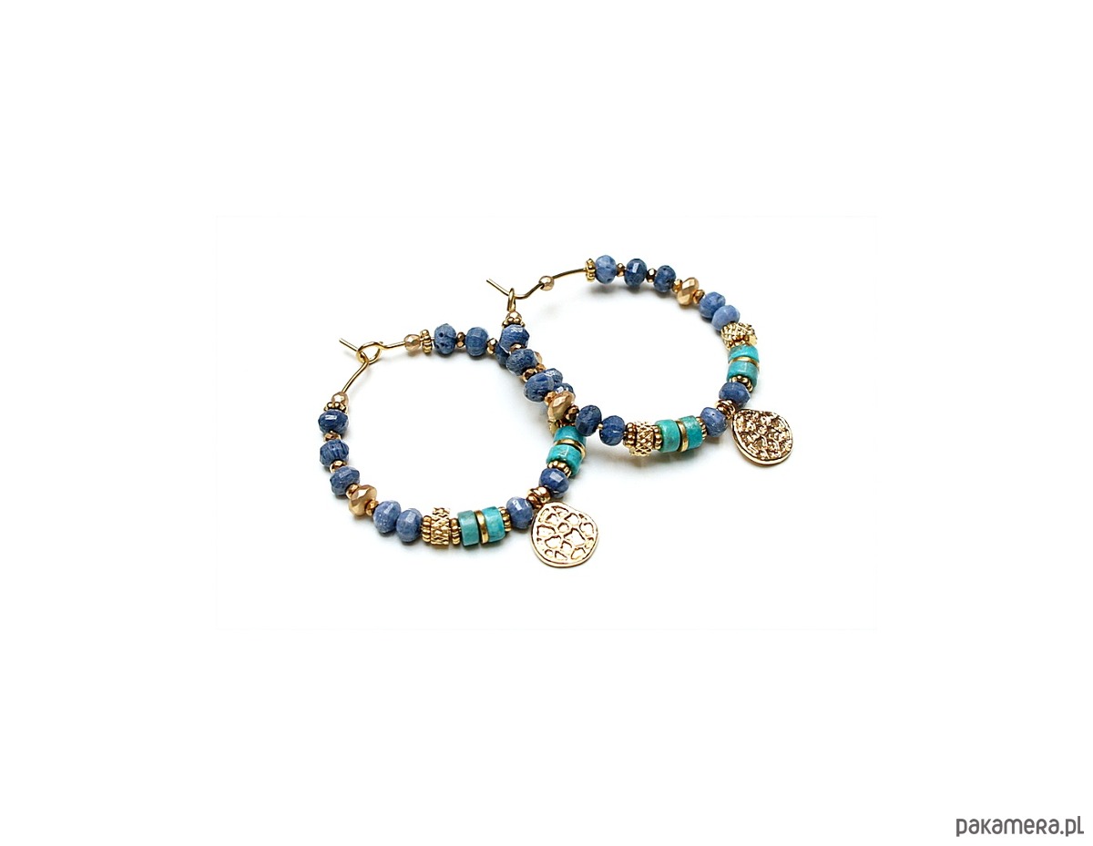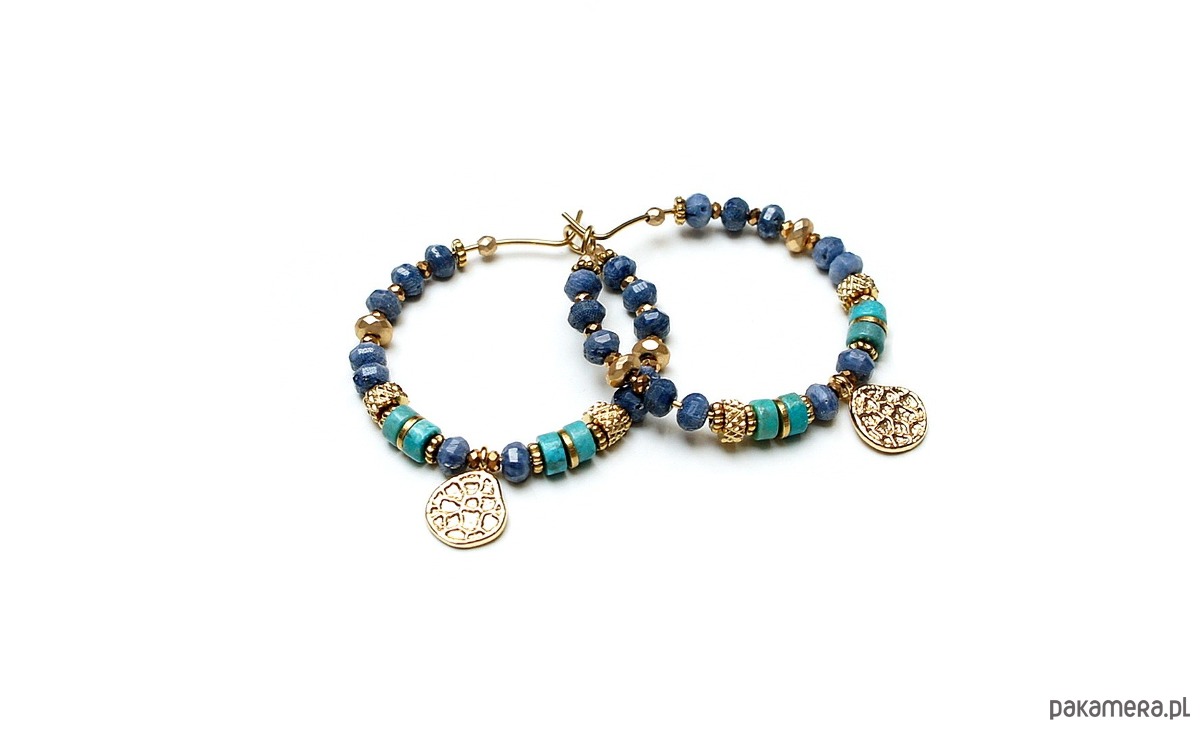 Kolczyki wykonane ze stali szlachetnej pokrytej zlotem, oponek naturalnego koralu niebieskiego [3 x 2mm], talarków naturalnego turkusu [4 x 2mm], hematytu fasetowanego, platerowanego [3 x 2mm oraz 2mm], przekładek z hematytu [1mm] Średnica kół 30mm. Biżuteria ozdobnie zapakowana. Do kompletu można dokupić bransoletkę i naszyjnik przedstawione na zdjęciach.
