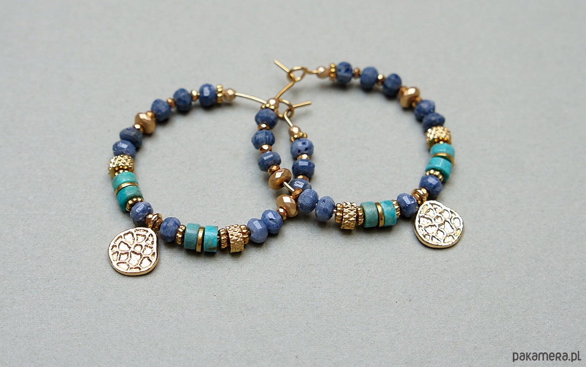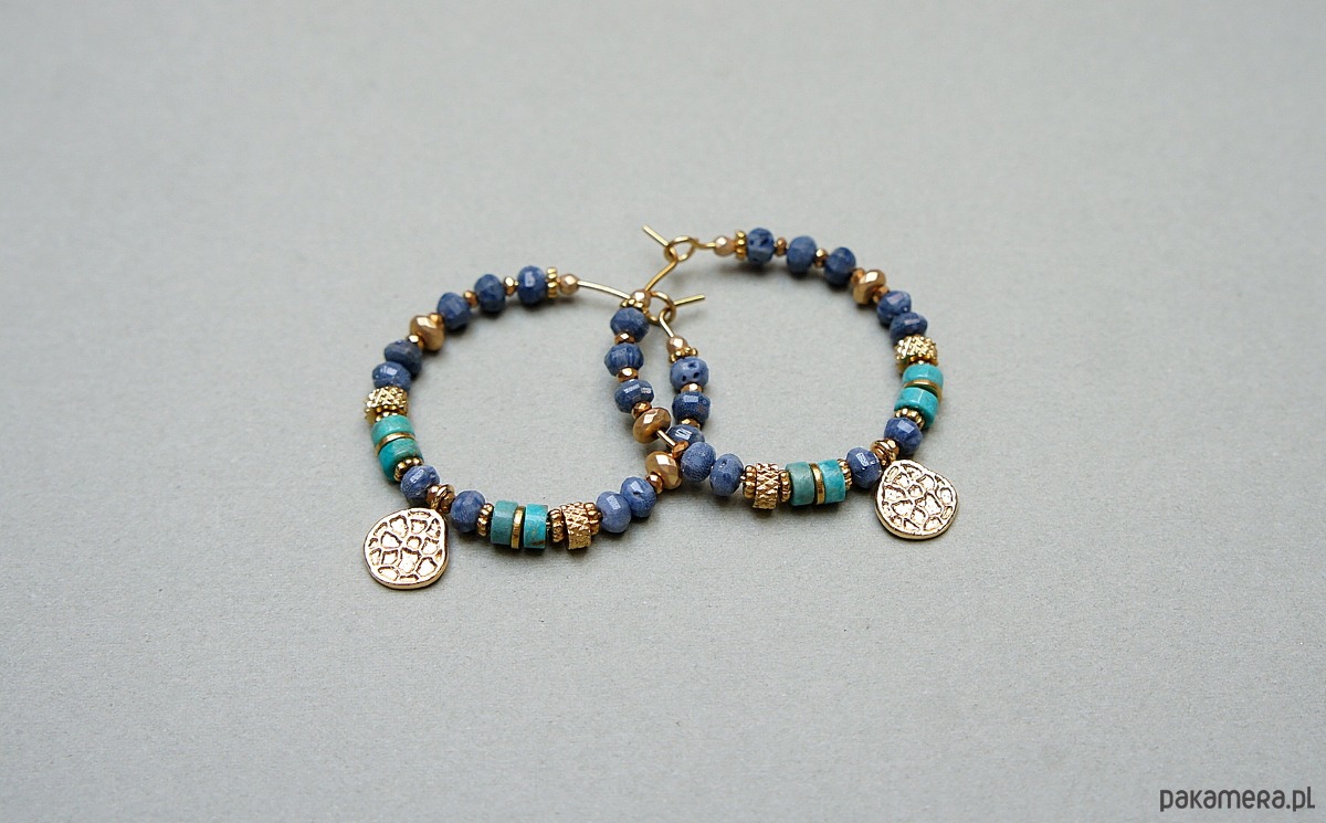 Kolczyki wykonane ze stali szlachetnej pokrytej zlotem, oponek naturalnego koralu niebieskiego [3 x 2mm], talarków naturalnego turkusu [4 x 2mm], hematytu fasetowanego, platerowanego [3 x 2mm oraz 2mm], przekładek z hematytu [1mm] Średnica kół 30mm. Biżuteria ozdobnie zapakowana. Do kompletu można dokupić bransoletkę i naszyjnik przedstawione na zdjęciach.