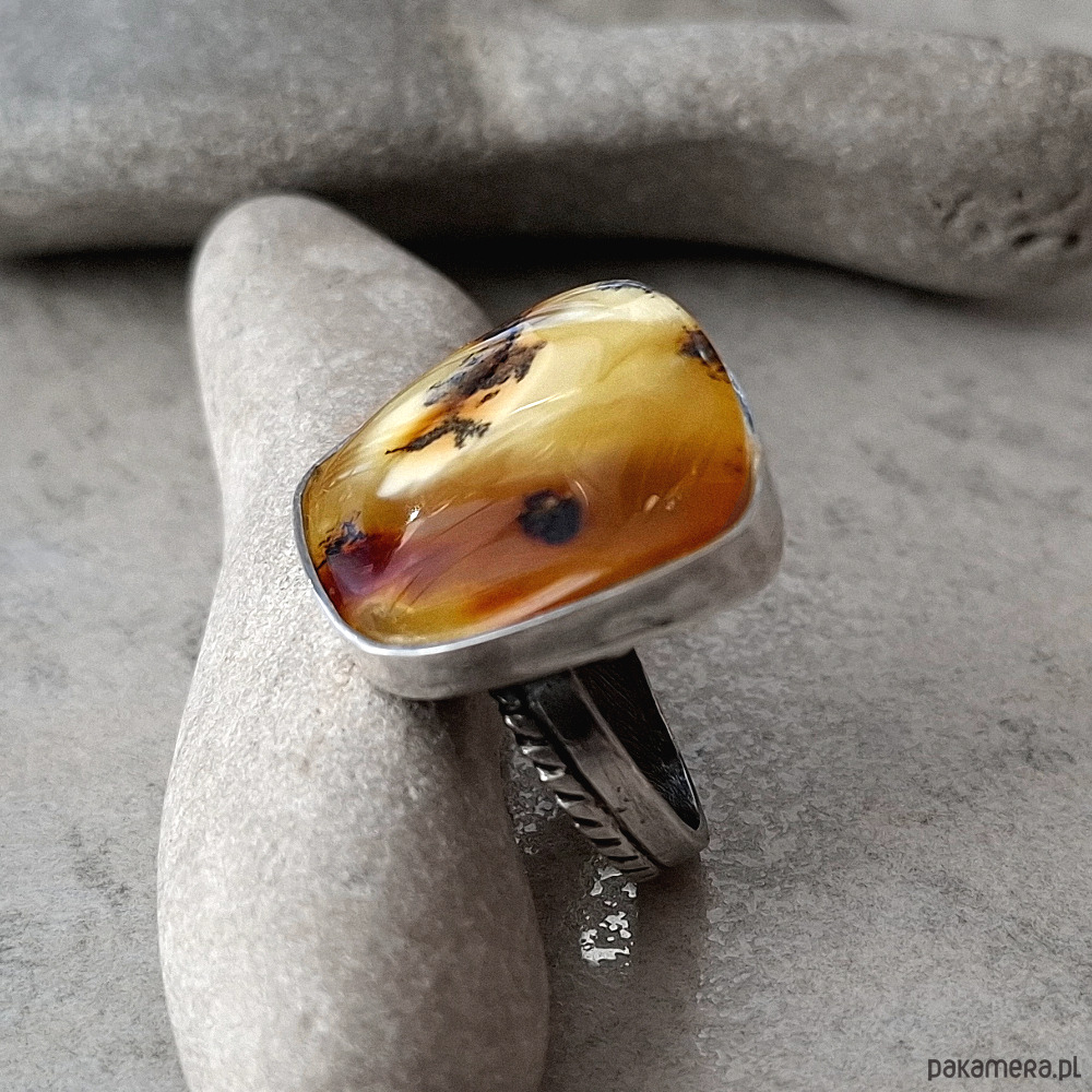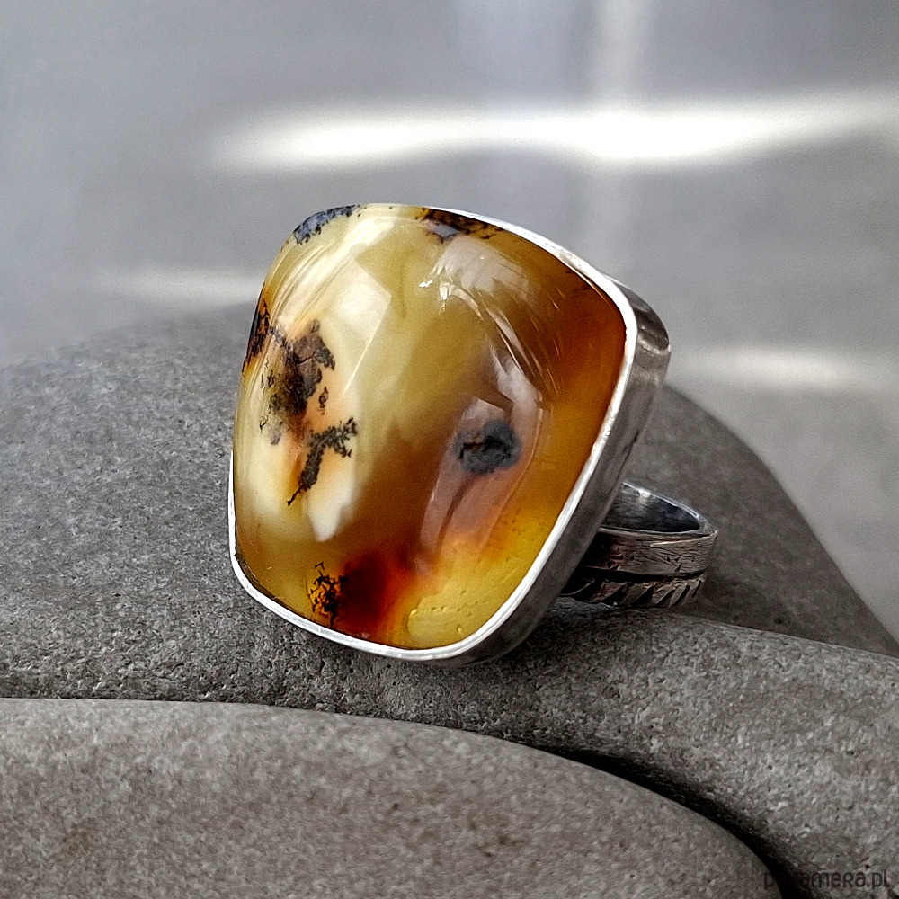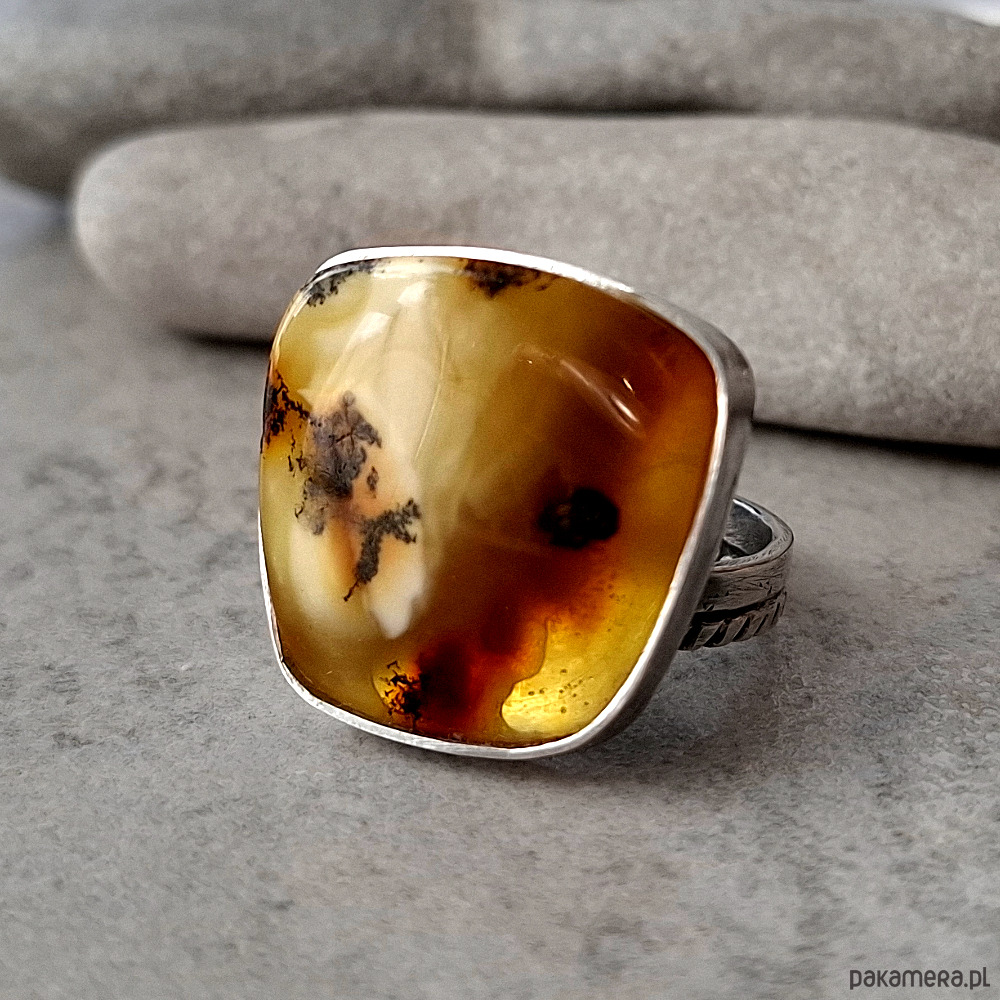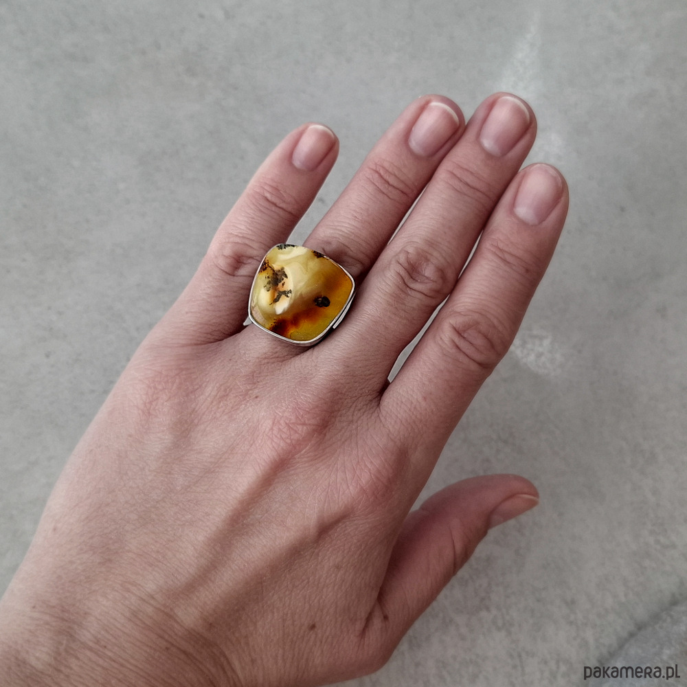 Okazały, przykuwający wzrok pierścień, wykonany w całości ręcznie ze srebra próby 930 i 999. Ozdobiony naturalnym bursztynem bałtyckim o unikalnej barwie. Regulowana obrączka zapewnia dopasowanie do każdego rozmiaru. Wymiary korony pierścionka: ok. 23x23 mm w najszerszym miejscu. Biżuteria zostanie ozdobnie zapakowana.