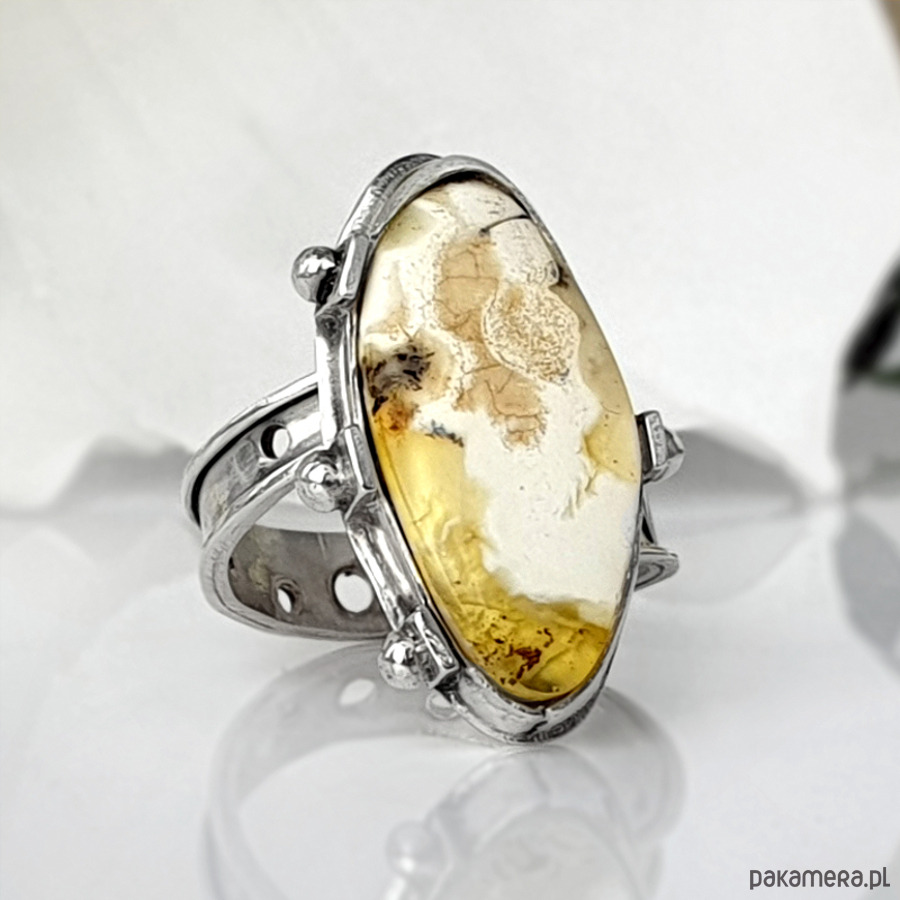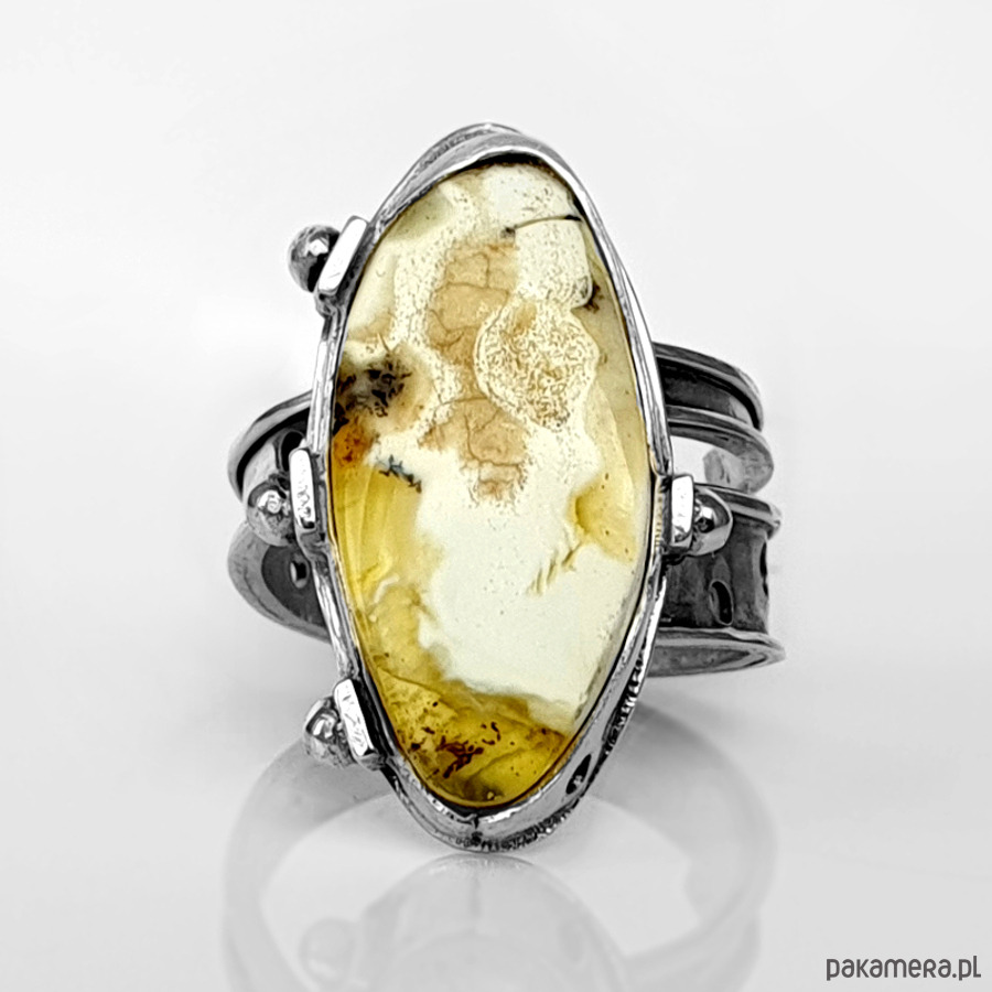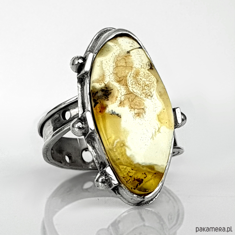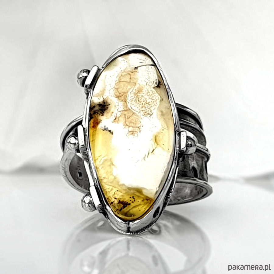 Okazały, przykuwający wzrok pierścień, wykonany w całości ręcznie ze srebra próby 930 i 999. Ozdobiony naturalnym bursztynem bałtyckim o unikalnej białej barwie. Regulowana obrączka z okrągłymi perforacjami oplata otwartą wstęgą palec, zapewniając regulację do każdego rozmiaru. Wymiary korony pierścionka: ok. 15x28 mm. Biżuteria zostanie ozdobnie zapakowana.