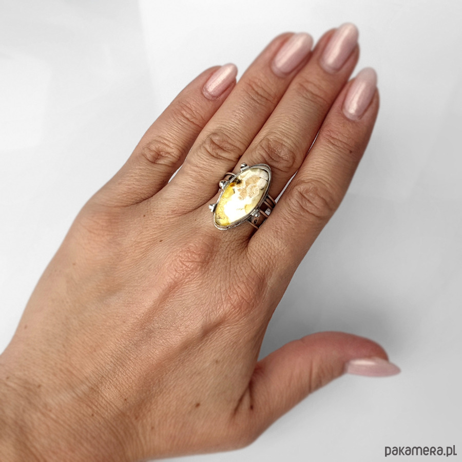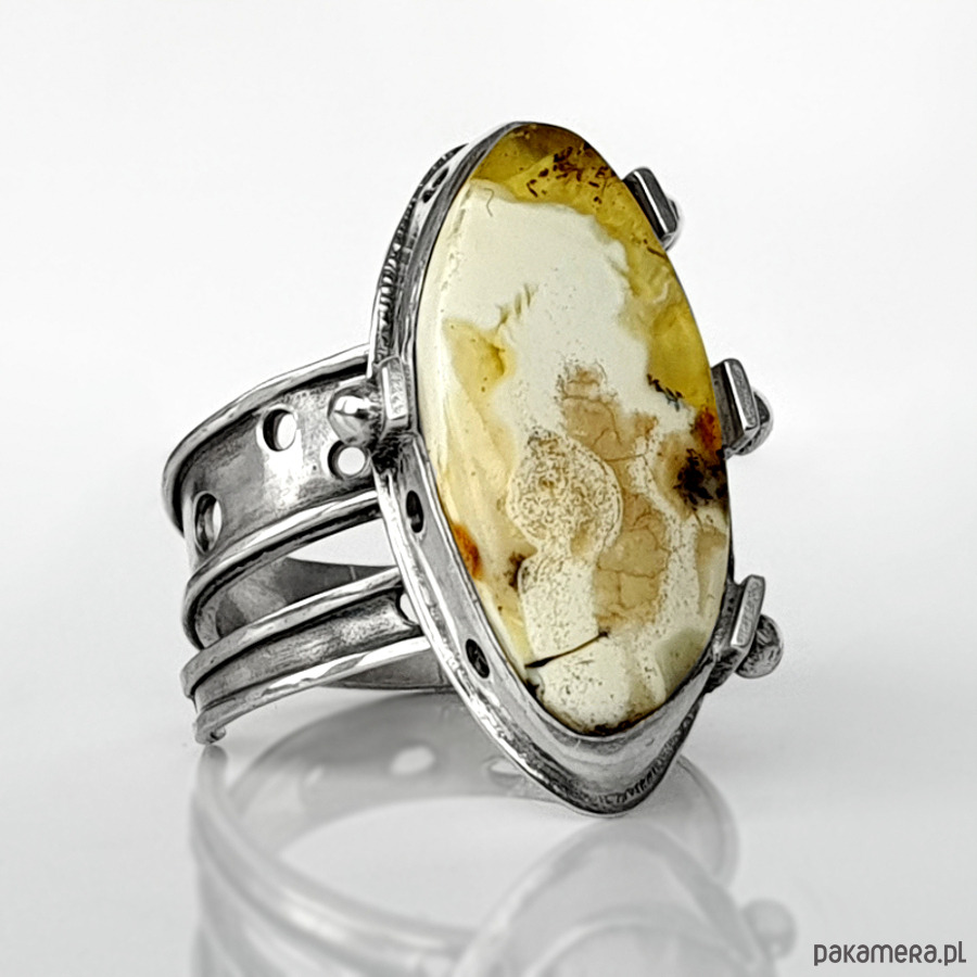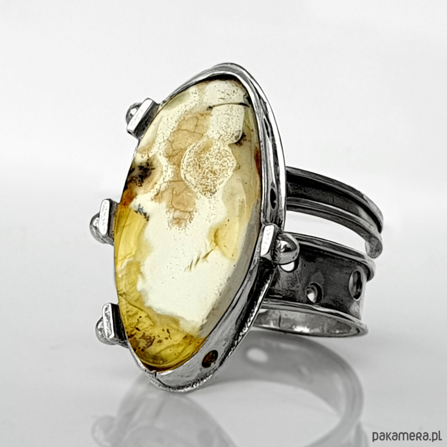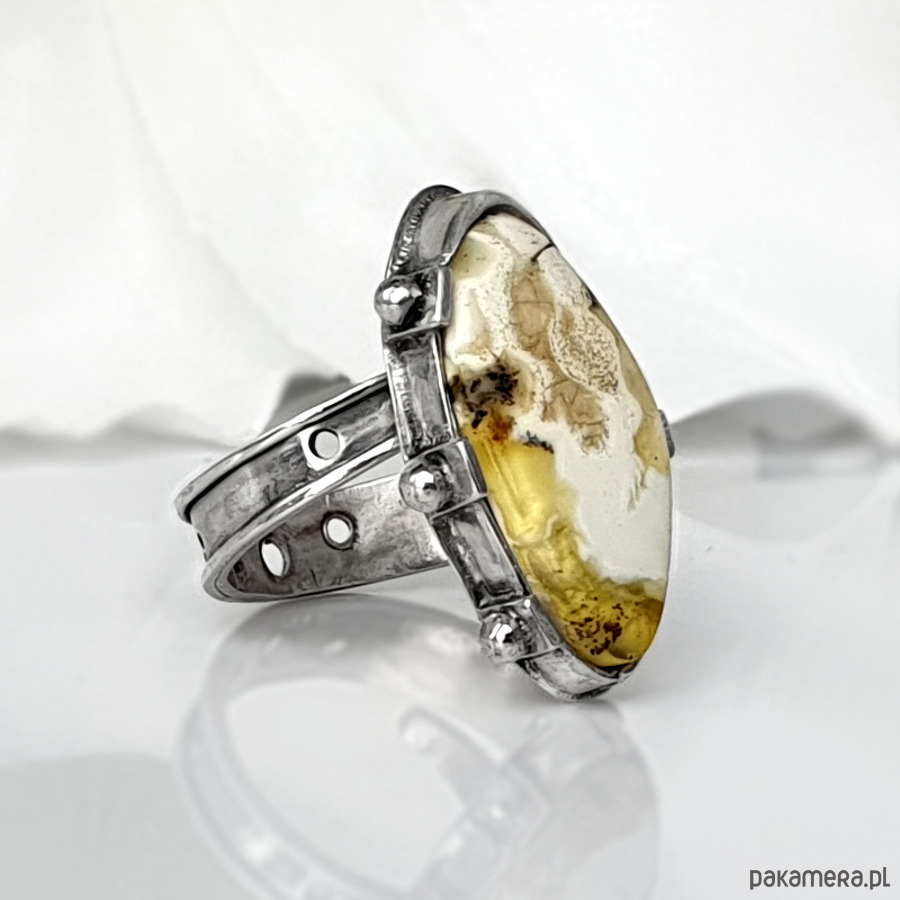 Okazały, przykuwający wzrok pierścień, wykonany w całości ręcznie ze srebra próby 930 i 999. Ozdobiony naturalnym bursztynem bałtyckim o unikalnej białej barwie. Regulowana obrączka z okrągłymi perforacjami oplata otwartą wstęgą palec, zapewniając regulację do każdego rozmiaru. Wymiary korony pierścionka: ok. 15x28 mm. Biżuteria zostanie ozdobnie zapakowana.