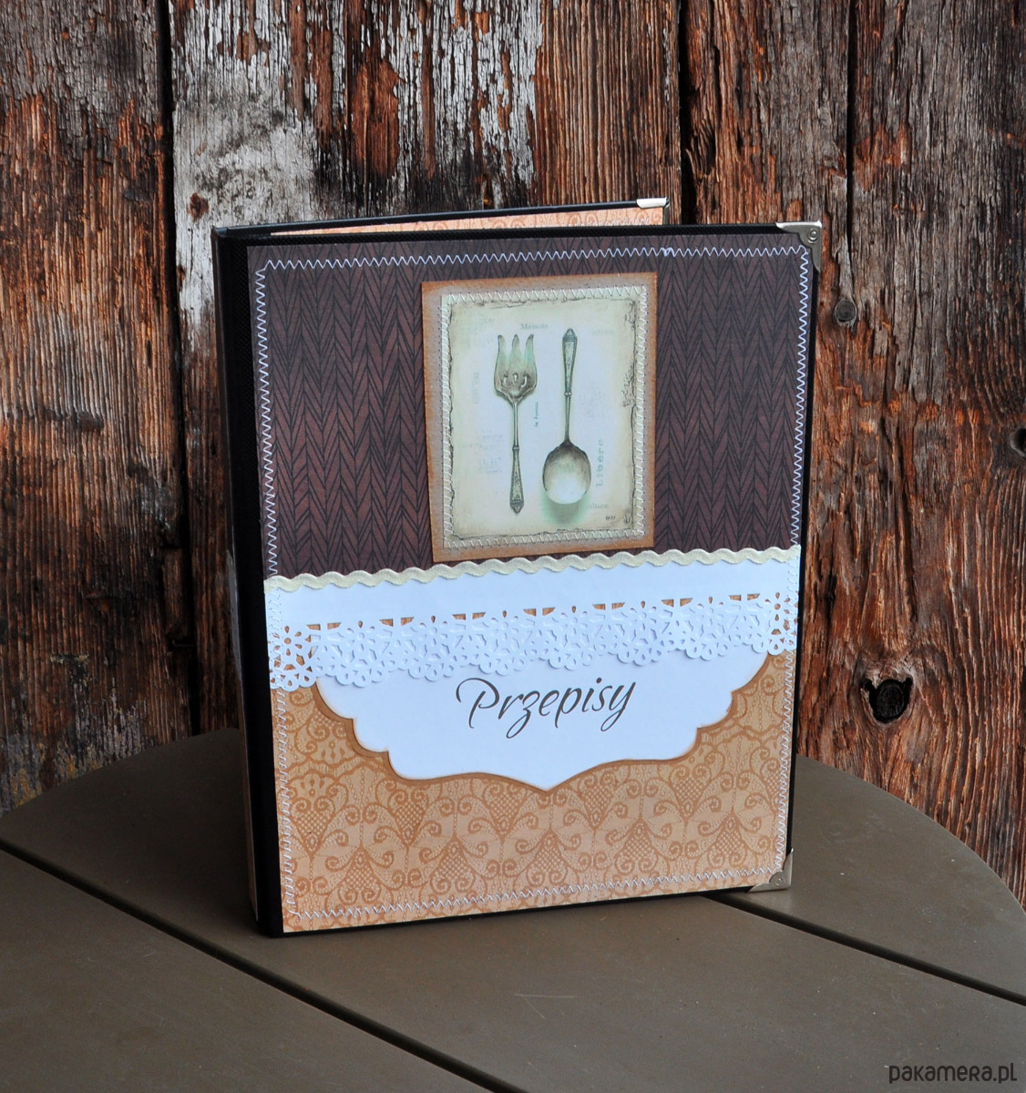 Piękny i wyjątkowy segregator na przepisy kulinarne w stylu retro; ozdobiony metodą scrapbookingu; przeszywany maszynowo, postarzany; może stanowić oryginalny prezent; rozmiar A4; zapraszam