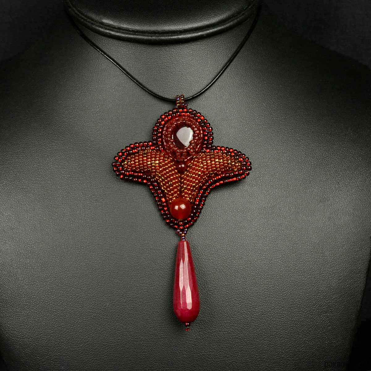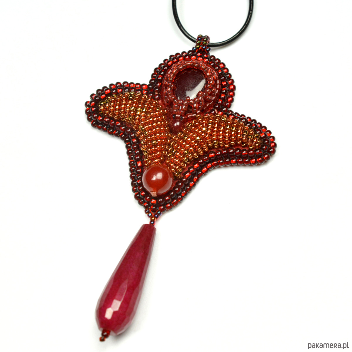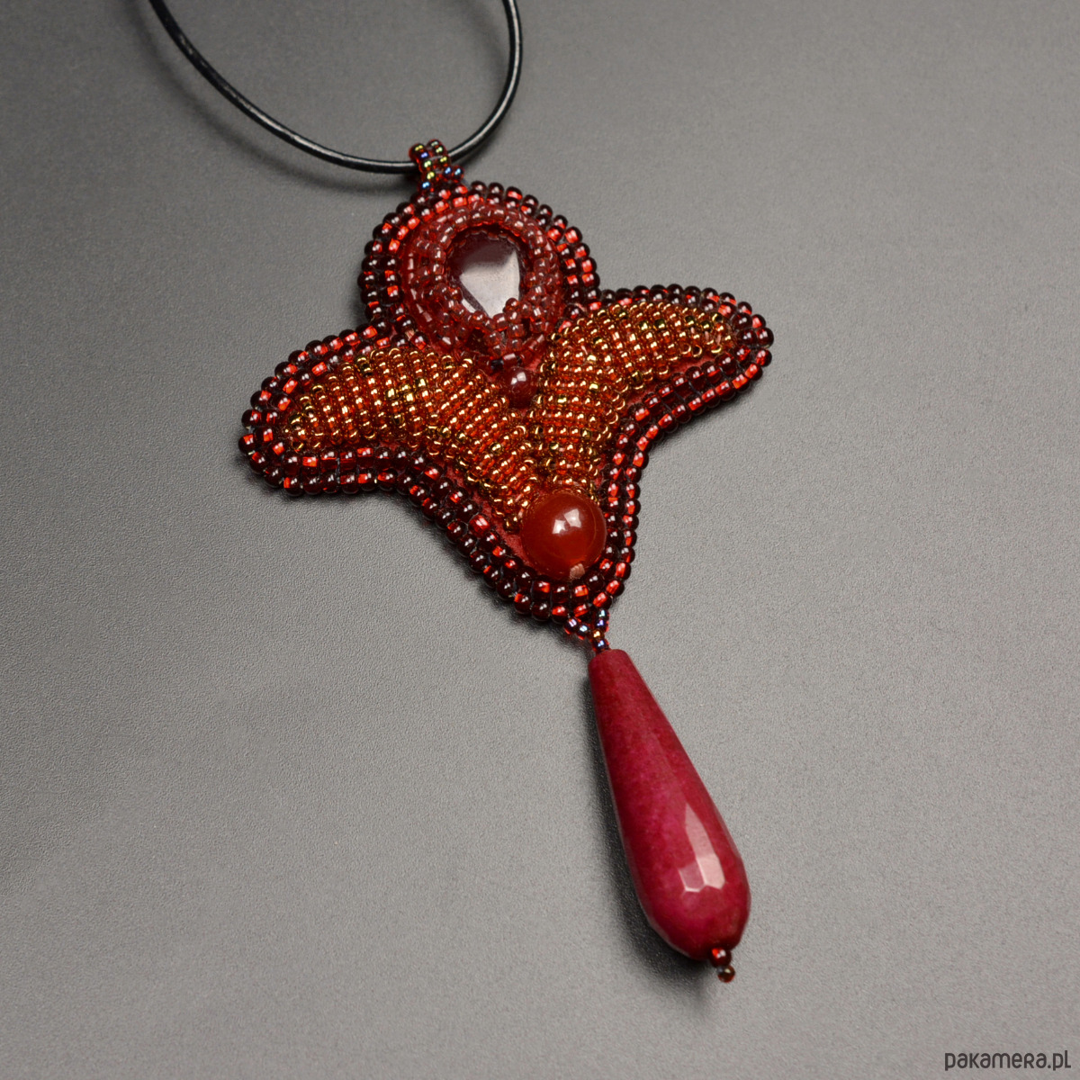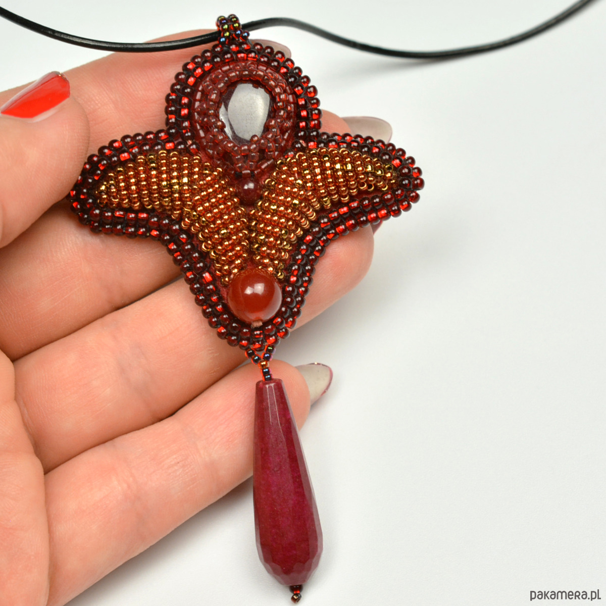 Jego serce stanowi bordowy jadeit - kaboszon i długa, fasetowana kropla, które oplotłam najwyższej jakości japońskimi koralikami Toho i Miyuki w odcieniach czerwieni złamanej odrobiną brązu. Całości dopełniają dwie gładkie kule karneolu.