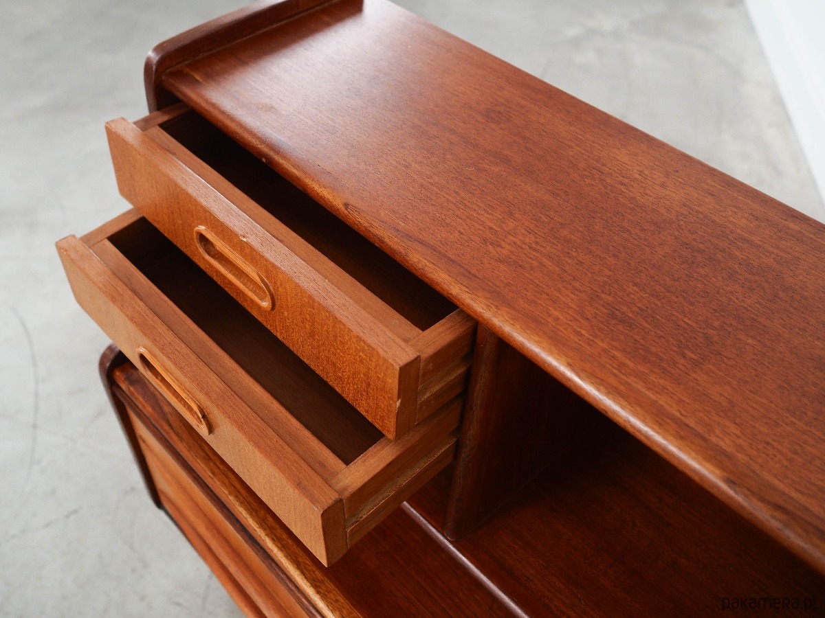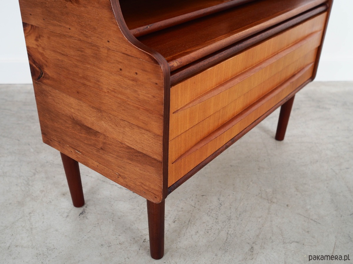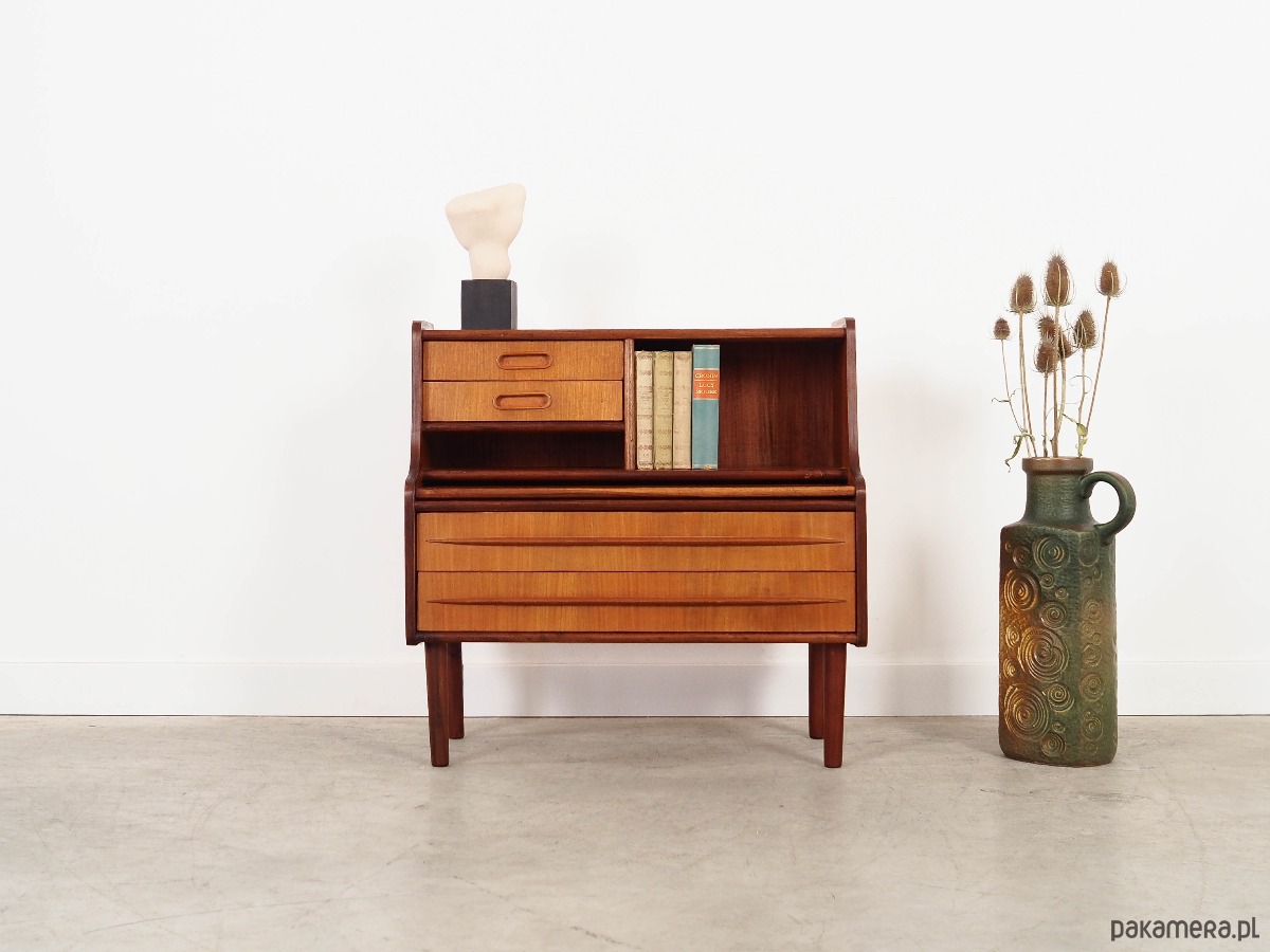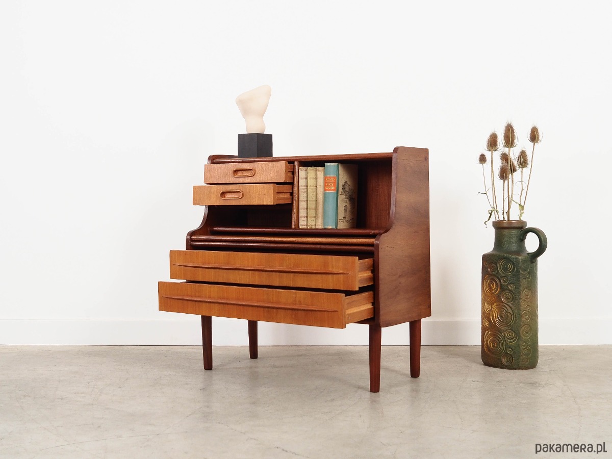 Konstrukcja pokryta jest fornirem tekowym. Nogi zostały wykonane z litego drewna. Powierzchnia po odświeżeniu. Wewnątrz przestrzeń została wypełniona czterema pojemnymi szufladami. Sekretarzyk jest jednym z najbardziej uniwersalnych mebli, jakie zostały zaprojektowane w historii skandynawskiego wzornictwa. Może pełnić funkcję komody, dzięki czemu idealnie spełni swoją rolę jako szafka na dokumenty, zabawki w pokoju dziecięcym lub jako bieliźniarka w sypialni. Wysuwany blat pozwala na używanie sekretarzyka jako biurka. Ponadto jego ponadczasowy design nada charakteru każdemu wnętrzu, w którym będzie użytkowany. Sprawdzi się idealnie jako funkcjonalny mebel dla dziecka, zachęcając do nauki i kreatywnej zabawy.