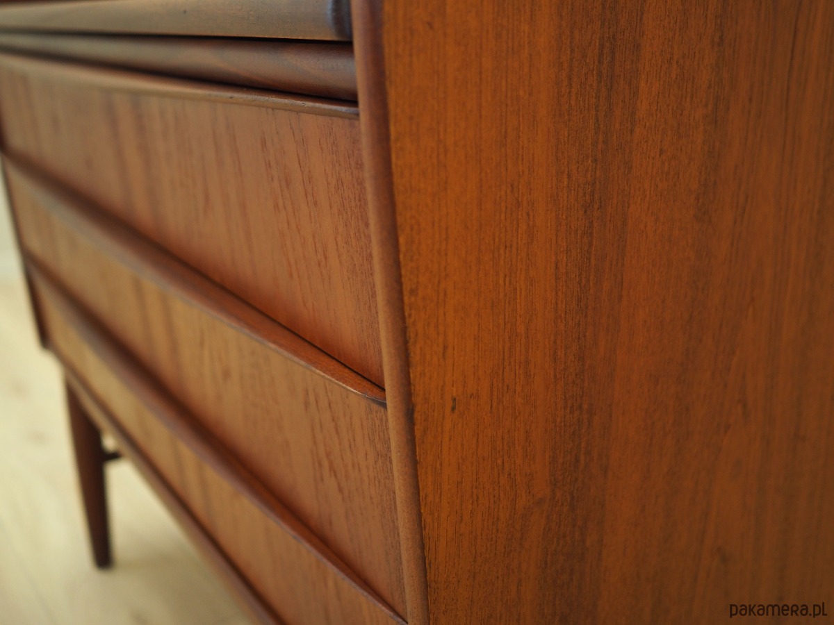 Konstrukcja pokryta jest fornirem tekowym. Nogi zostały wykonane z litego drewna. Powierzchnia po odświeżeniu. Wewnątrz przestrzeń została wypełniona sześcioma pojemnymi szufladami. Sekretarzyk jest jednym z najbardziej uniwersalnych mebli, jakie zostały zaprojektowane w historii skandynawskiego wzornictwa. Może pełnić funkcję komody, dzięki czemu idealnie spełni swoją rolę jako szafka na dokumenty, zabawki w pokoju dziecięcym lub jako bieliźniarka w sypialni. Wysuwany blat pozwala na używanie sekretarzyka jako biurka. Ponadto jego ponadczasowy design nada charakteru każdemu wnętrzu, w którym będzie użytkowany. Dodatkowym atutem jest praktyczna szafeczka oraz lustro, dzięki któremu sekretarzyk z powodzeniem może pełnić funkcję toaletki.